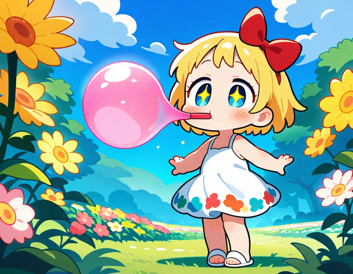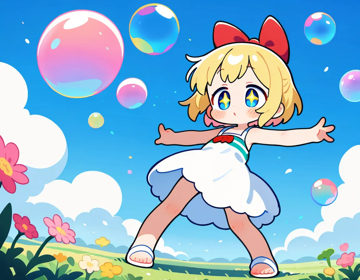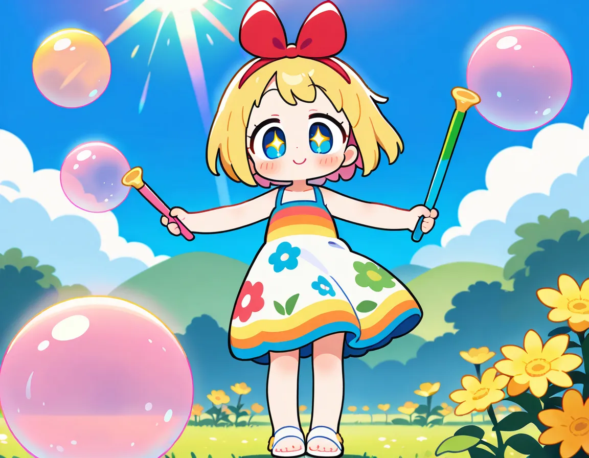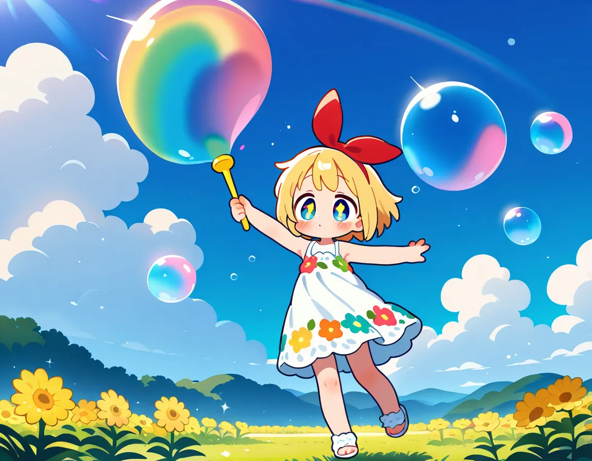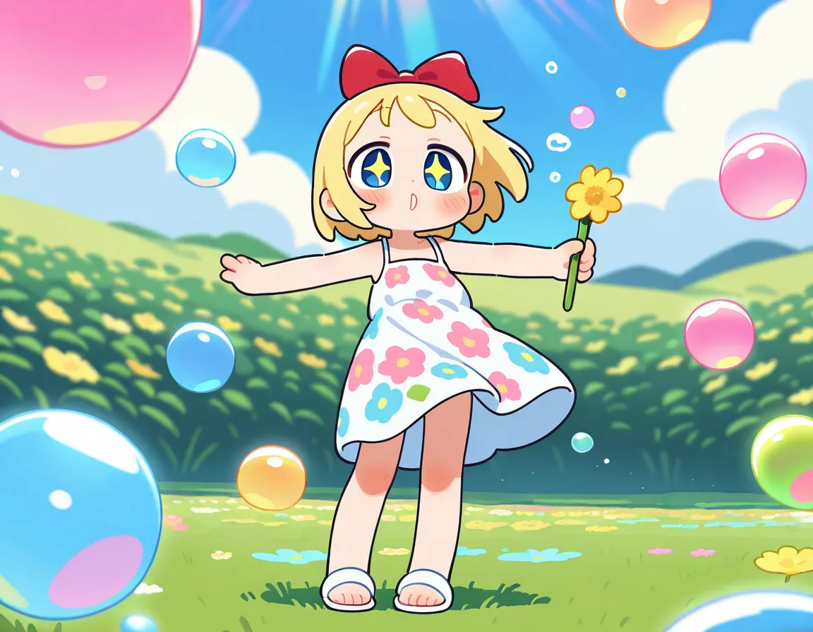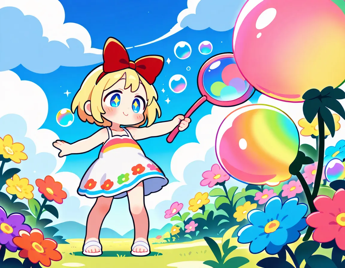 parameters: 1girl,anime style,(young child:1.2),blond hair,blue eyes,short bob cut,(hair bow:1.4),(red bow:1.4),rounded face,cheerful expression,wide smile,sparkling eyes,outdoor garden setting,summer day,standing on grassy field,(blowing bubbles:1.3),colorful soap bubble wand in small hand,arm extended outward,other arm held up in excitement,tiny bubbles floating around,various sized bubbles reflecting light,rainbow colors in bubbles,wearing cute pastel sundress with flower pattern,white sandals,small feet slightly apart for balance,wildflowers around feet,green meadow background,blue sky with fluffy clouds,sunlight creating sparkles,(gentle breeze:1.2),bubbles drifting in wind,detailed bubble reflections,joyful pose,head tilted slightly upward,(masterpiece:1.4),(best quality:1.4),(very aesthetic:1.3),(absurdres:1.2),