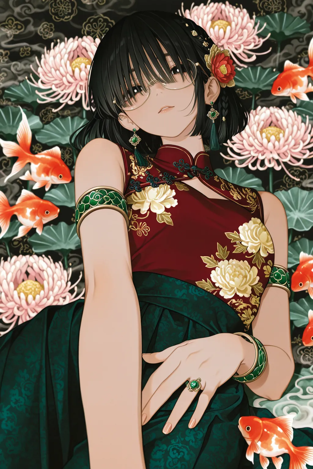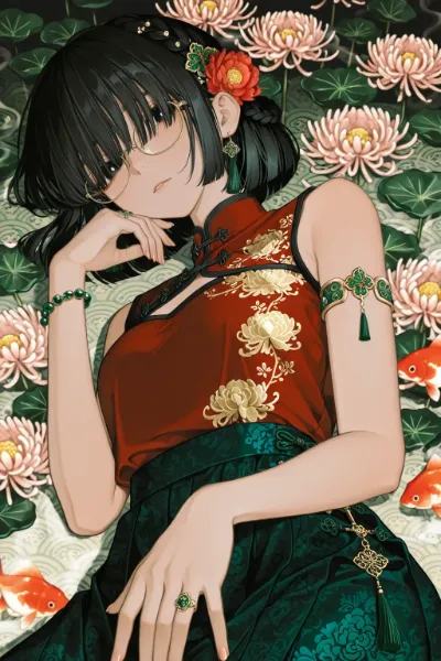 goldfish swimming in flowers