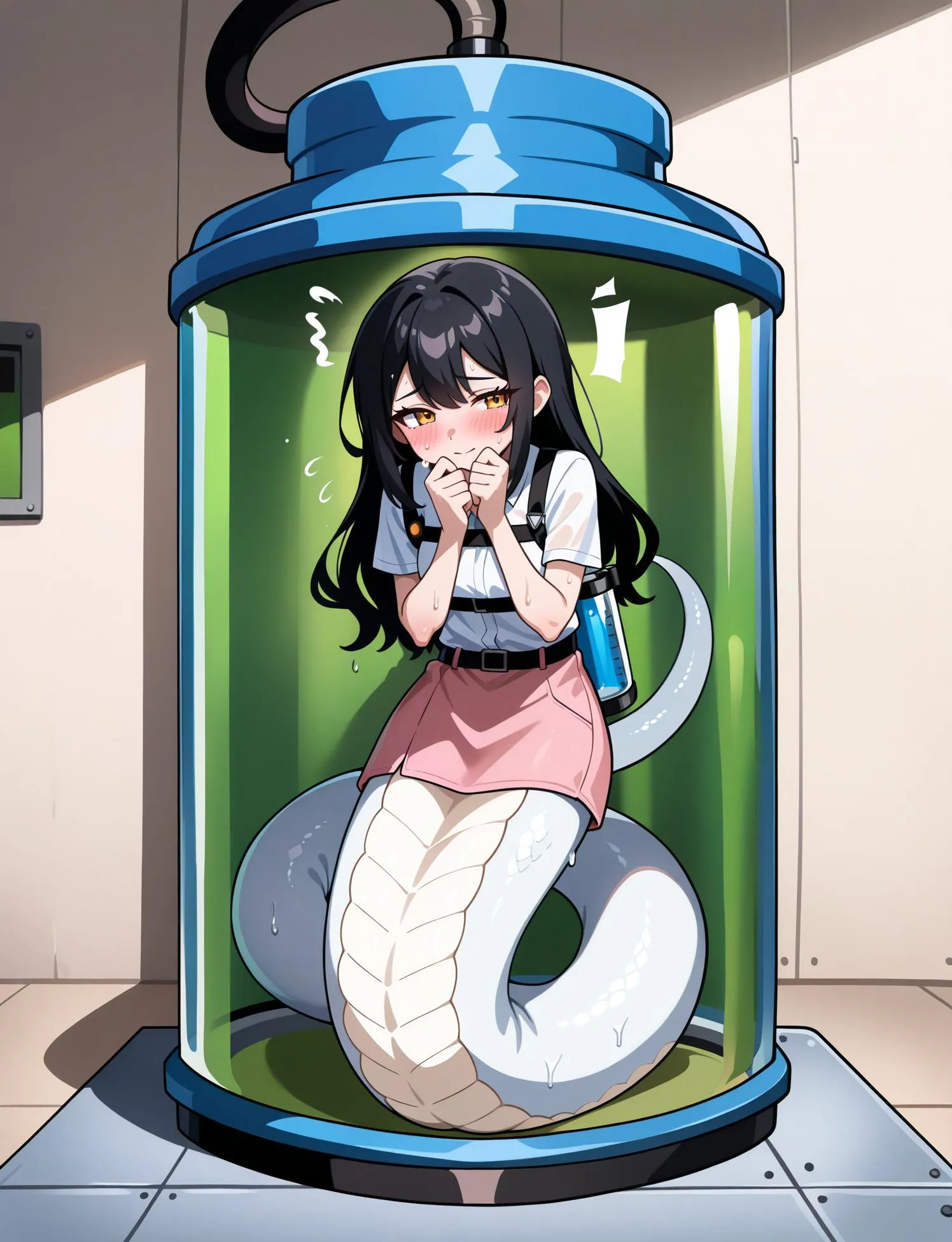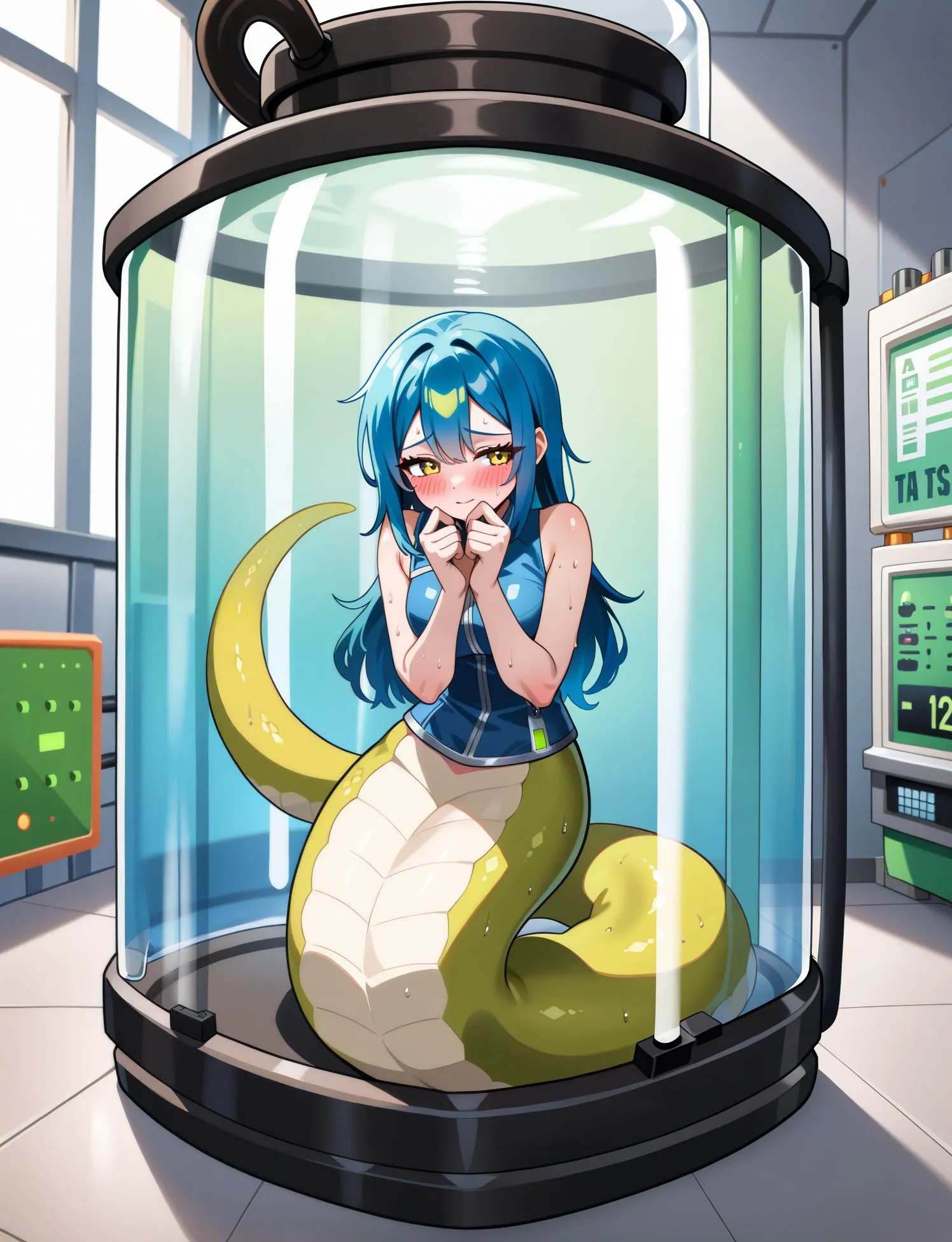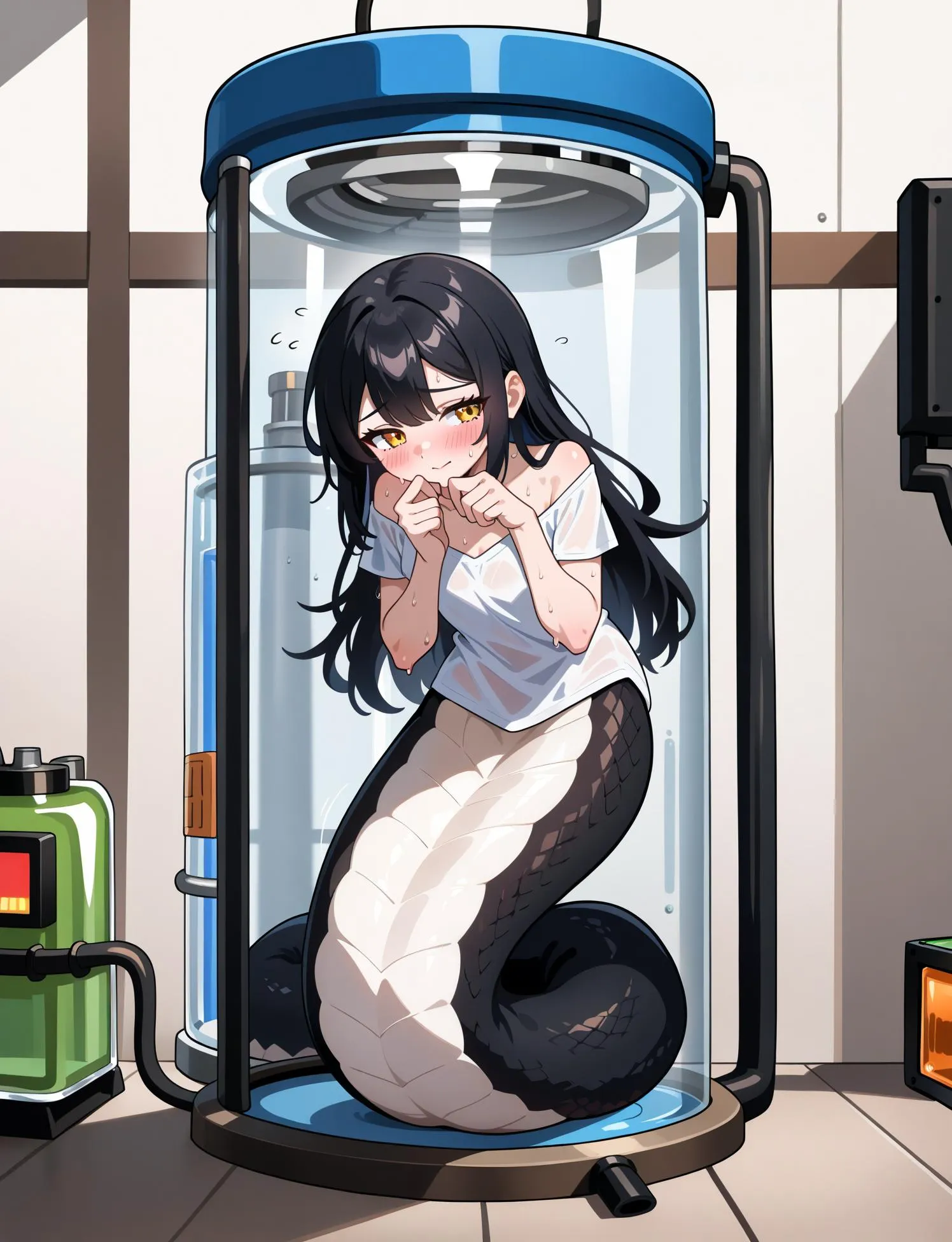 実験室の奥に下半身がヘビの子達がいました。凶暴さも、毒も持っていないらしくとても臆病な子達なので安心とのことです。ちなみにこのコ達はスライムの培養液の中にいた小さな子達からの進化らしいのでとても可愛いくなりそうです。ここの実験室いた子とまだ外にもいる人魚たちもまとめてうちに引き取るのことにしました。