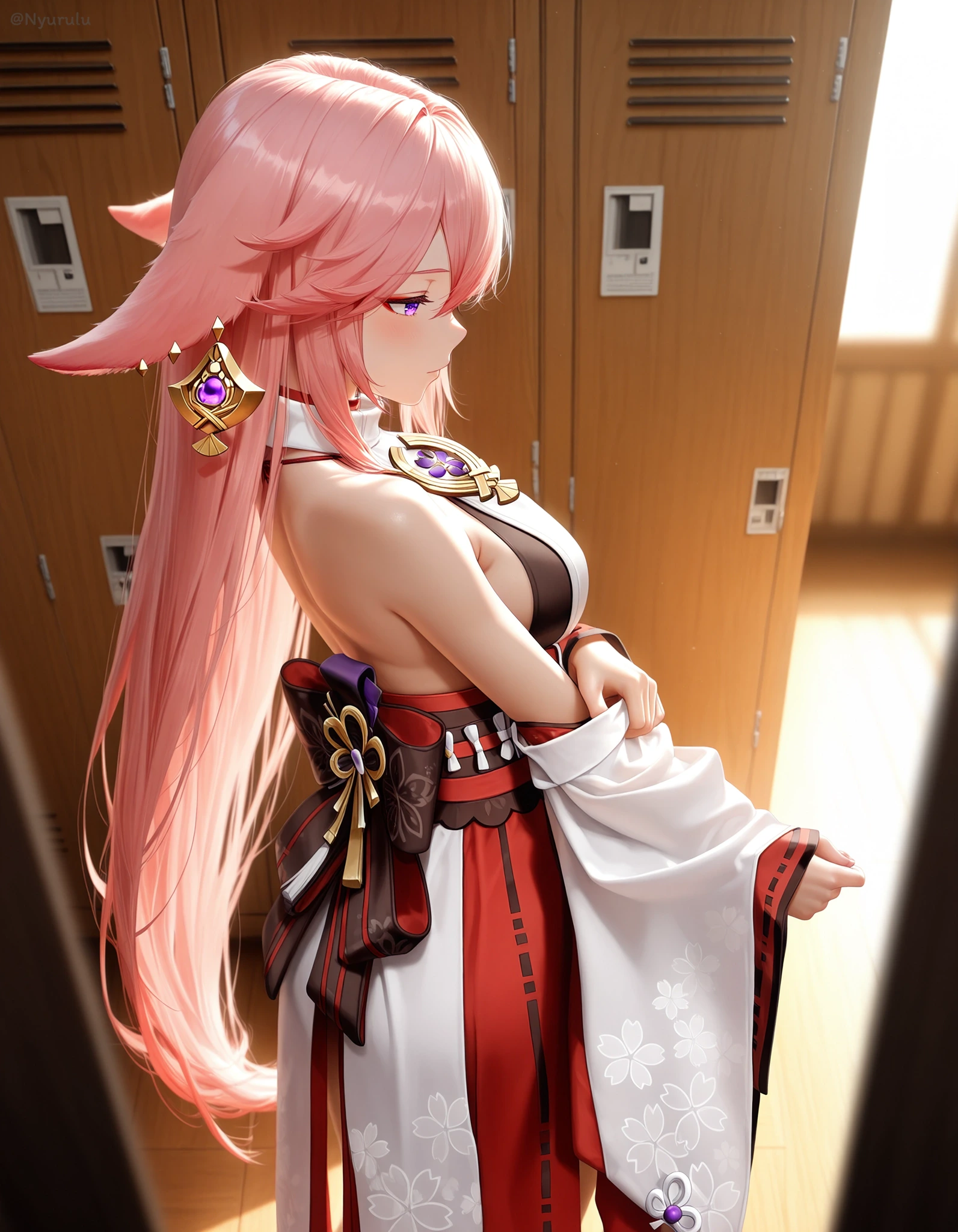 [Request] Yae Miko undressing clothes in the locker room