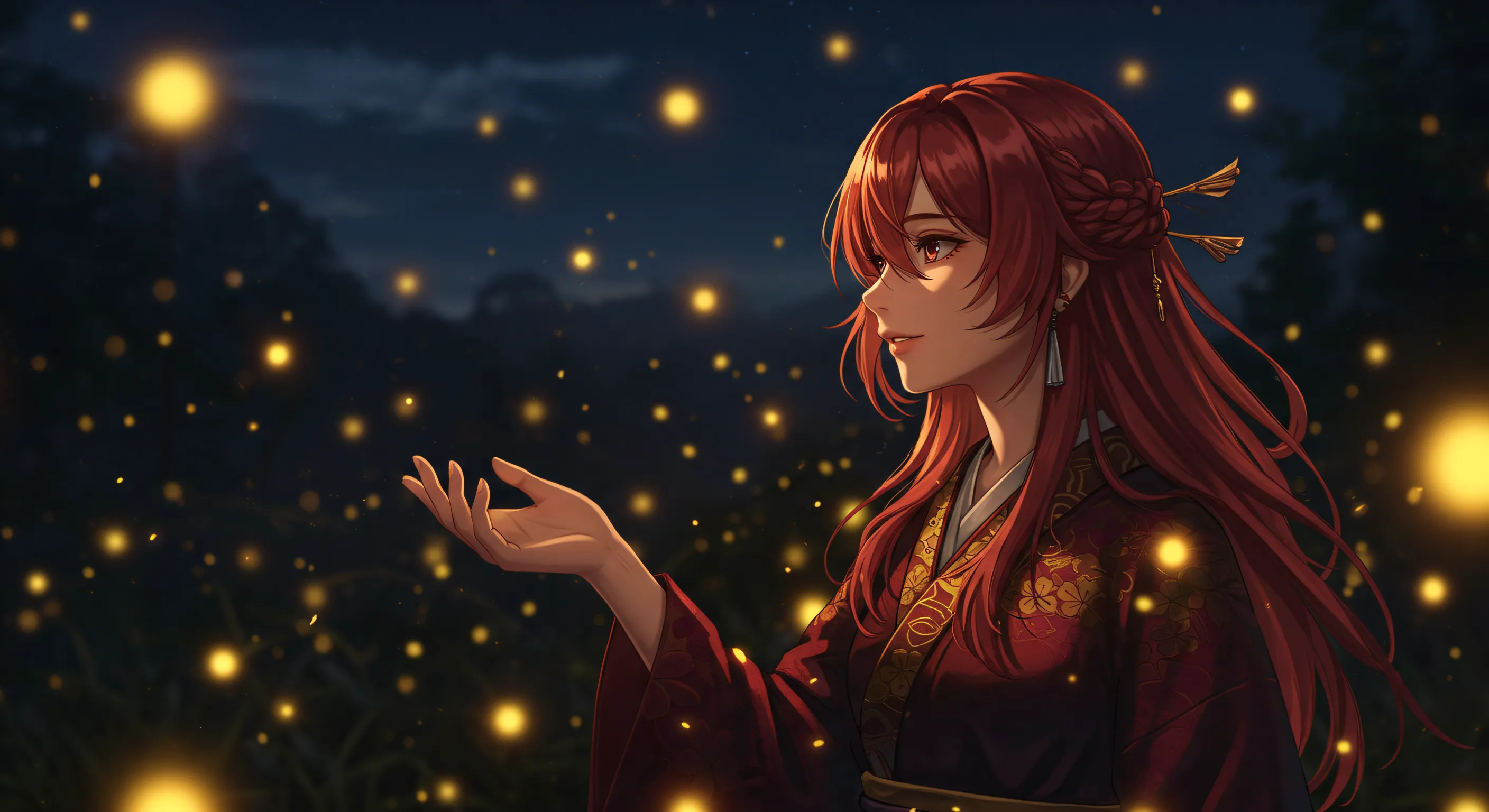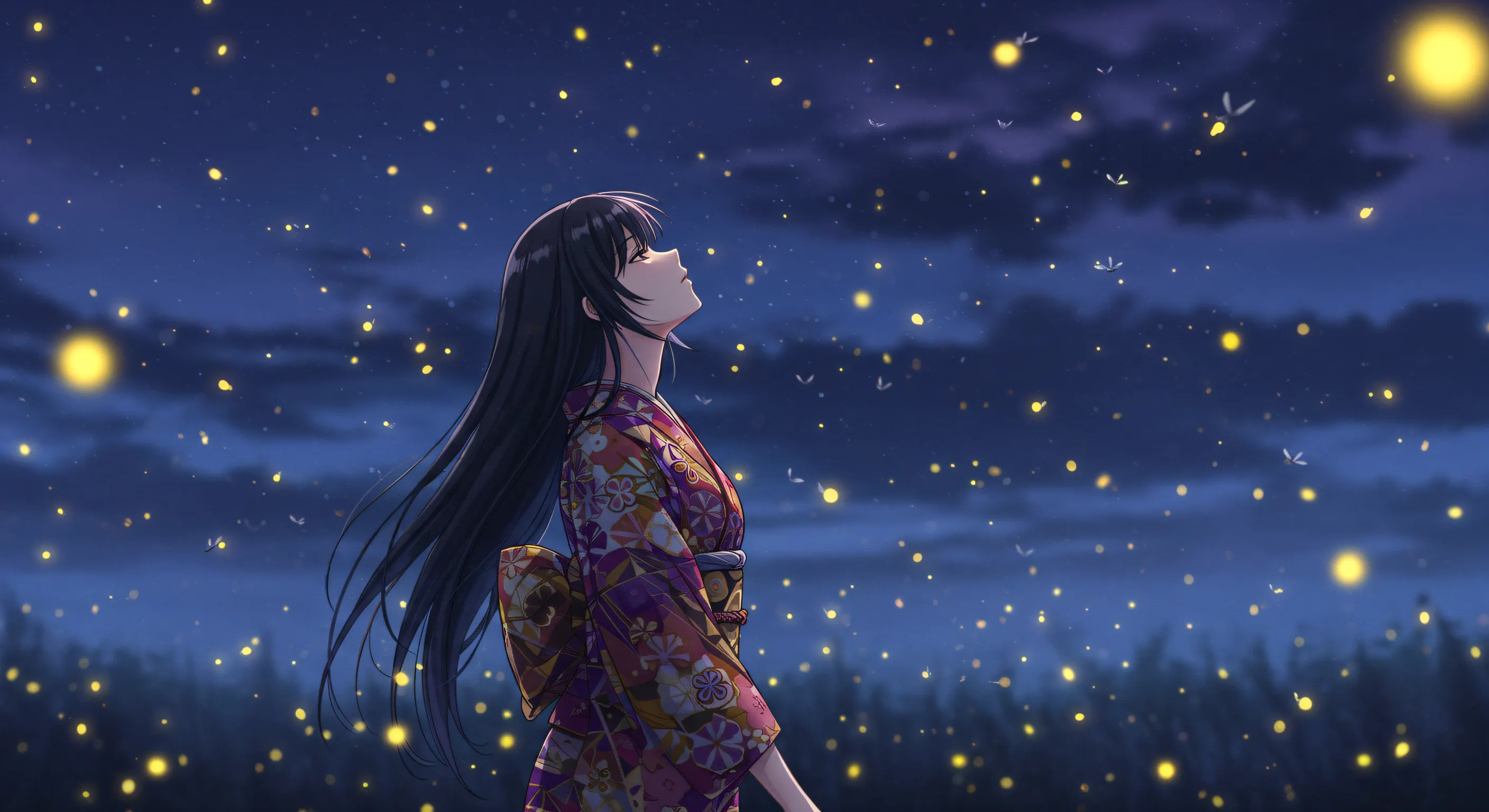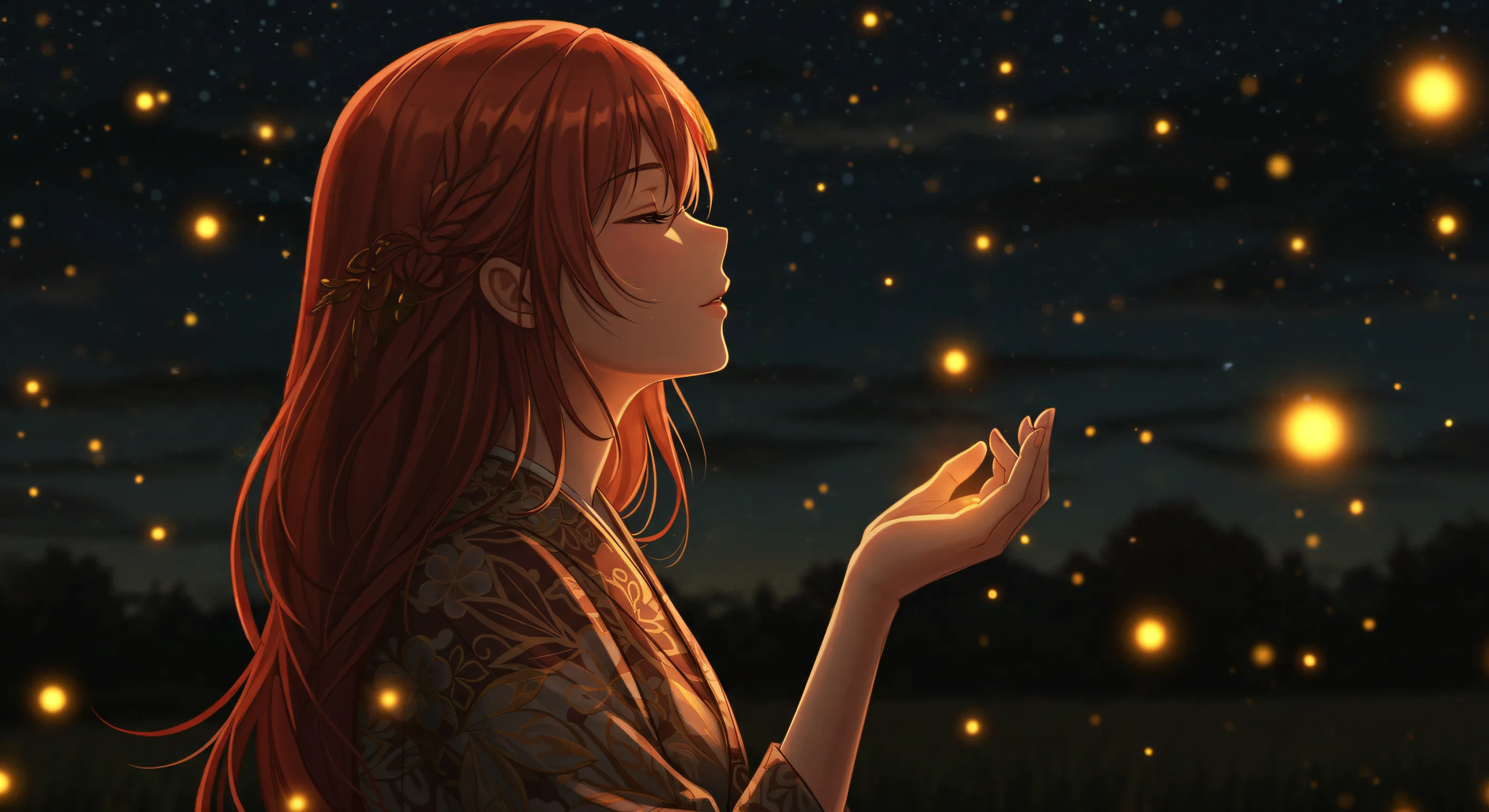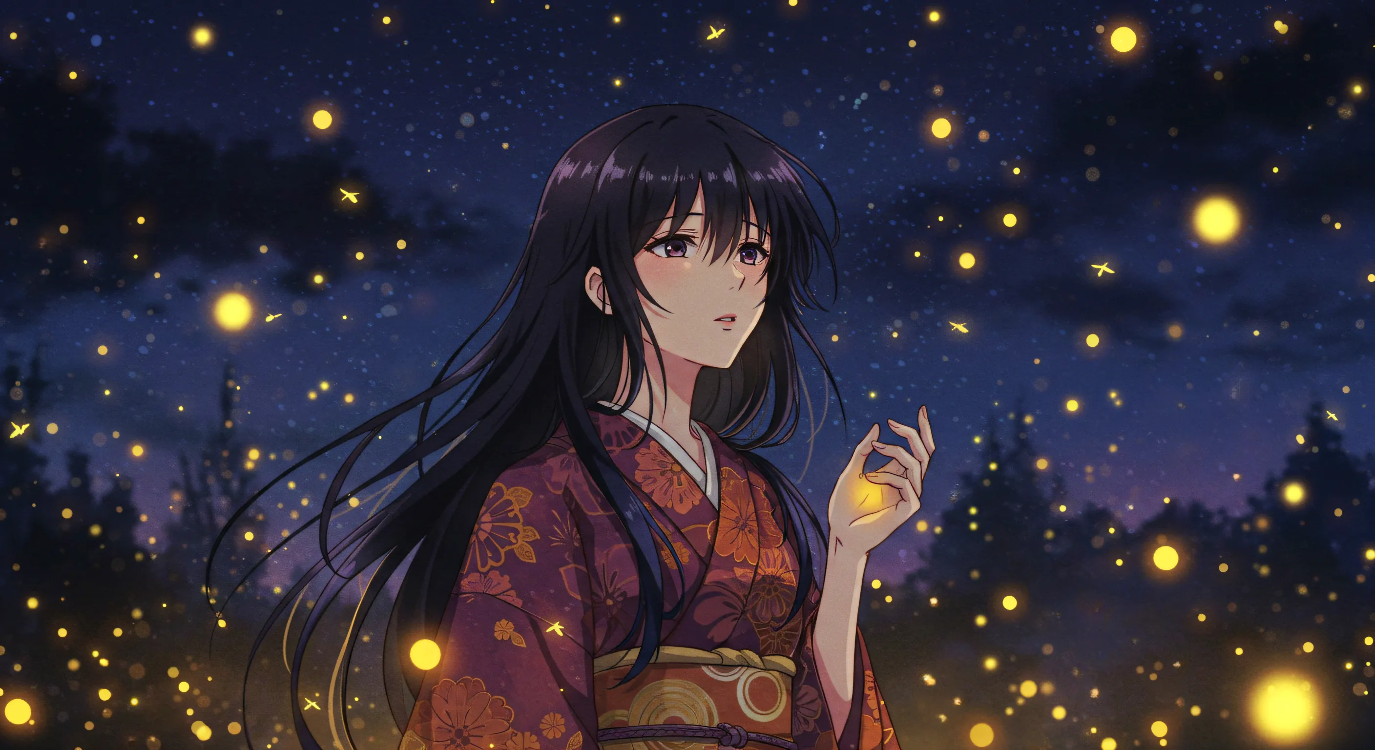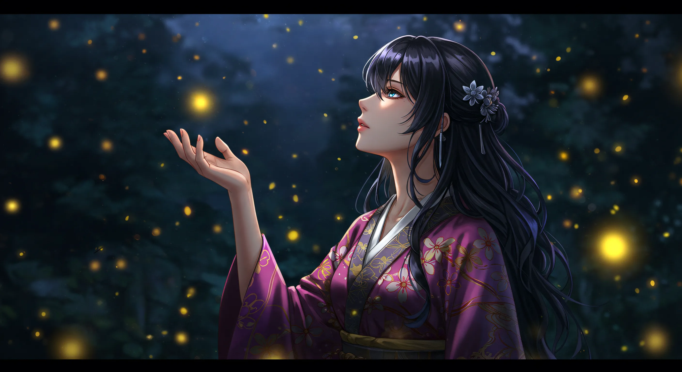 美しい絵に和歌を添えて ほのぼのと 闇に舞ふ火を 追ひながら ひとり想ふは 過ぎし面影