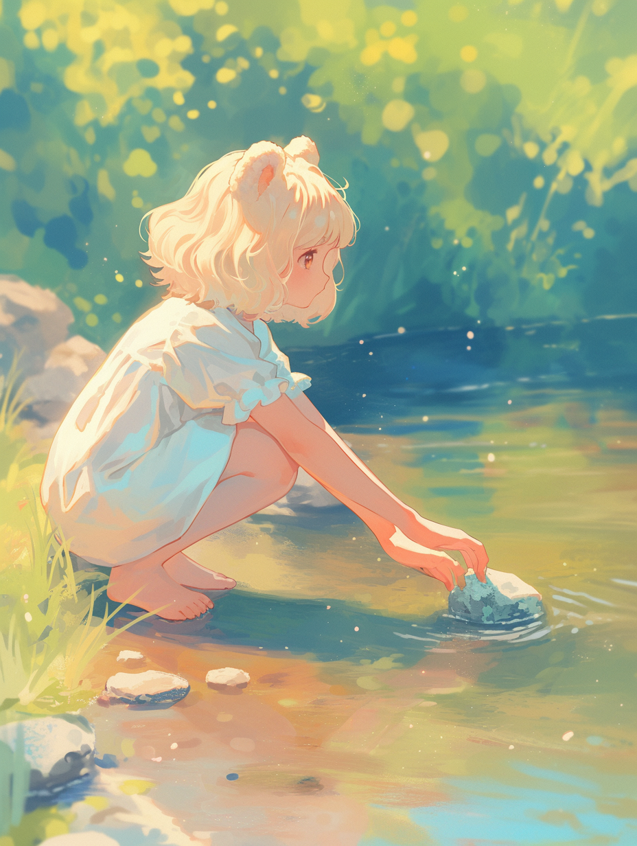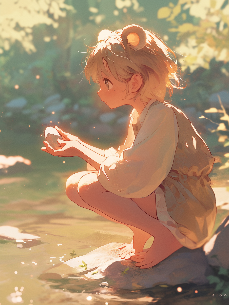 しゃがんで石を見つめるくま娘