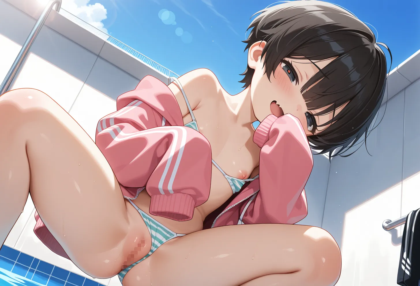 [white micro bikini:aqua striped bikini:0.3], pink jersey, oversized clothes, (strap slip, white bra strap, sleeves past fingers:1.1), nipple slip, nipple, open clothes, bikini bottom aside,