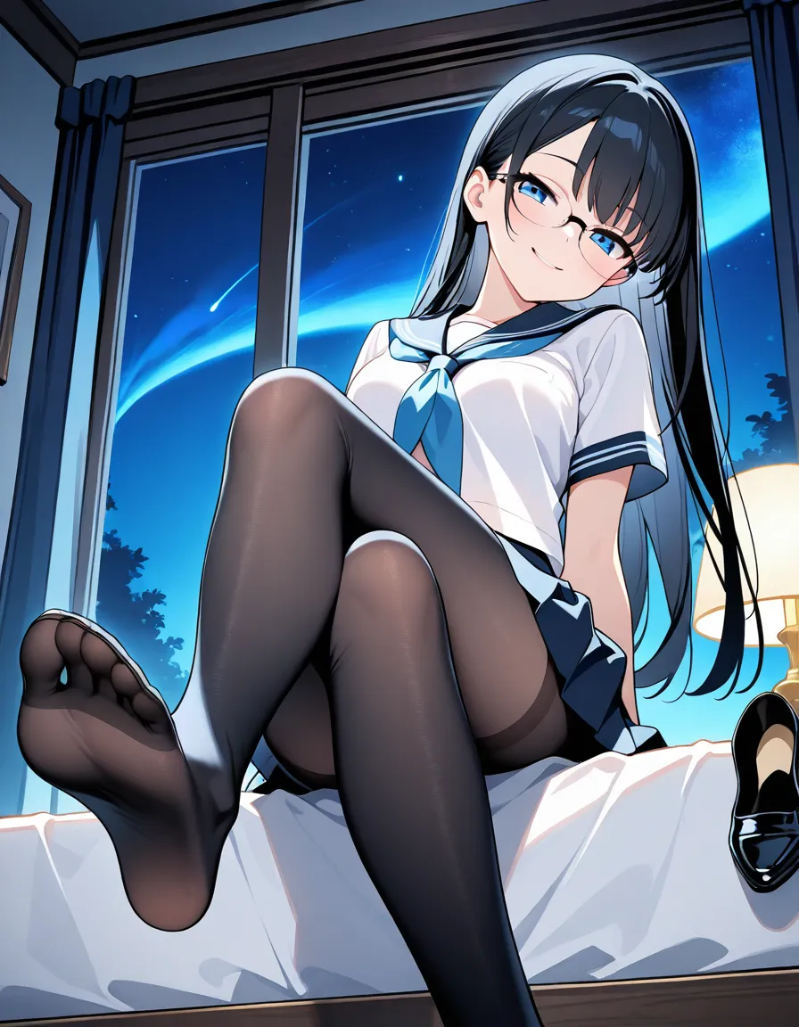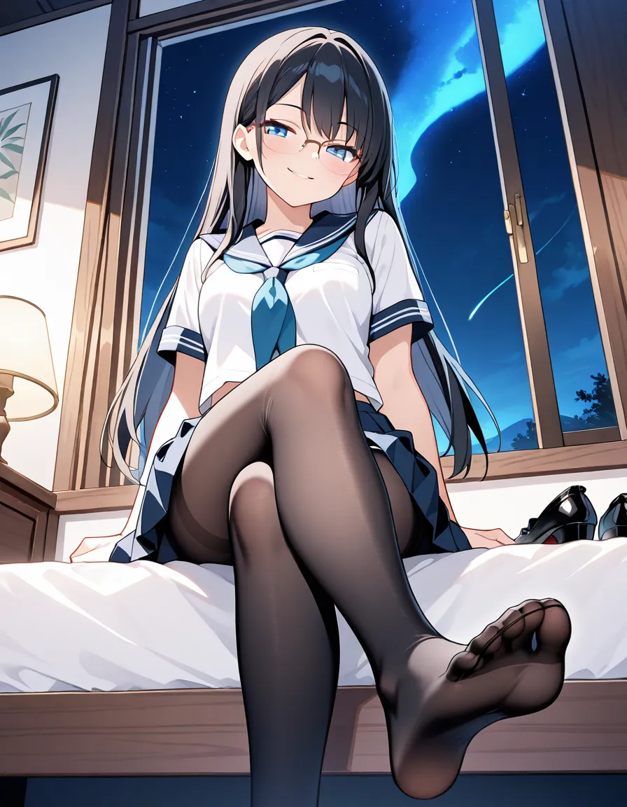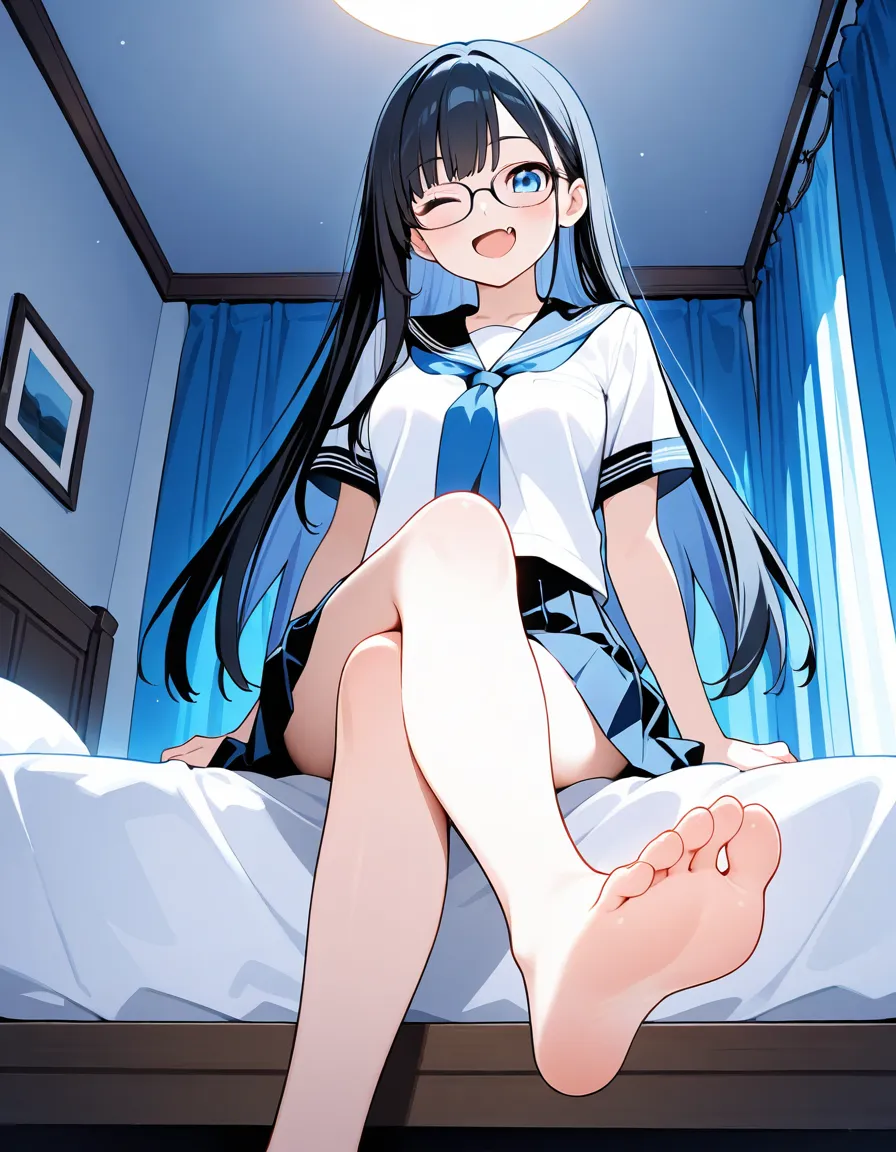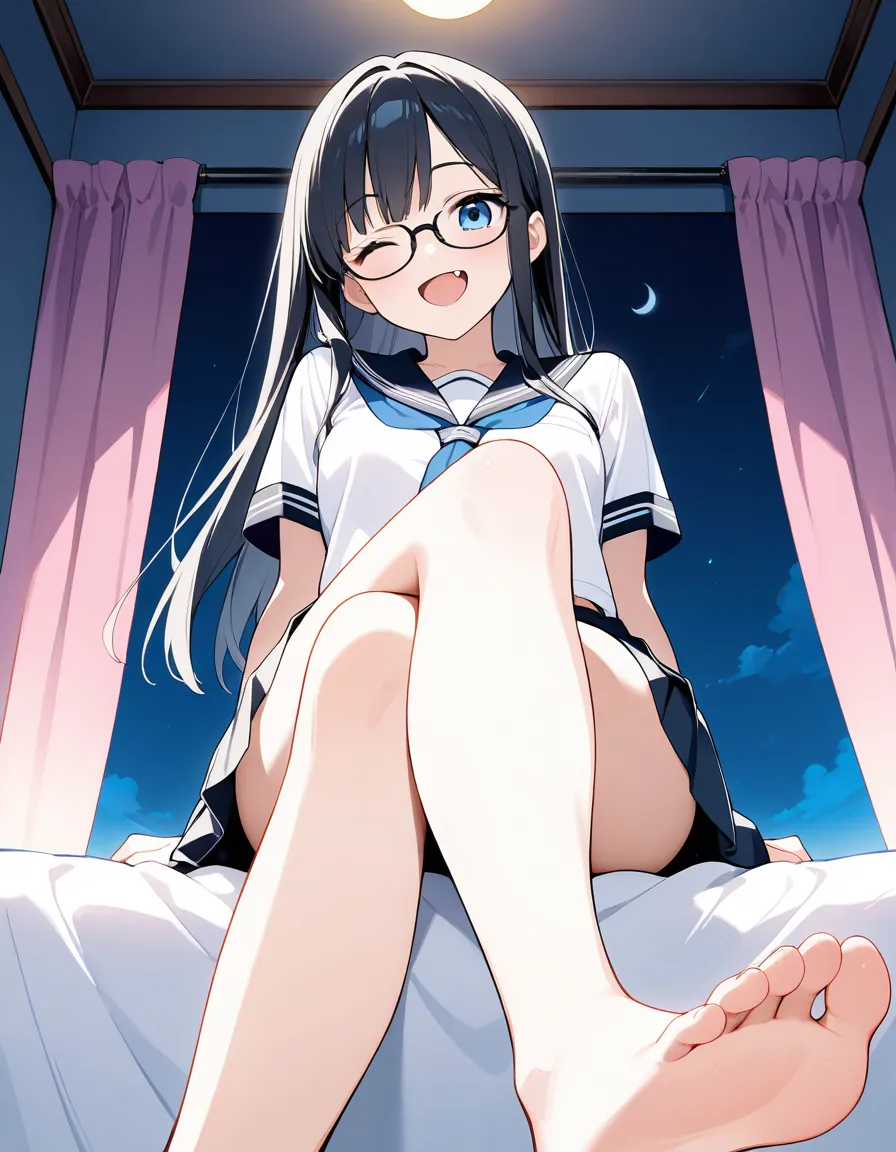 parameters: ((Masterpiece)), ((top quality)), very detailed, animated style illustration, (Bedroom with curtains closed:1.5), 1girl, cute girl, solo, (detailed face), (beautiful blue eyes), beautiful black hair, (Straight long hair:1.3), (glasses:1.2), slim, slender, medium breast, (happy smile:1.3), (winking:1.2), (one eye closed), open mouth, (fang), (serafuku), (short sleeves), (pleated skirt), barefoot, crossed legs, (soles), focus on the sole, sitting on bed, (from below), intricate design, night, fantasy setting, detailed background, high resolution, looking at viewer, vibrant colors, soft shading, happy atmosphere, soft lighting.