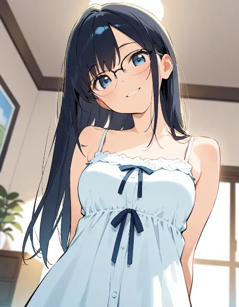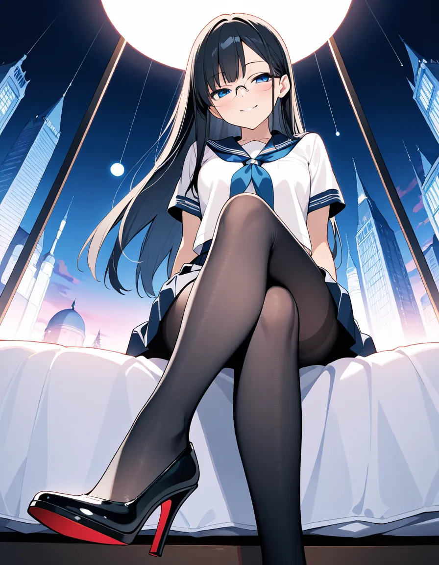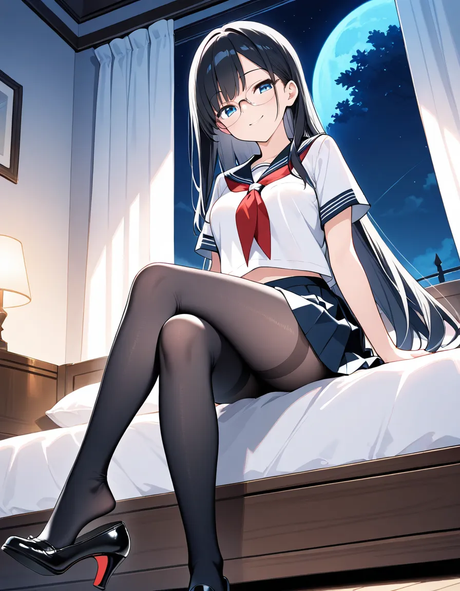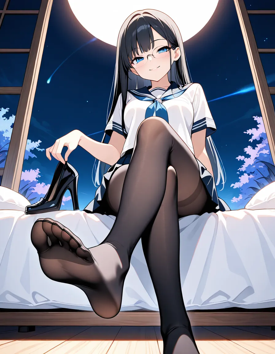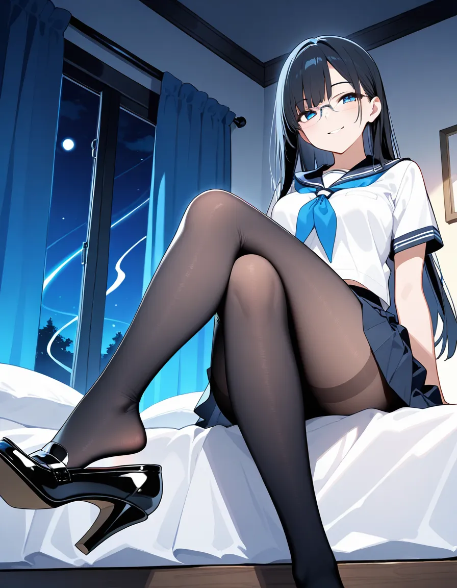 parameters: ((Masterpiece)), ((top quality)), very detailed, animated style illustration, (Bedroom with curtains closed:1.5), 1girl, cute girl, solo, (detailed face), (beautiful blue eyes), beautiful black hair, (Straight long hair:1.3), (glasses:1.2), slim, slender, medium breast, (happy smile:1.3), (winking:1.2), (one eye closed), open mouth, (fang), (serafuku), (short sleeves), (pleated skirt), barefoot, crossed legs, (soles), focus on the sole, sitting on bed, (from below), intricate design, night, fantasy setting, detailed background, high resolution, looking at viewer, vibrant colors, soft shading, happy atmosphere, soft lighting.