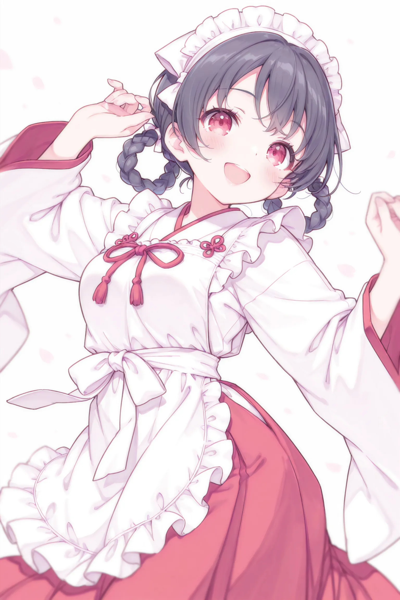 Braided hair rings, black hair, red eyes, medium breasts,