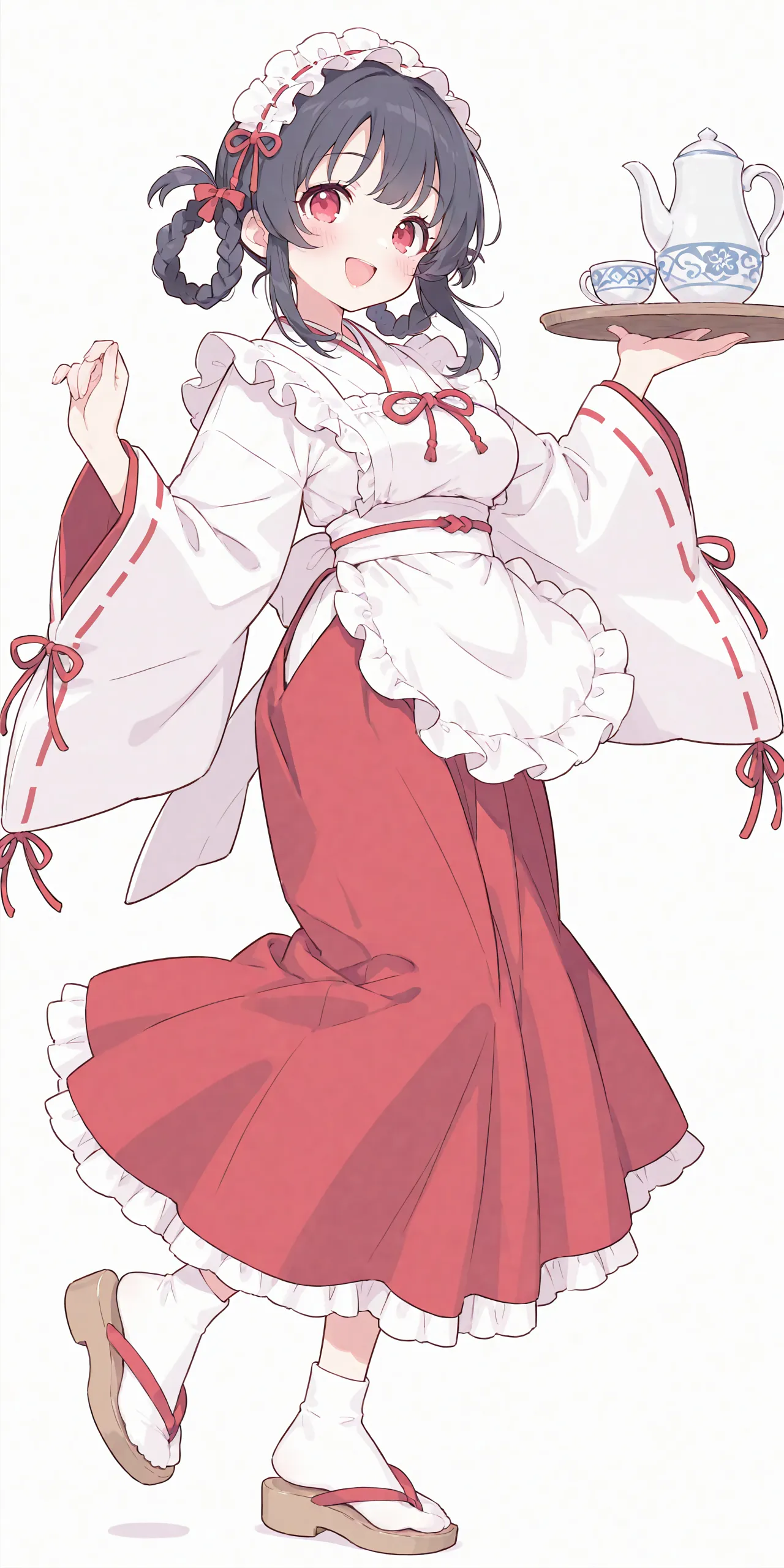Japanese white shrine maiden clothes, long red skirt, frill headband, white apron, white ankle socks, Sandals,