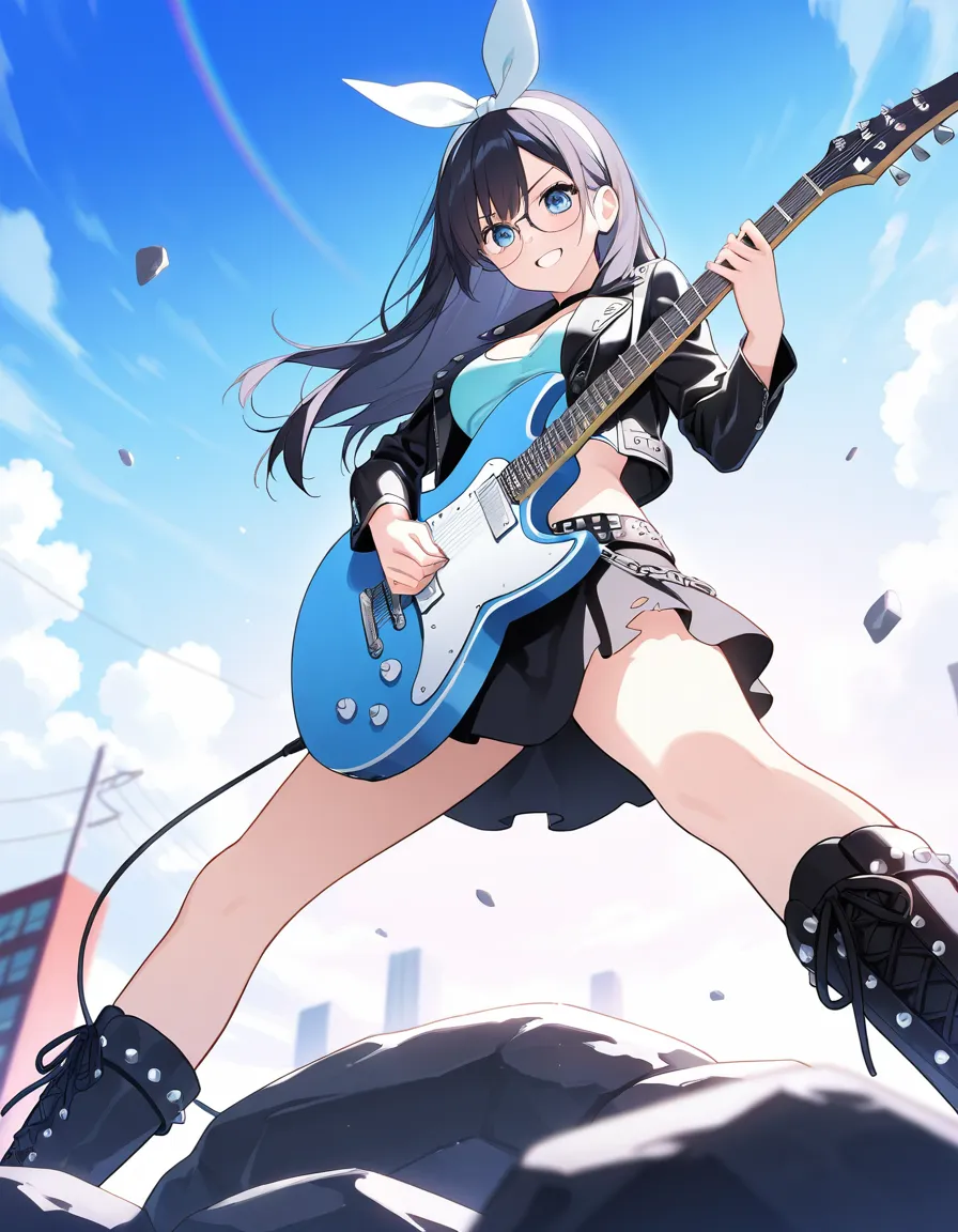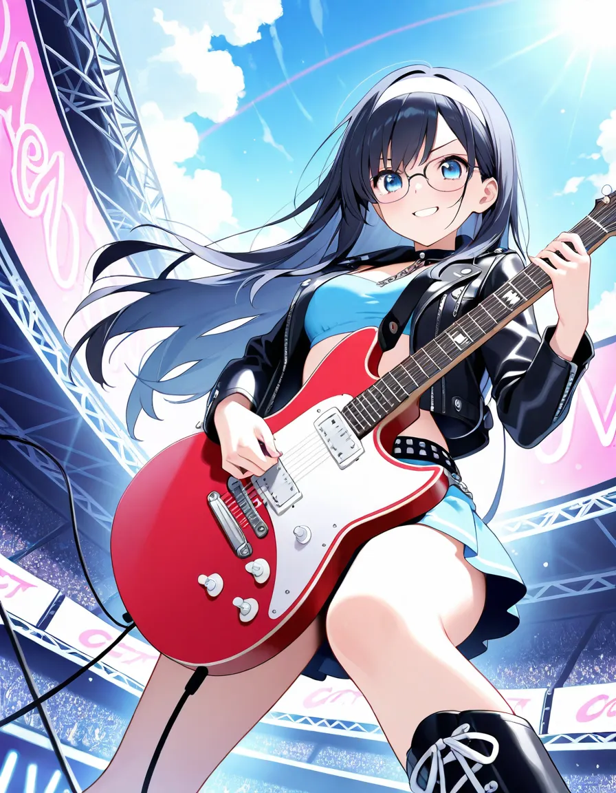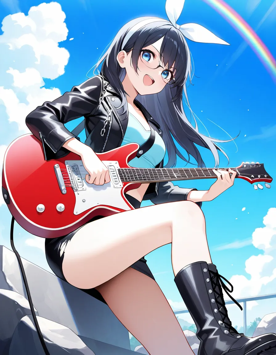 parameters: ((masterpiece)), ((best quality)), (ultra-detailed), ((kawaii)), cute, (lovely), animated style illustration, (rainbow in a clear summer sky), (cloudless blue sky), on an outdoor live stage, from below, 1girl, cute girl, (solo), (beautiful blue eyes), (beautiful black hair), (long hair:1.3), (white hairband), slim, slender, medium breast, (glasses:1.3), female rockstar wearing edgy stage outfit: leather jacket, ripped short skirt, boots, accessories like studs and chains, bold makeup, (confident expression:1.4), (playing electric guitar with intense action:1.3), ((dynamic pose)), dramatic lighting, rock concert atmosphere, detailed background, vibrant colors, cinematic mood, delicate facial features.