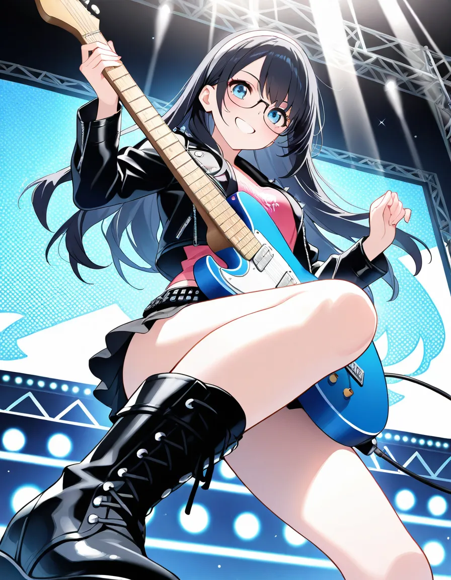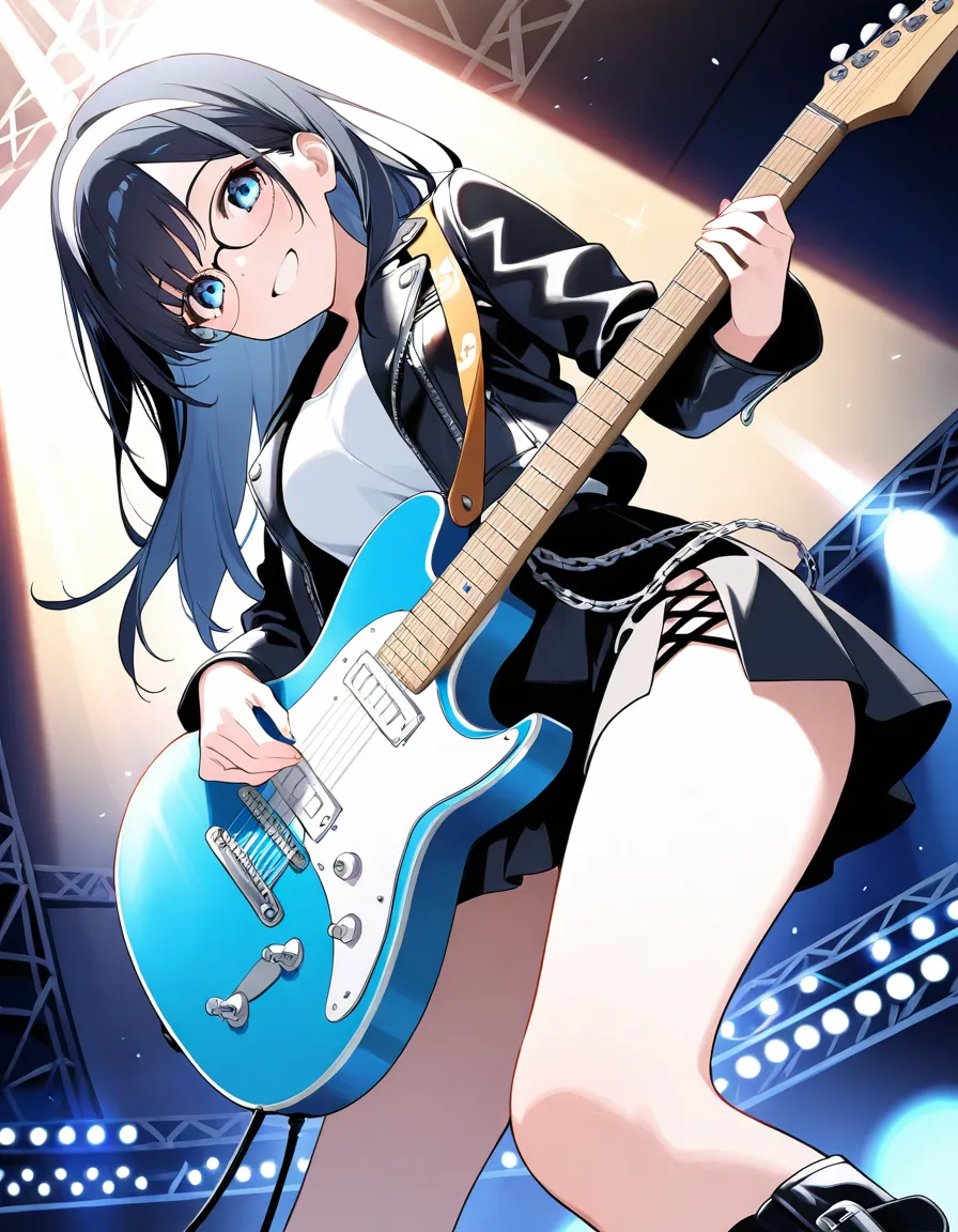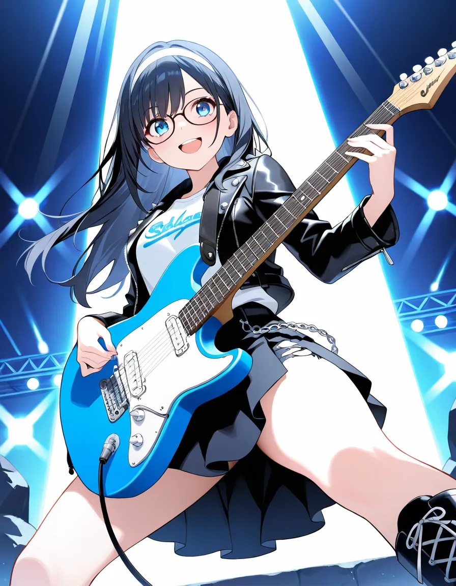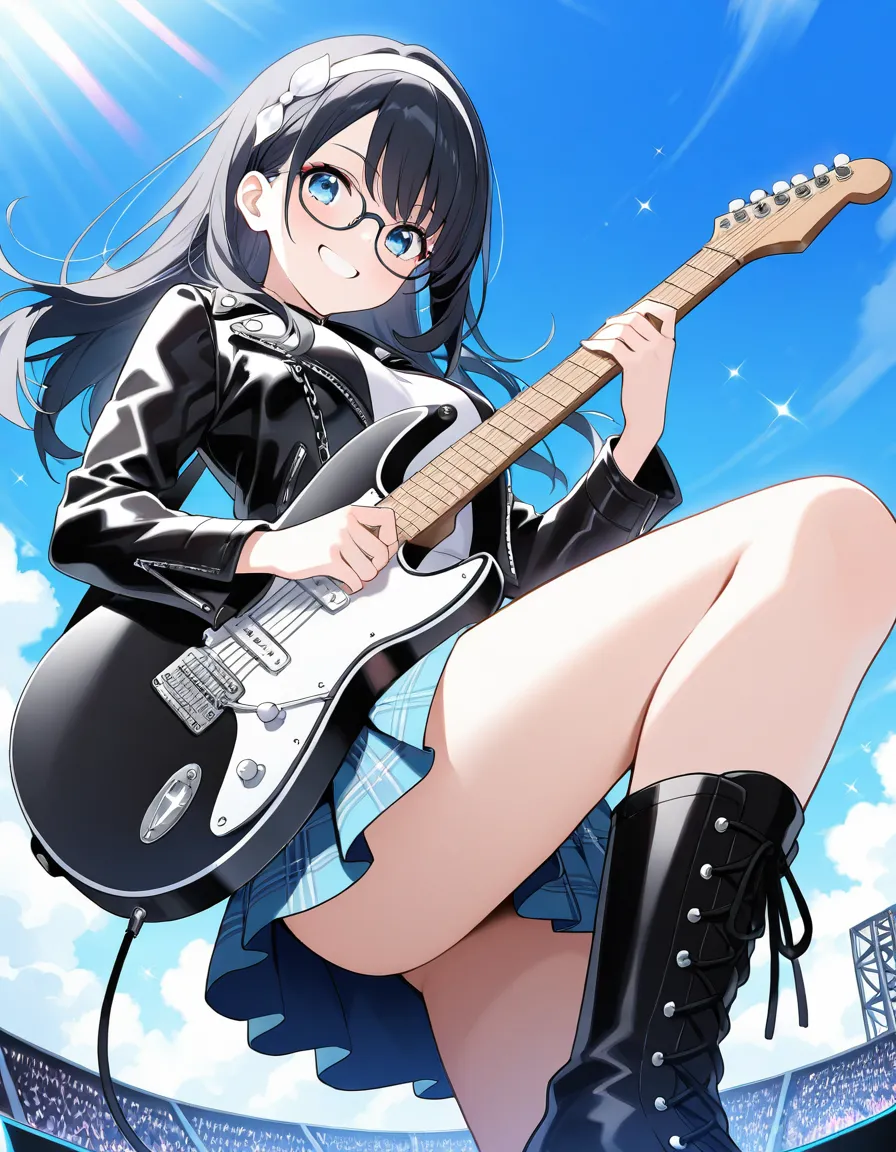parameters: ((masterpiece)), ((best quality)), (ultra-detailed), ((kawaii)), cute, (lovely), animated style illustration, (rainbow in a clear summer sky), (cloudless blue sky), on an outdoor live stage, from below, 1girl, cute girl, (solo), (beautiful blue eyes), (beautiful black hair), (long hair:1.3), (white hairband), slim, slender, medium breast, (glasses:1.3), female rockstar wearing edgy stage outfit: leather jacket, ripped short skirt, boots, accessories like studs and chains, bold makeup, (confident expression:1.4), (playing electric guitar with intense action:1.3), ((dynamic pose)), dramatic lighting, rock concert atmosphere, detailed background, vibrant colors, cinematic mood, delicate facial features.