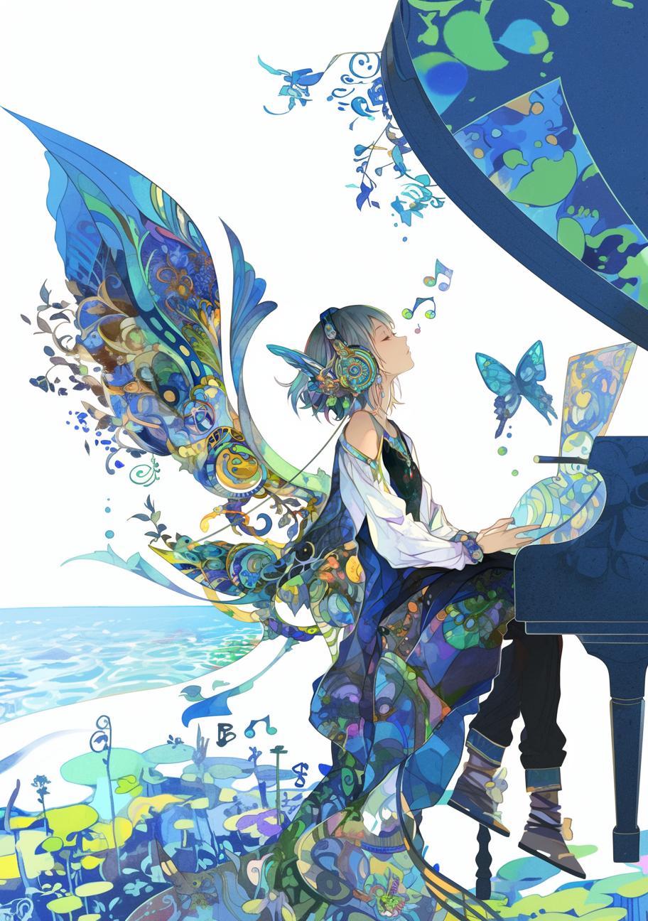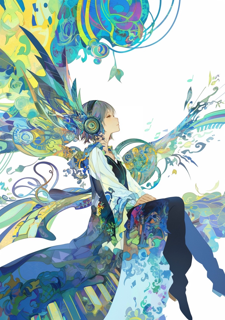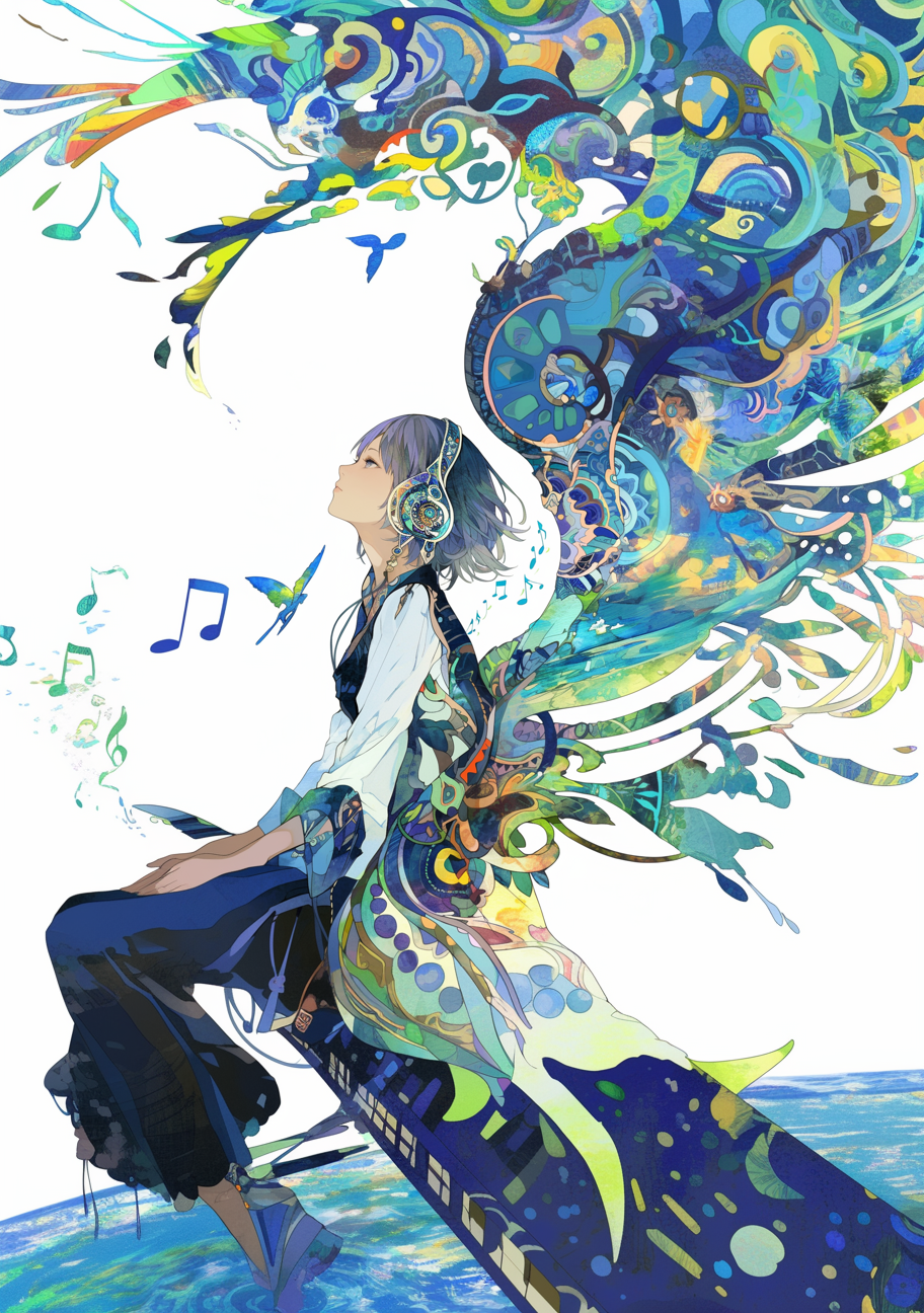 彩りの柄がある翼を持つヘッドホンをしている女の子