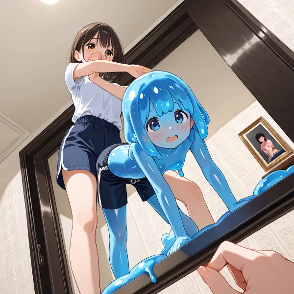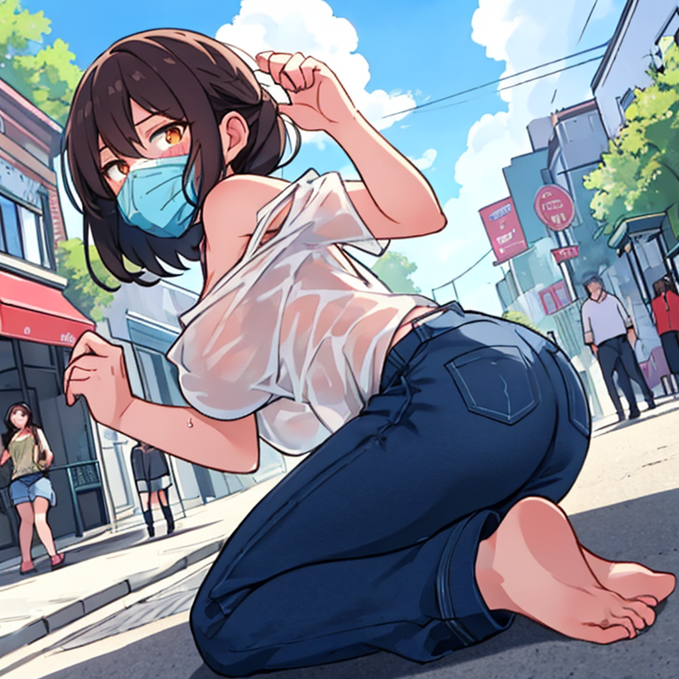 parameters: (Photo image), nice women's clothes - made of slime - melting off in the hot sun on a hot summer day. Main Street - in the background there is a woman looking forwards and a woman looking backwards - an image of an angle looking up from below with head to toe and ground included, a shy woman in a dancing pose facing us, showing her shorts and covering her face with her hands.