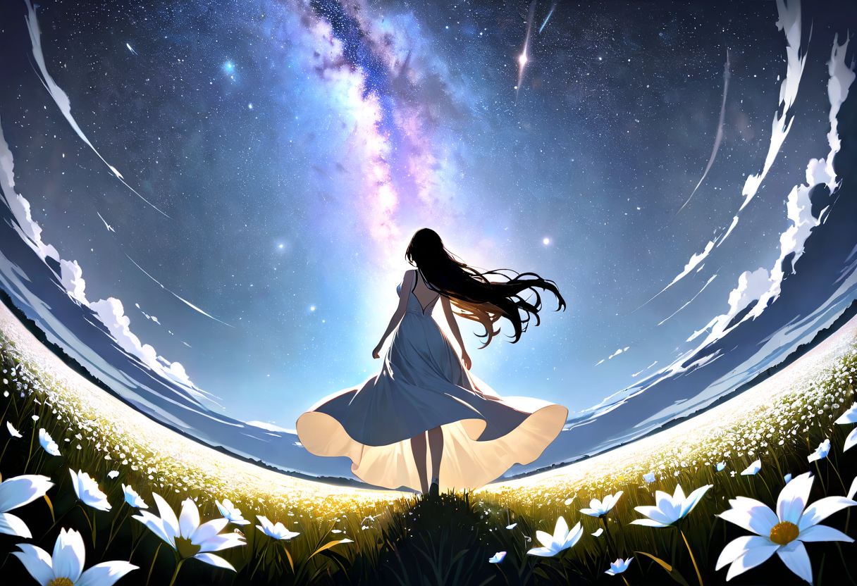 parameters: masterpiece, best quality, extremely detailed, 4k, 8k, night sky, milky way galaxy, glowing white flowers, open field, field covered in glowing flowers, a girl standing in the field, seen from behind, looking up at the sky, long flowing hair, hair swaying in wind, white one-piece dress, flowing dress, soft silhouette, backlit, moonlight, starry sky, cinematic lighting, upward angle, low perspective, from below, serene, ethereal, dreamy atmosphere, full body, <lora:saturation:1>