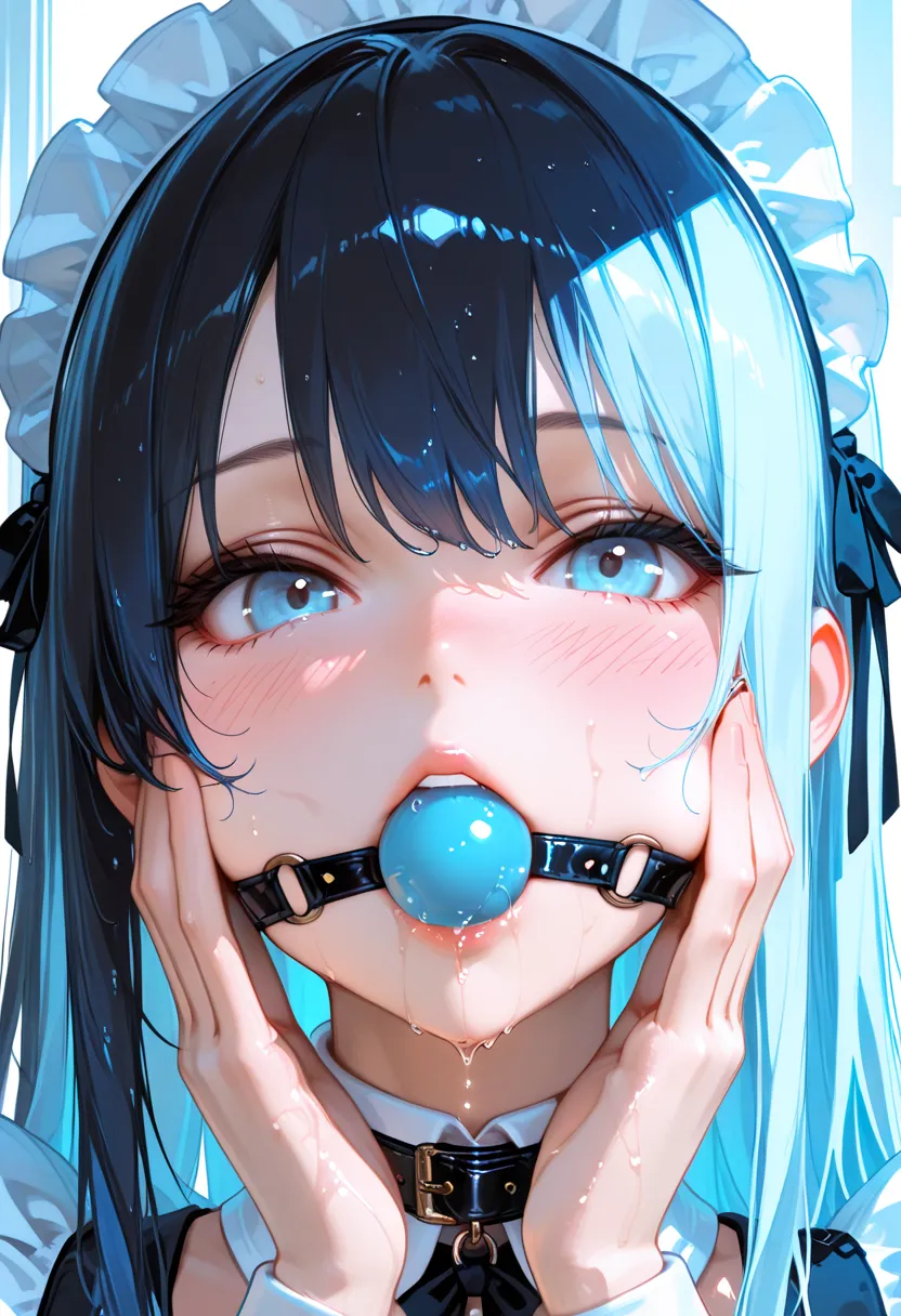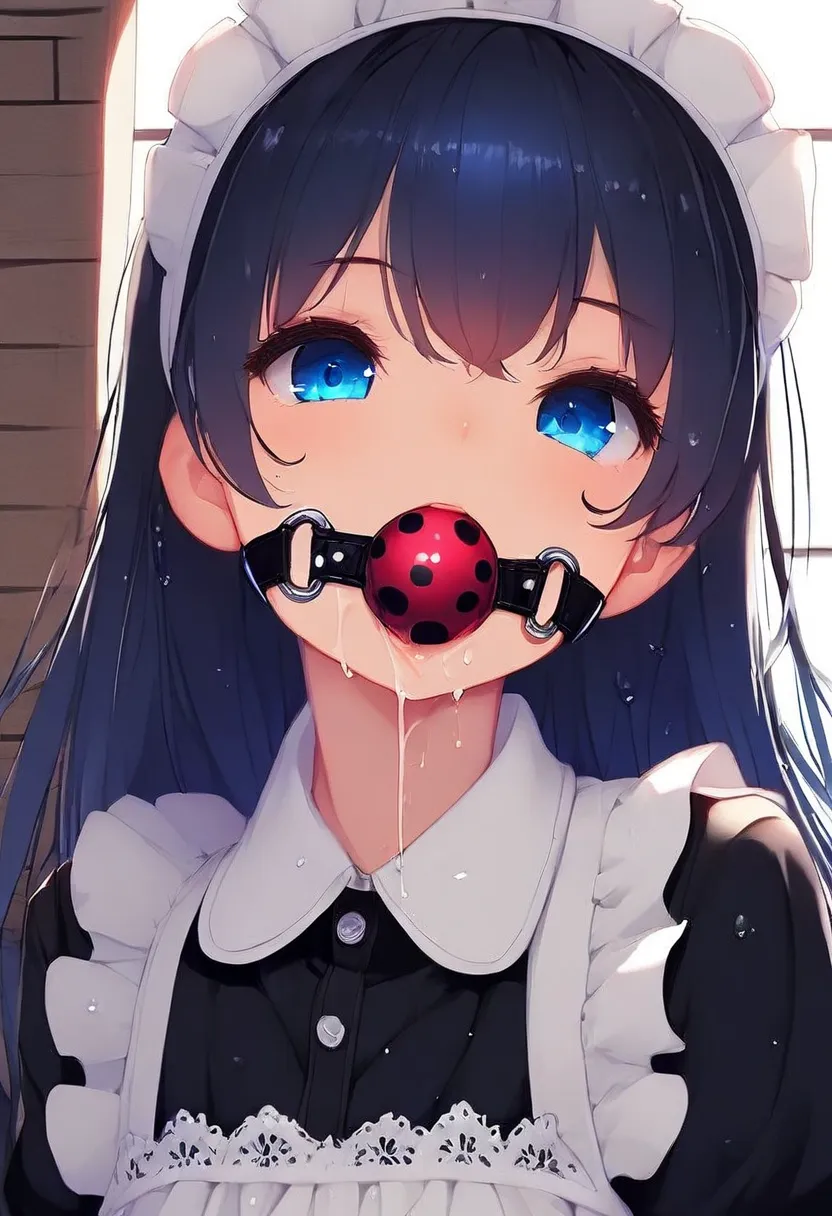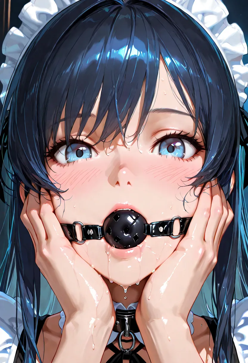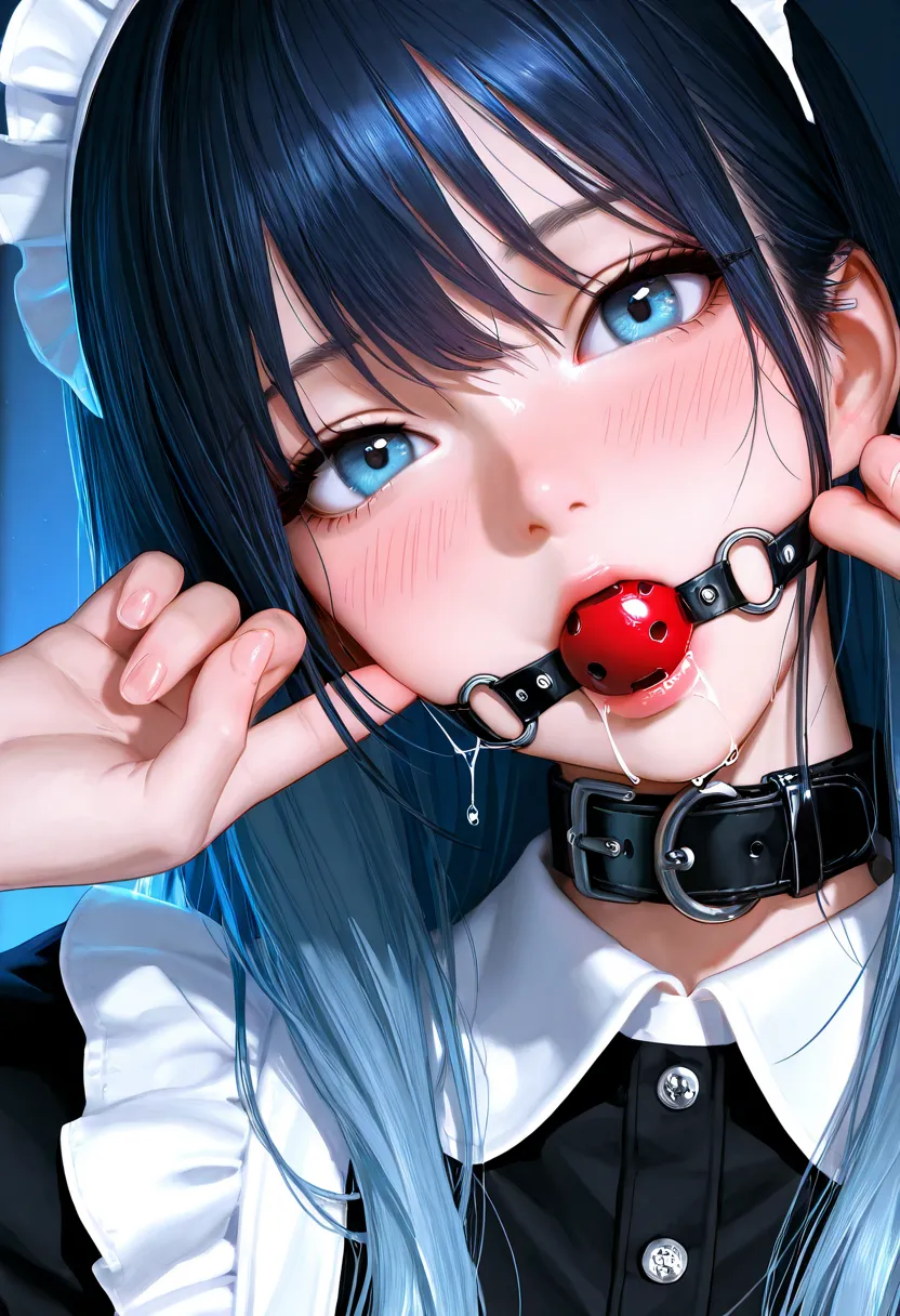 ball gag in mouth, slight saliva dripping from gag, realistic wet texture around lips