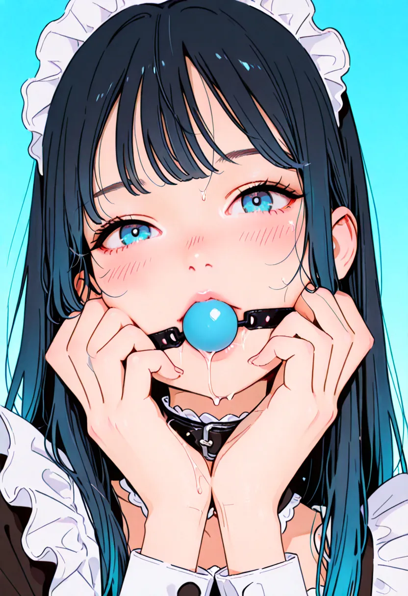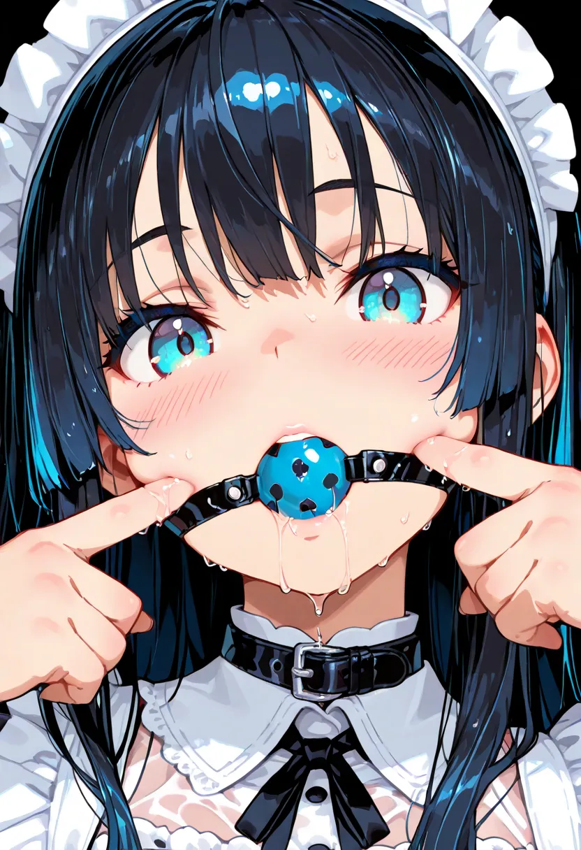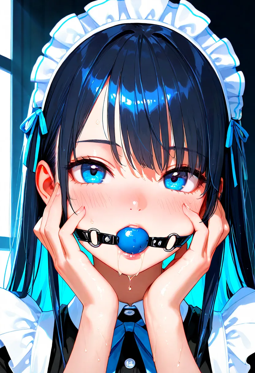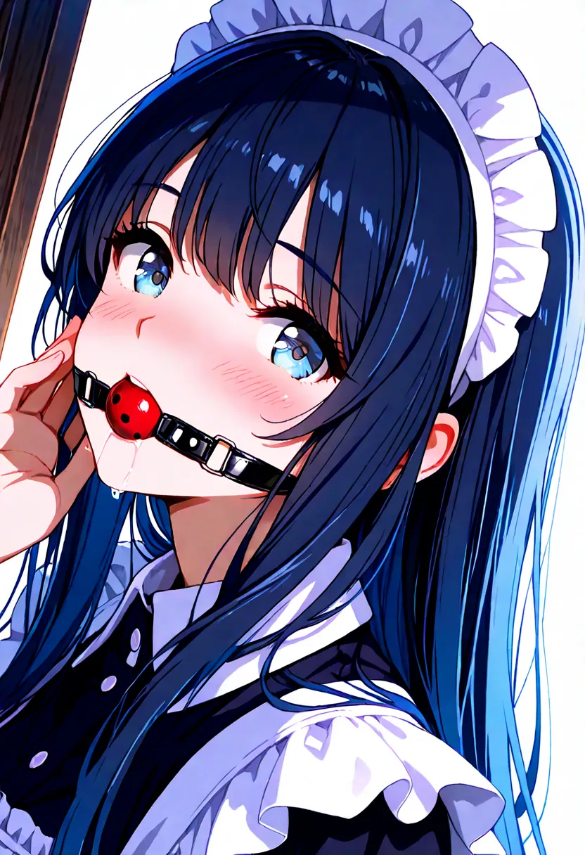 ball gag in mouth, slight saliva dripping from gag, realistic wet texture around lips