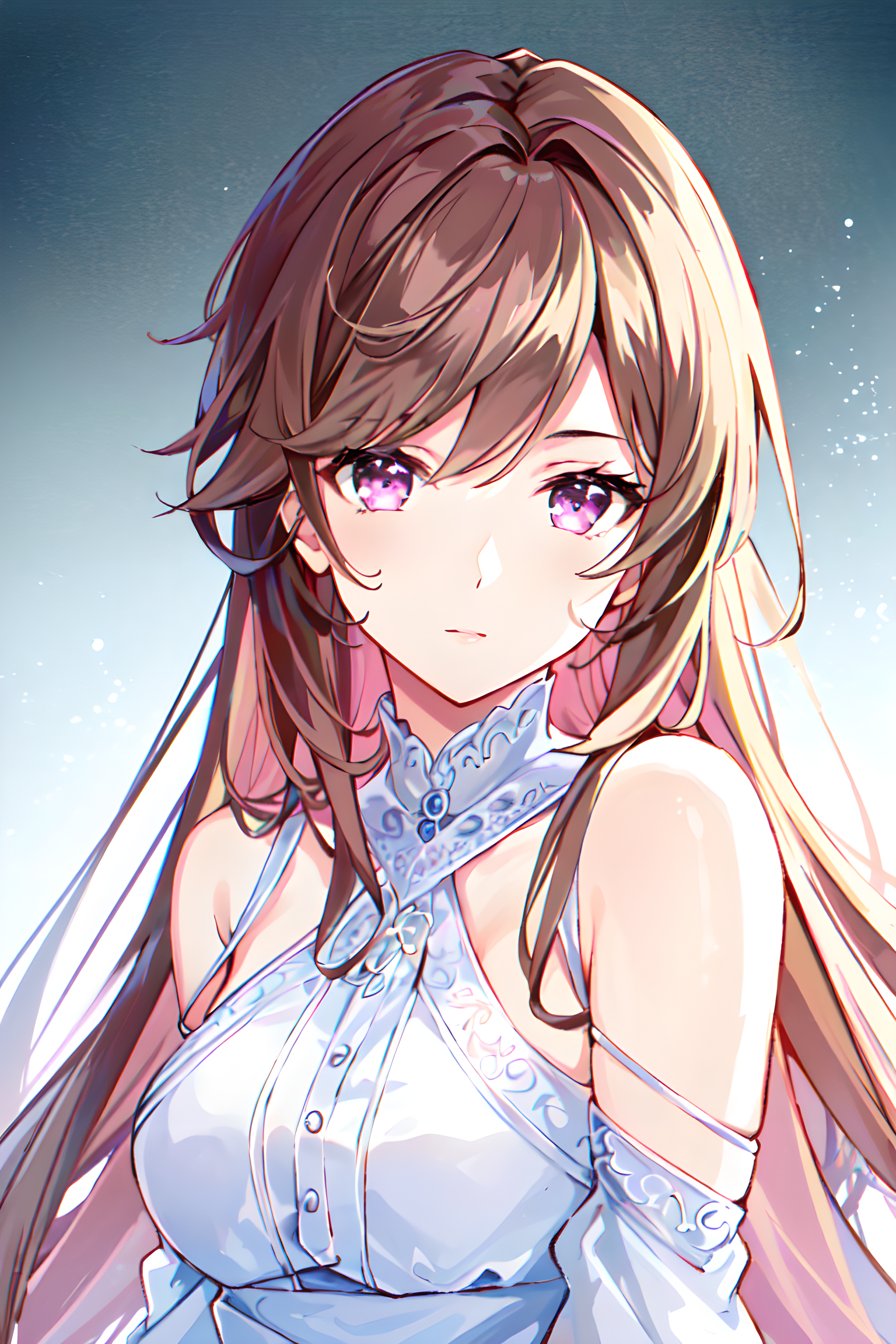 parameters: masterpiece, ultra-detailed, high quality, 4k resolution, 8k resolution, highly detailed, a young girl, chestnut brown hair (1.2), light pink eyes (1.2), shoulder-length hair, white and pink themed clothing (1.1), intricate decorations on clothing, soft lighting, realistic textures, detailed facial features, gentle expression, facing viewer
