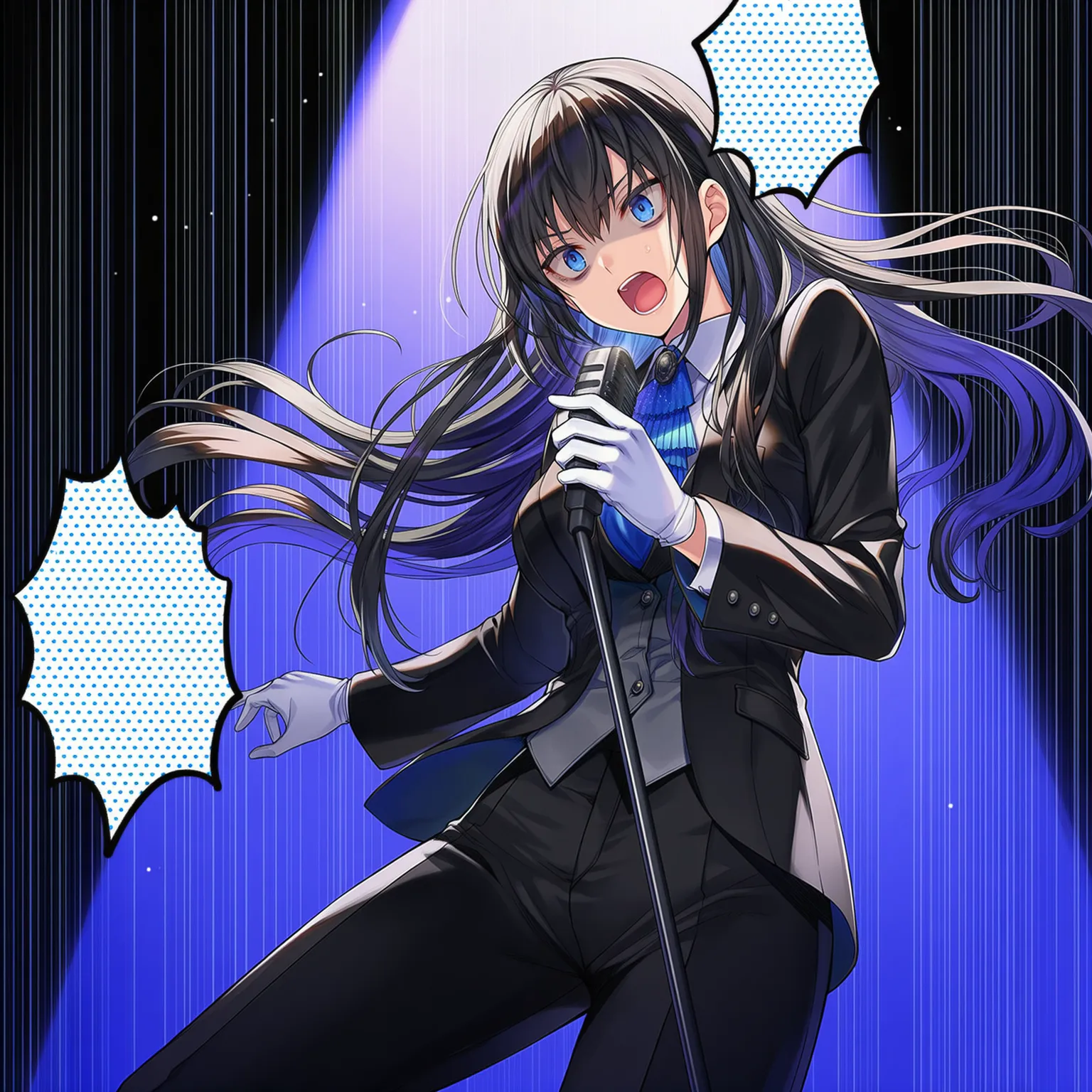 Description: {{{2020s game cg}}},1girl,blue eyes,{tsurime},black hair,long hair,straight hair,bags eyes,black suit,white gloves,white victorian shirt,black pants,location,dark,shaded eyes,blue layered tie,holding microphone by one hand,open mouth,singing,Spotlight,anguished,speech bubbles,dynamic pose,, very aesthetic, masterpiece, no text, -2::upscaled, blurry::,