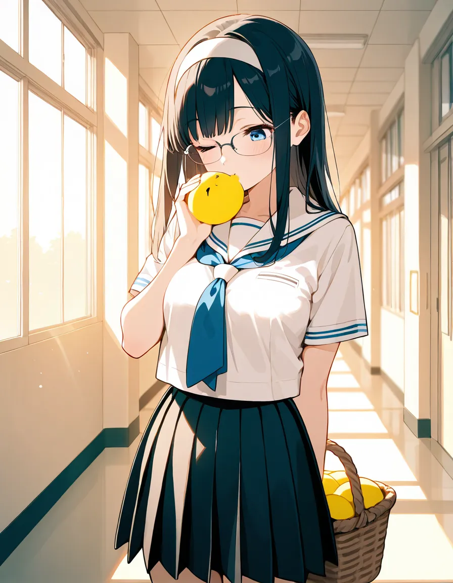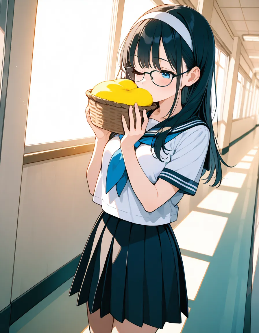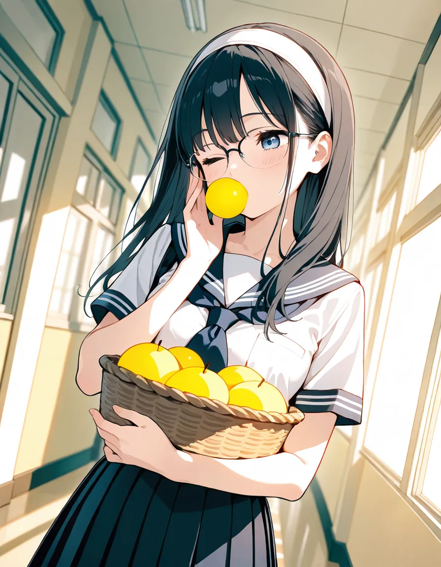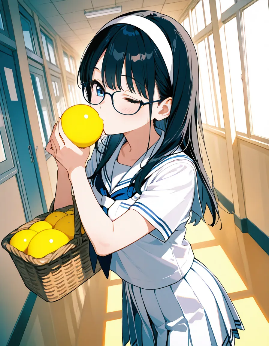 parameters: ((masterpiece)), ((best quality)), (ultra-detailed), ((kawaii)), cute, (lovely), (abstract art style illustration), school, (at a hallway:1.3), 1girl, cute girl, (Dutch angle shot:1.2), 1girl, cute girl, (beautiful blue eyes), (beautiful black hair), (long hair), (white hairband), slim, slender, medium breast, (glasses), (winking:1.2), (one eye closed), (happy smiles:1.3), (kissing a piece of ginger she picked up:1.3), (holding a basket of Gingers:1.2), (white serafuku), (short sleeves), (pleated skirt), (soft natural lighting), warm color tones, detailed background, delicate facial features, light breeze, romantic atmosphere, soft shadows, (cute pose).