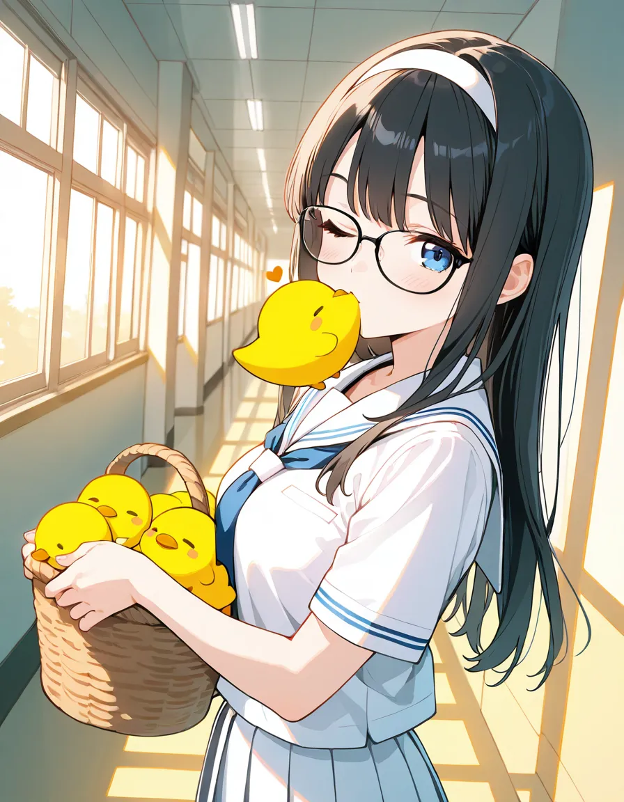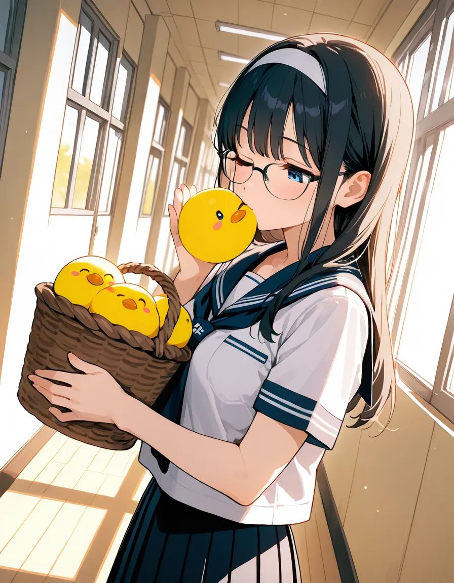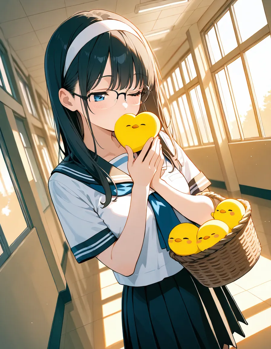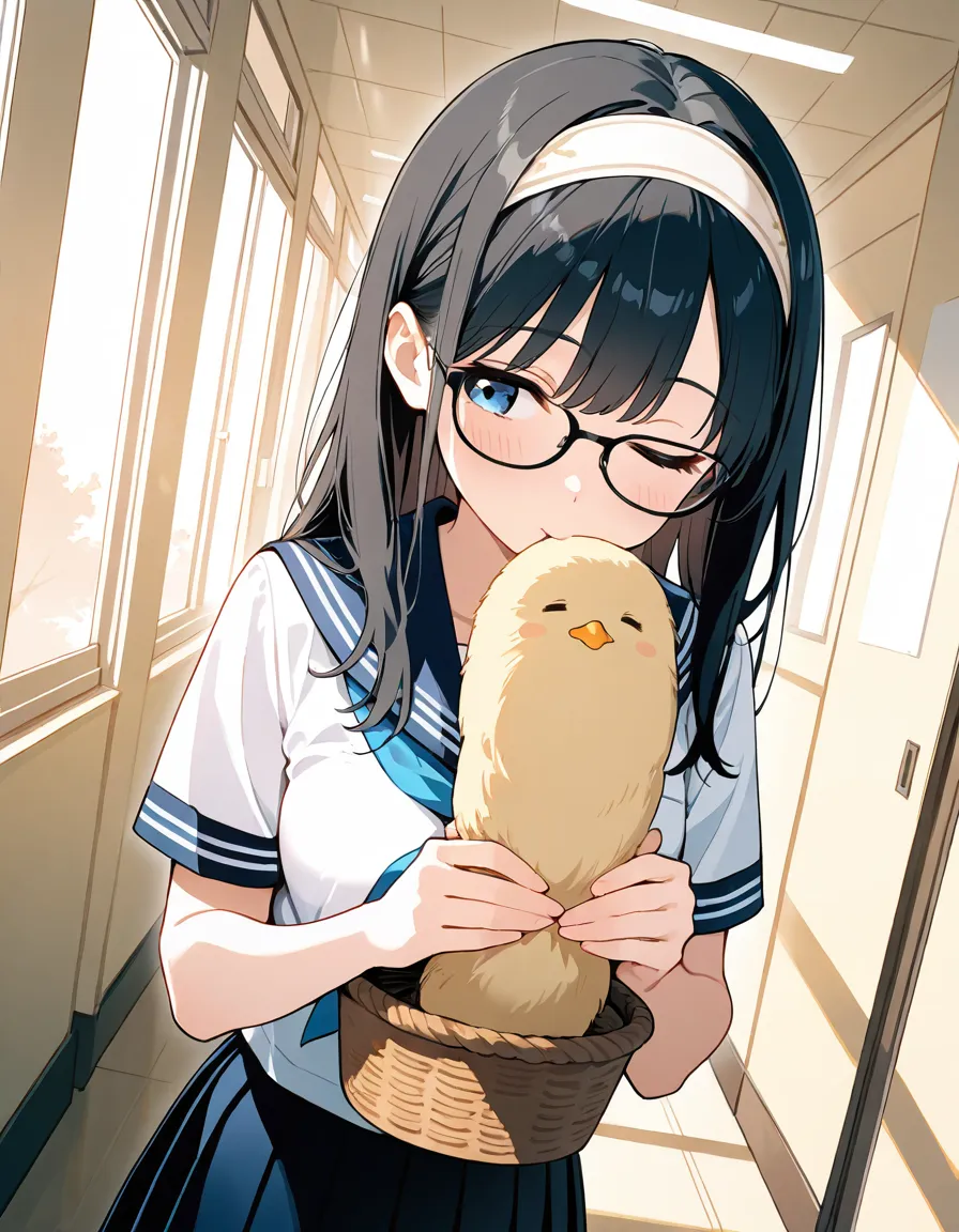 parameters: ((masterpiece)), ((best quality)), (ultra-detailed), ((kawaii)), cute, (lovely), (abstract art style illustration), school, (at a hallway:1.3), 1girl, cute girl, (Dutch angle shot:1.2), 1girl, cute girl, (beautiful blue eyes), (beautiful black hair), (long hair), (white hairband), slim, slender, medium breast, (glasses), (winking:1.2), (one eye closed), (happy smiles:1.3), (kissing a piece of ginger she picked up:1.3), (holding a basket of Gingers:1.2), (white serafuku), (short sleeves), (pleated skirt), (soft natural lighting), warm color tones, detailed background, delicate facial features, light breeze, romantic atmosphere, soft shadows, (cute pose).