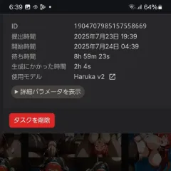 火曜日の朝 待ち時間 0やと表示が無くなります 待ち時間 で 生成26 で 60枚くらい作りました♪ 今朝までかかったやつは 下記のとおりです 提出時間 2025年7月23日 19:39 開始時間 2025年7月24日 04:39 待ち時間 8h 59m 23s 生成にかかった時間 3h 37m 17s …やばい