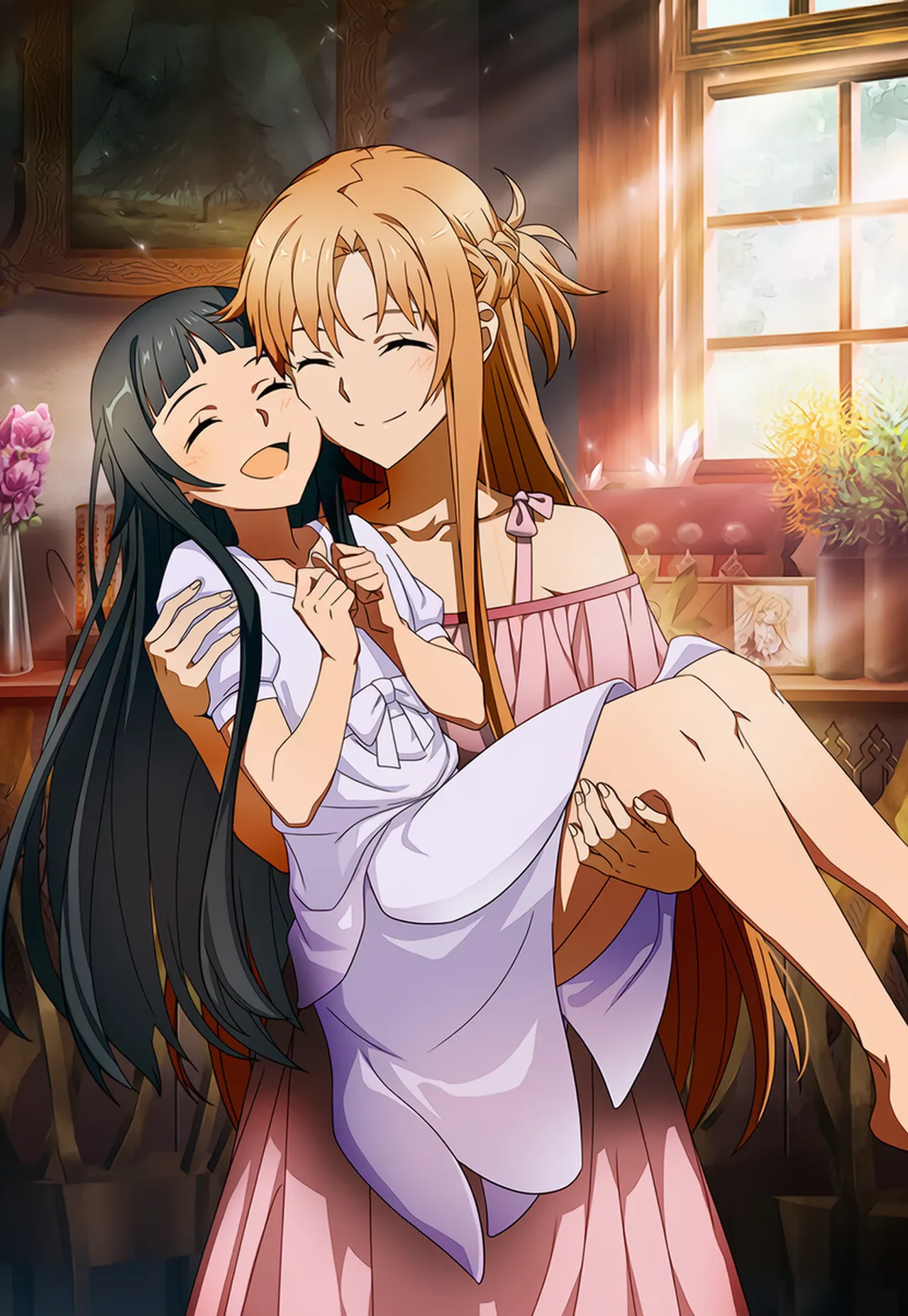 キャラクター 1 プロンプト: girl,asuna (sao),pink dress,smiling,smile,happy,source#princess carry,2::cheek-to-cheek::,2::cheek press::,nsfw