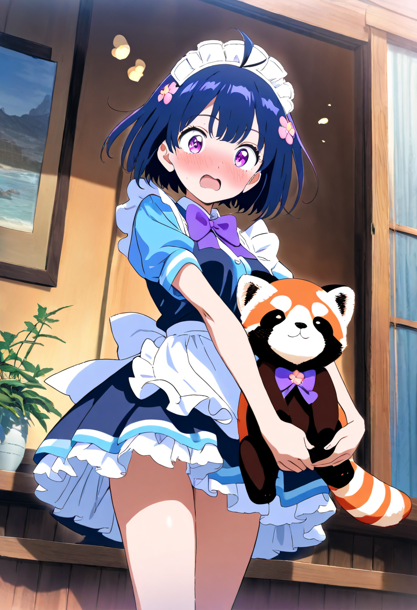 parameters: 1girl, solo, kawaii, 16yo, short height, medium breasts, maid, maid headdress, blue blouse, short sleeve, white collar, purple neck bow, white frilled apron, blue frilled skirt, beautiful detailed face and eyes, surprised, happy, blush, dark blue hair, short hair, bob, ahoge, flower hair ornaments, purple eyes, holding stuffed red panda , anime artwork, anime style, key visual, vibrant, studio anime, masterpiece, high score, great score, absurdres