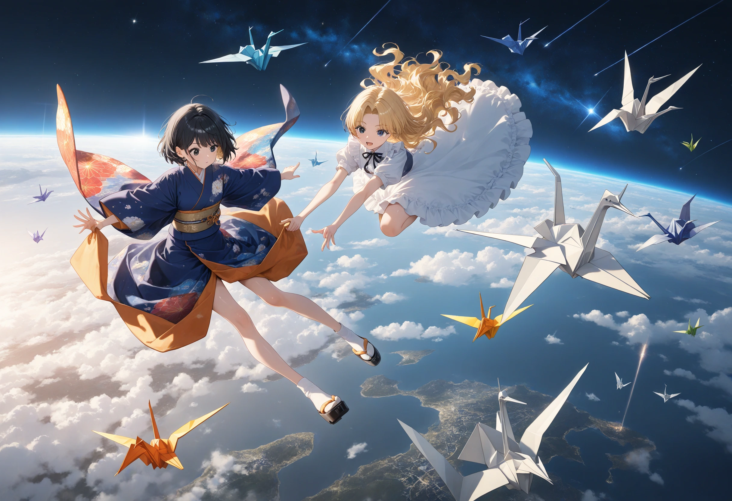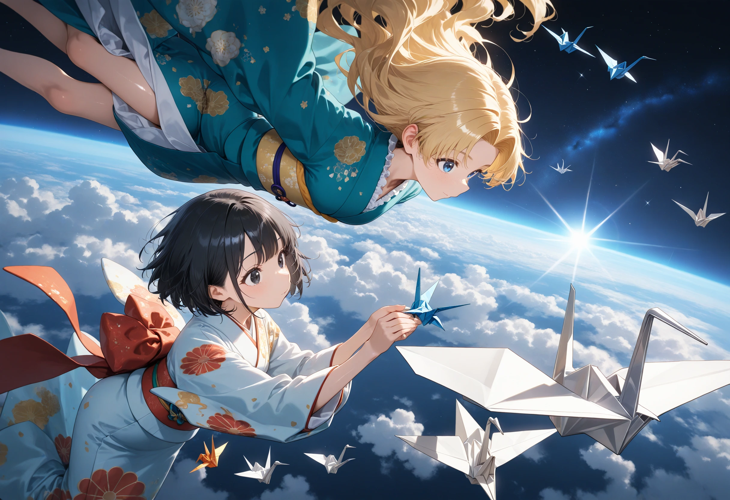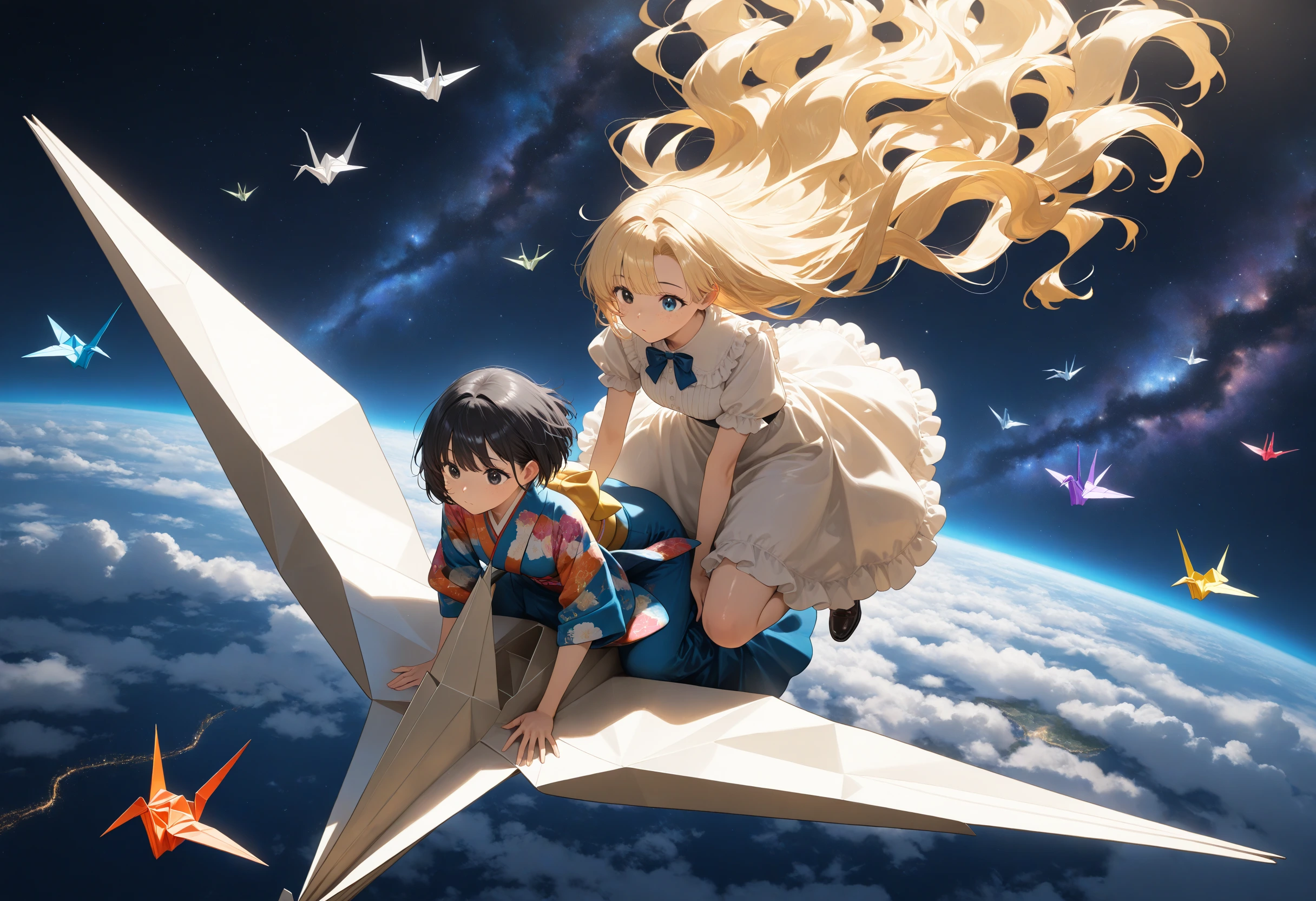 Black hair & blonde, origami cranes