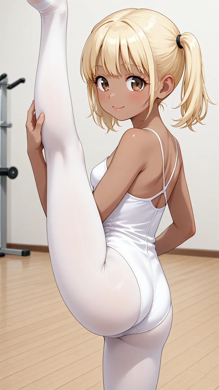 parameters: masterpiece, best quality, ultra high definition, incredibly absurdres, anime, petite, cute, pretty, adorable, charming, lovely, absurdly beautiful teenage, dark skin, small medium breasts, small round face, yellow blonde hair, bangs, twintails, hair tie, brown eyes, tareme, eyelashes, clear lip, white pantyhose, leotard, ballet studio, one leg up, (navel:-1.5), smile,