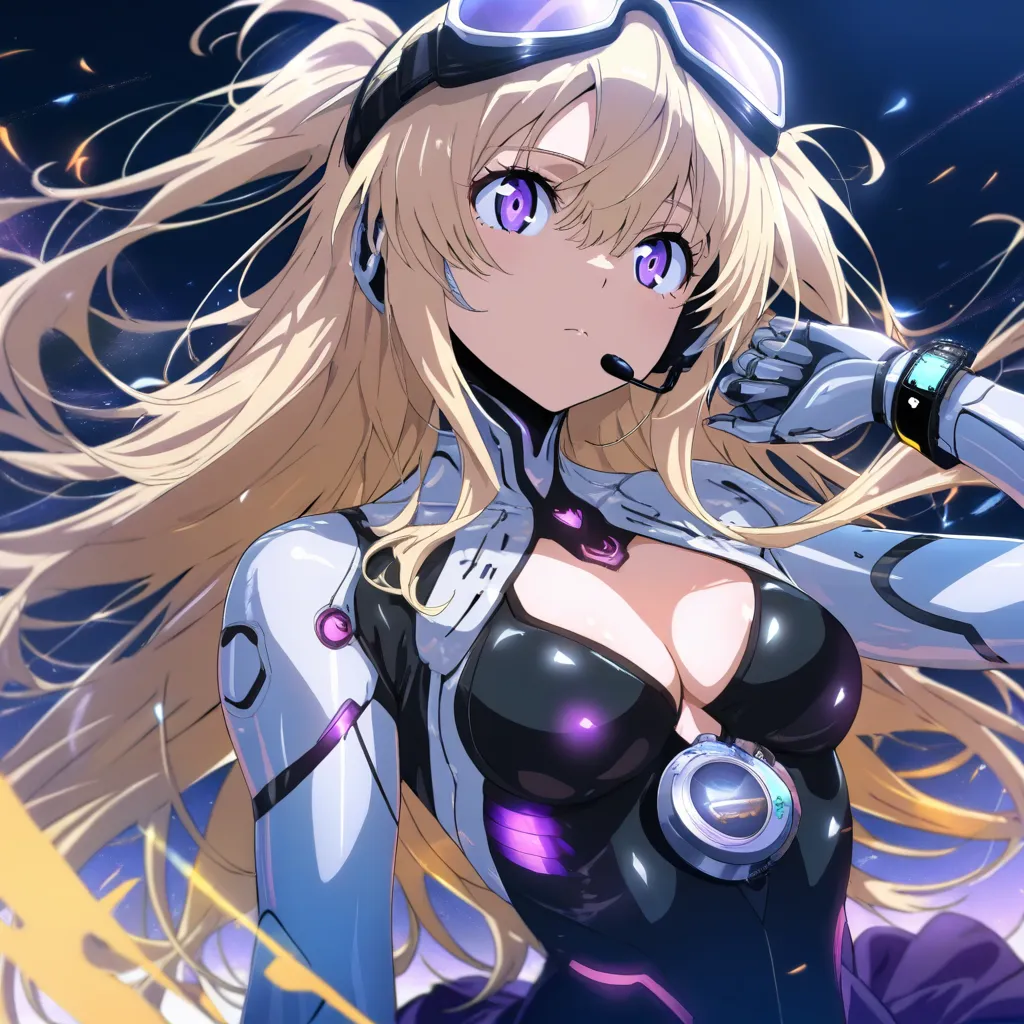 parameters: {"prompt": "1girl, solo, 15yo, small breasts, cyborg, metal body, cleavage, metal arms, skirt, metal legs, (smart watch:1.5), beautiful detailed face and eyes, expressionless, blond hair, long hair, shiny hair, two side up, hair intakes, hair between eyes, (goggles on head:1.2), headset, purple eye, hand up, portrait, (sf:1.3), anime artwork, anime style, key visual, vibrant, studio anime, masterpiece, high score, great score, absurdres, masterpiece, high score, great score, absurdres", "negative_prompt": "lowres, bad anatomy, bad hands, text, error, missing finger, extra digits, fewer digits, cropped, worst quality, low quality, low score, bad score, average score, signature, watermark, username, blurry", "resolution": "1024 x 1024", "guidance_scale": 5, "num_inference_steps": 28, "style_preset": "(None)", "seed": 2109312628, "sampler": "Euler a", "Model": "Animagine XL 4.0", "Model hash": "6327eca98b", "use_upscaler": null}