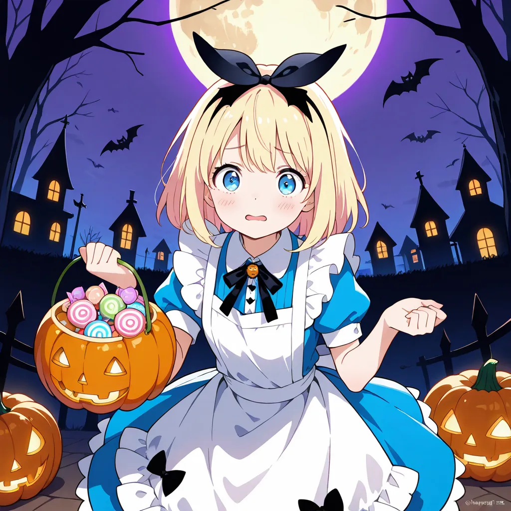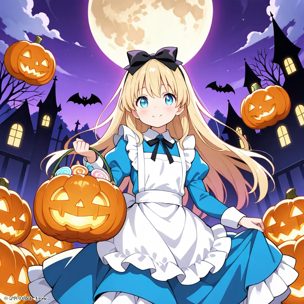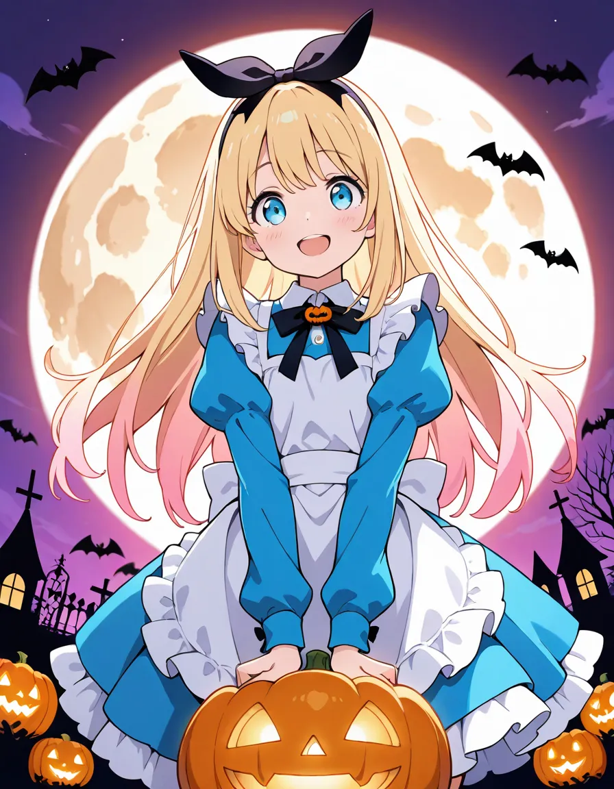 parameters: ((masterpiece)), ((best quality)), (ultra-detailed), ((kawaii)), cute, (lovely), storybook illustration style, 1girl, cute girl, (solo), Alice from Wonderland, wandering through a whimsical Halloween world, wearing her iconic blue dress with white apron but accented with spooky Halloween details, (happy expression), surrounded by glowing jack-o’-lanterns, eerie twisted trees, floating candy, friendly ghosts, and a full moon in the night sky, in a magical fantasy art style, highly detailed, vibrant colors, atmospheric lighting, Fantastic atmosphere.