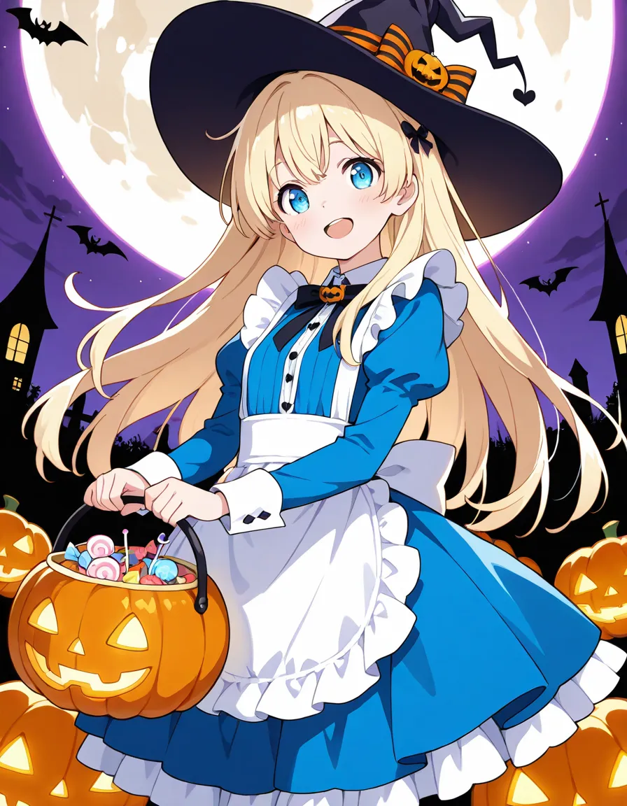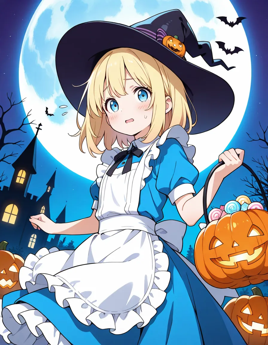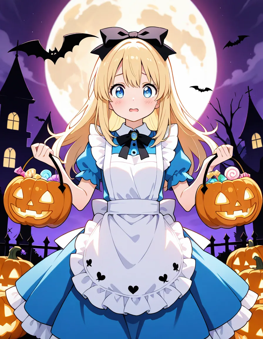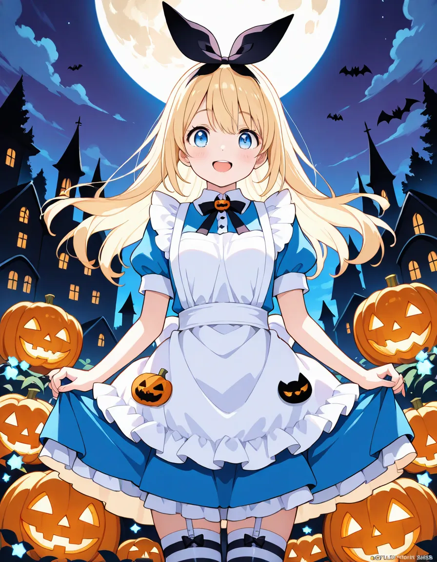 parameters: ((masterpiece)), ((best quality)), (ultra-detailed), ((kawaii)), cute, (lovely), storybook illustration style, 1girl, cute girl, (solo), Alice from Wonderland, wandering through a whimsical Halloween world, wearing her iconic blue dress with white apron but accented with spooky Halloween details, (happy expression), surrounded by glowing jack-o’-lanterns, eerie twisted trees, floating candy, friendly ghosts, and a full moon in the night sky, in a magical fantasy art style, highly detailed, vibrant colors, atmospheric lighting, Fantastic atmosphere.