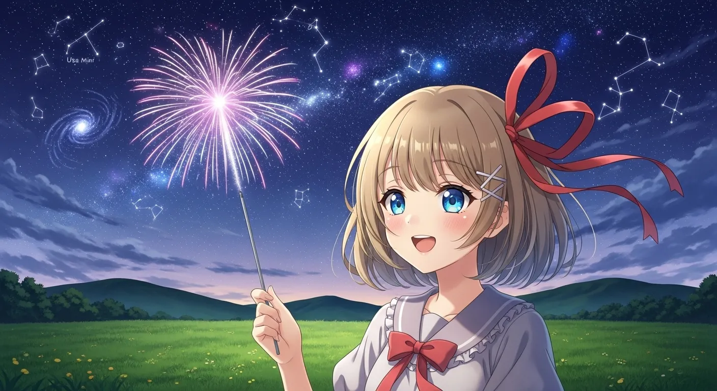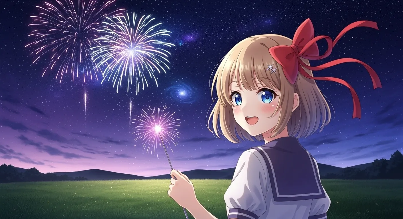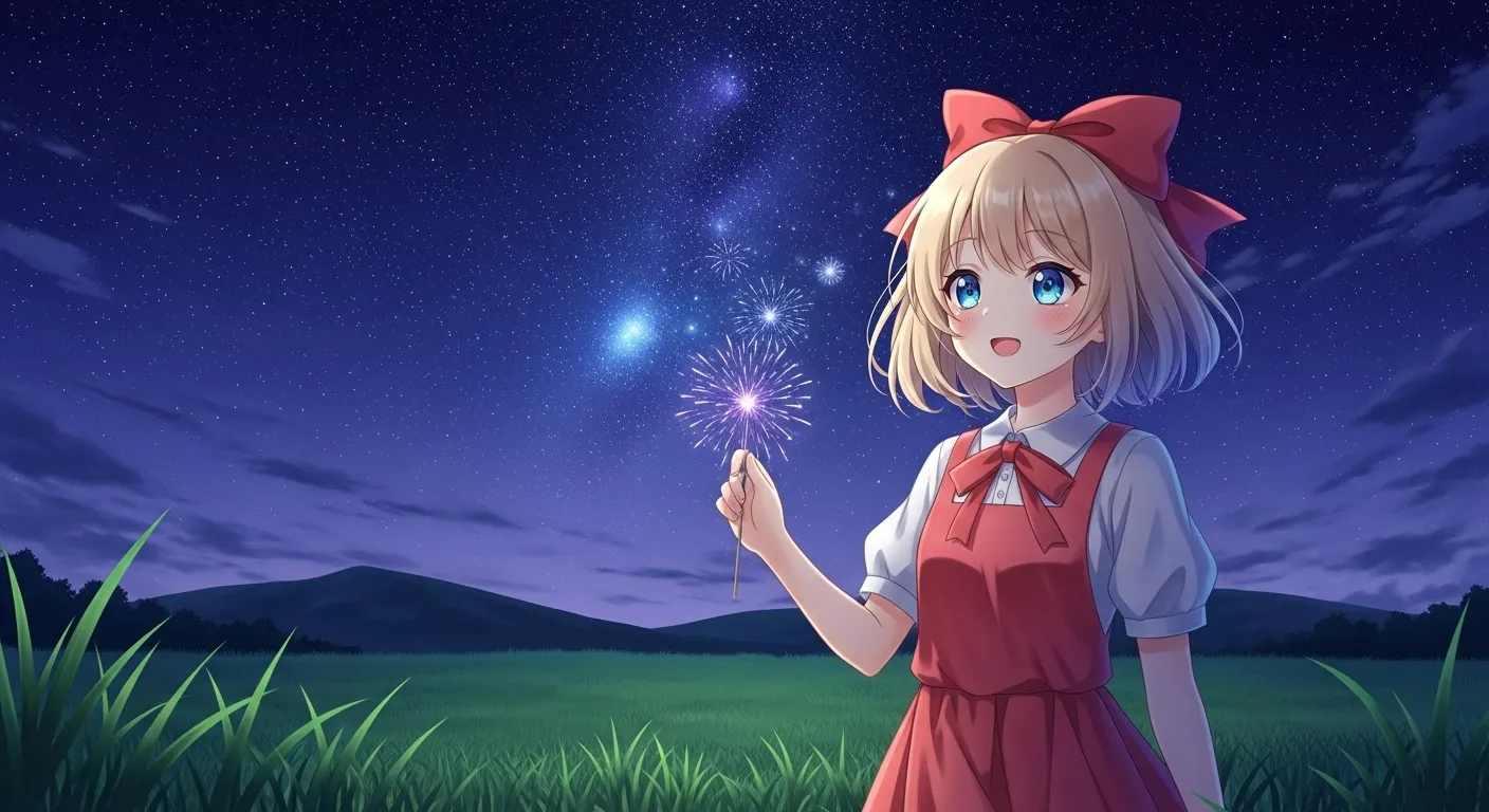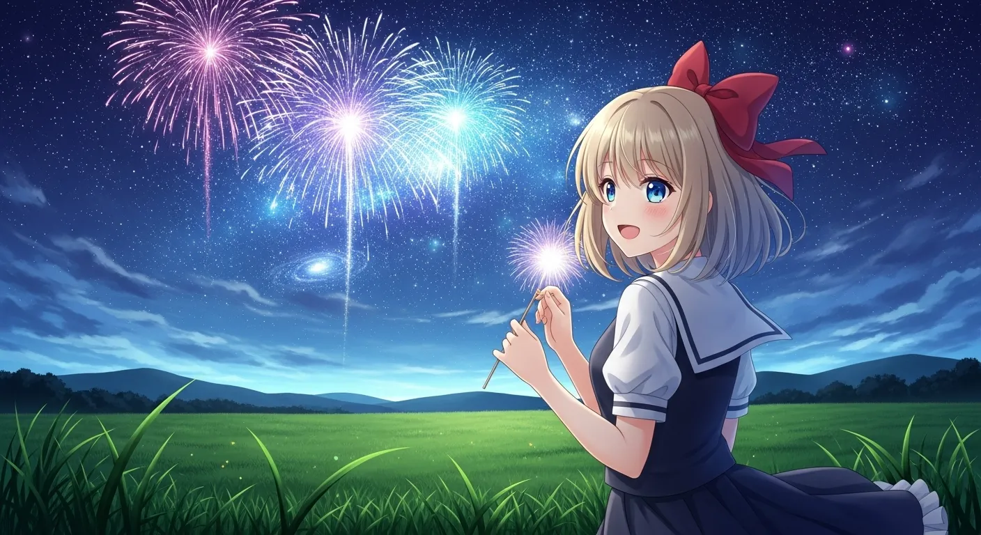 草原で花火を楽しんでいるムスメさんです