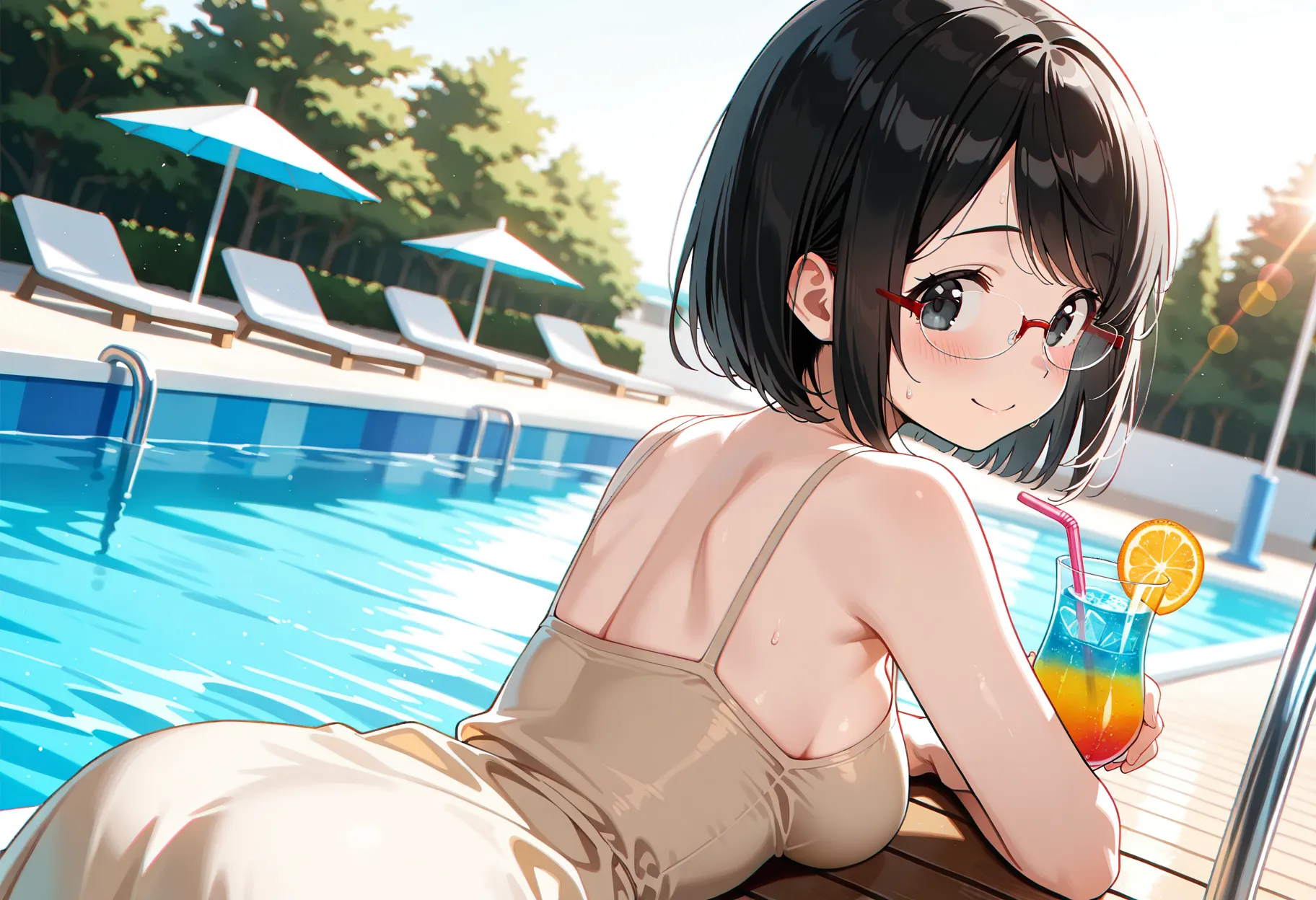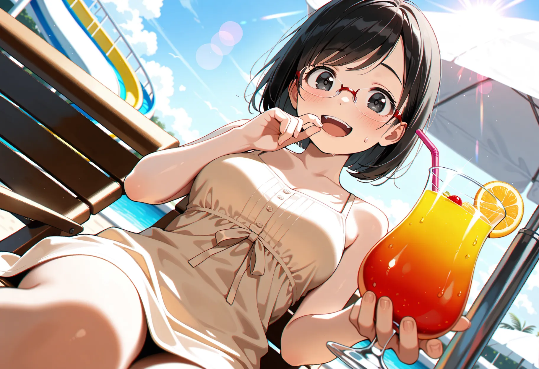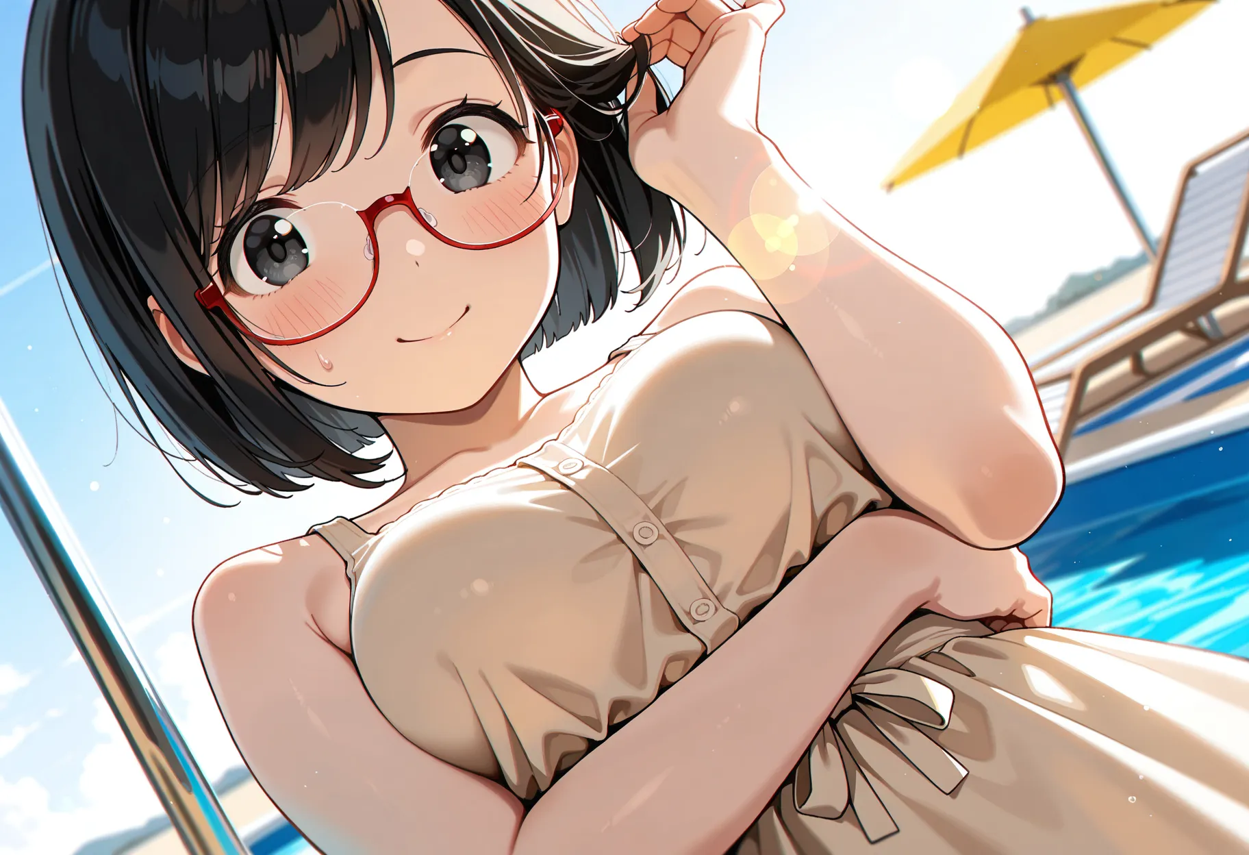 Steps: 25, Sampler: Euler a, Schedule type: Automatic, CFG scale: 5, Seed: 2017171479, Size: 1216x832, Model hash: bdb59bac77, Model: waiNSFWIllustrious_v140, Denoising strength: 0.4, Clip skip: 2, ENSD: 31337, Hires prompt: "masterpiece,best quality,amazing quality, general,\n1girl, 18yo, short bob cut, black hair, swept bangs, black eyes, tareme, medium breasts, japanese, \nred semi-rimless eyewear, sharp eyelashes,\nbeige dress swimsuit, sundress, \nholding tropical drink, blush, sweatdrop, fidgeting, looking side, facing away, smile, \nsunlight, backlighting, outdoors, poolside, water slide, beach umbrella, beach chair,\nchromatic aberration, lens flare, from above, looking at viewer, dutch angle, ", Hires CFG Scale: 7, Hires upscale: 1.5, Hires upscaler: Nearest, TI hashes: "NEGATIVE_HANDS: 1411f312e096, negativeXL_D: fff5d51ab655, NEGATIVE_HANDS: 1411f312e096, negativeXL_D: fff5d51ab655", Version: f1.0.0v2-v1.10.1RC-latest-2443-g1a25b0ee