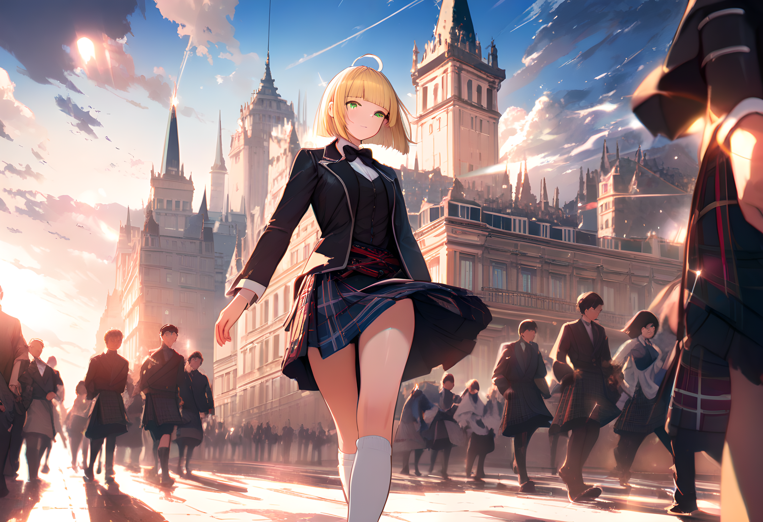 parameters: landscape,1boy,ahoge,short hair,straight hair,blunt bangs,hime cut,blonde hair,green eyes,delicate face,detailed face,detailed skin,masterpiece,best quality,insanely detailed,beautiful,8k,a lot of people,in the afternoon,vibrant academia,in focus with blurred background,bare thighs,(walking:1.3),outside,with clouds,absurdres,shining lights,dynamic lighting,shiny hair,sparkle,windy,classic academia,lens flare,sunlight,bloom,soft lighting,in the town,wide view,palace,Scotland,ancient castle,sunbeam,scottish,(a leather sporran on the front of Kilt:1.5),(white kneehigh socks:1.5),black bowtie,(wearing a traditional Scottish short kilt and black formal jacket :1.5) , , <lora:make25d_type1_v100:0.7> <lora:saturation:0.6> <lora:hadanuri1:0.7> <lora:eyecolle_freesia_v100:0.7>