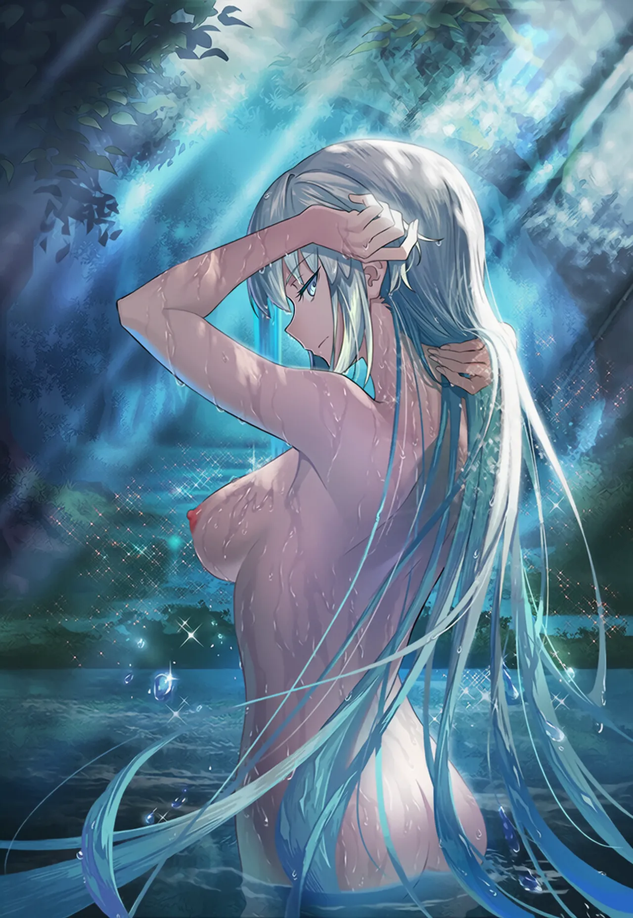 'FGO','Fate/Grandorder','モルガン(Fate)','全裸','水浴び','綺麗','腋見せのポーズ'