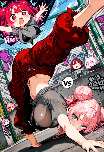 parameters: (best quarity:1.5, ultra high resolution, 8K, masterpiece), (shiny skin, extremely detailed, perfect anatomy, very aesthetic), (comic, speech bubble, frame, focus line, comic expression, sound effect), (chibi:1.3), (2+ girls), large breasts, large eyes:1.2, plump, (blonde hair, bare forehead, show off forehead, short puffy ponytail), (grey T-shirt, black bikini top, bikini top under T-shirt:1.2, see-through T-shirt, cargo pants, bare foot), (capoeira, handstand, top-down, bottom-up, hand on ground, legs kick in air), (v shaped eyebrows, blush, playground, outdoor), dutch angle, (super fine illustration, photorealistic, depth of field:0.4), <lora:hairdetailer:0.8>