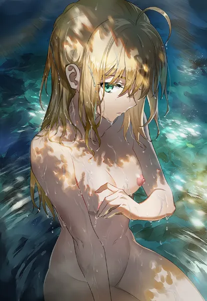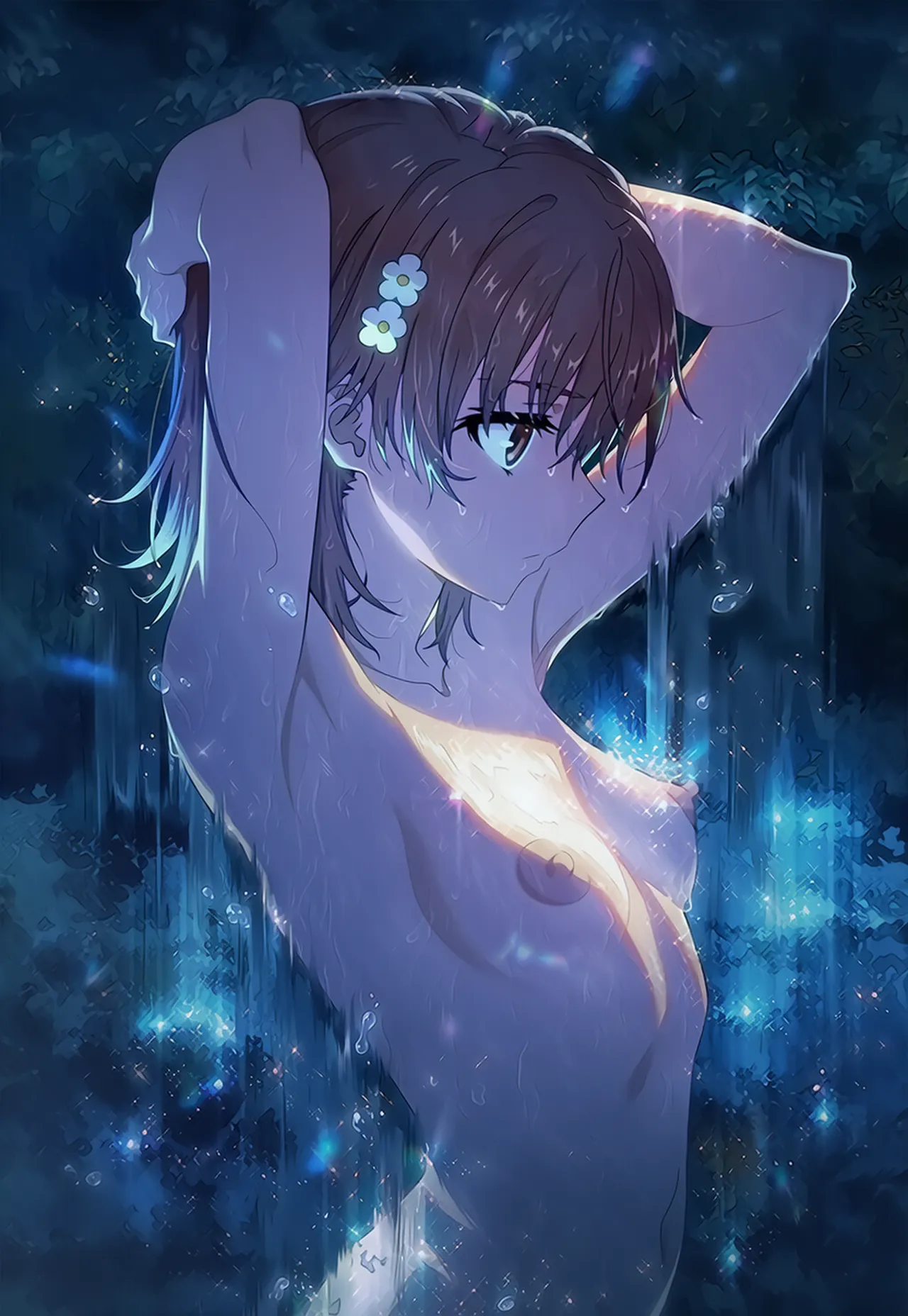 キャラクター 1 プロンプト: misaka mikoto (anime),cowboy shot,profile,abstract,dripping,splashing,covering chest by hand,armpits,armpits focus,arms up,cool beauty,profile,5::nude::,2::nsfw::,3::nipple::,from above,soaked,profire,upper body, wet hair