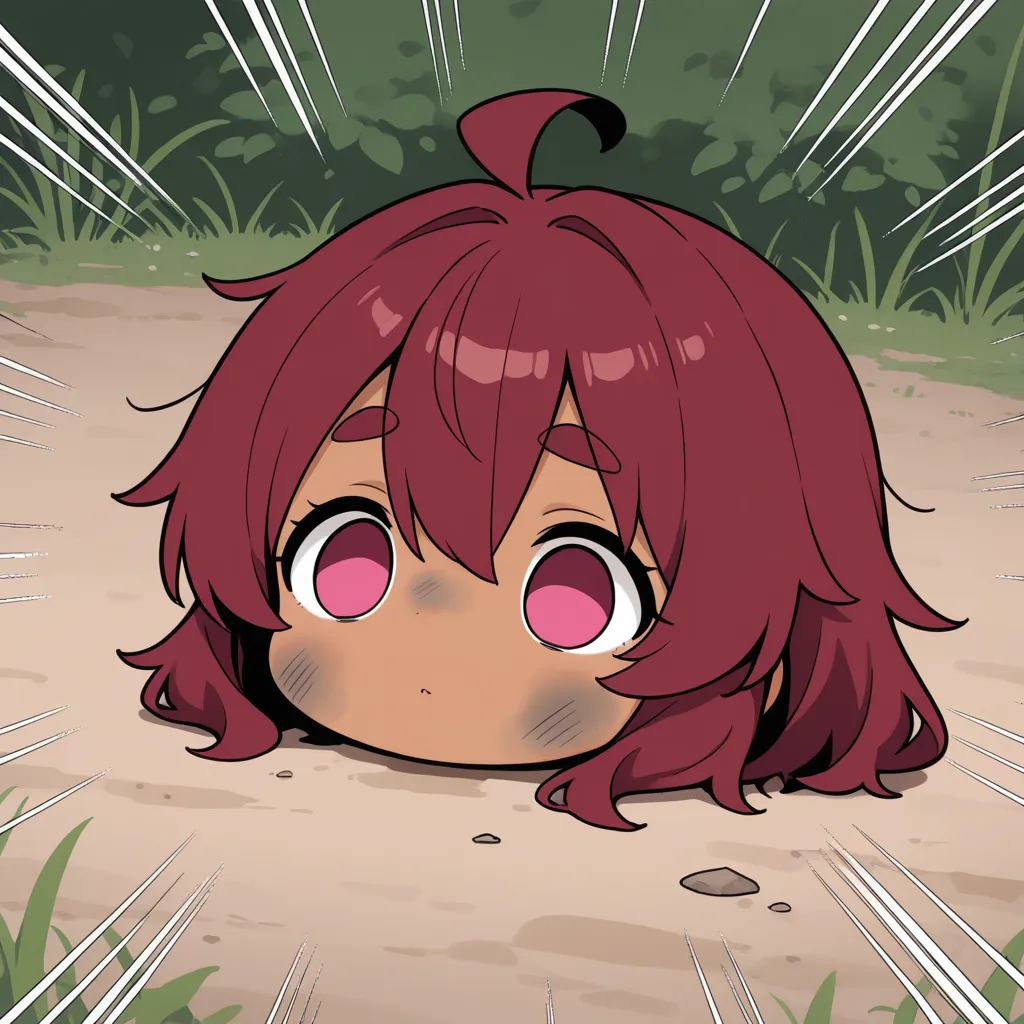1girl, loli, dark red hair, short hair, kinky hair, hair between eyes, ahoge, thick eyebrows, tareme, raised eyebrows, pink eyes, flat chest, thick thighs, (brown-skinned female:1.7),
