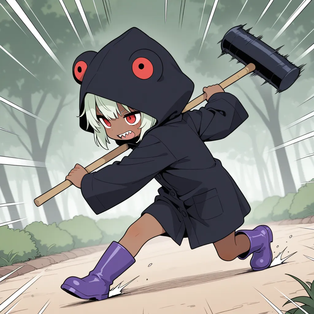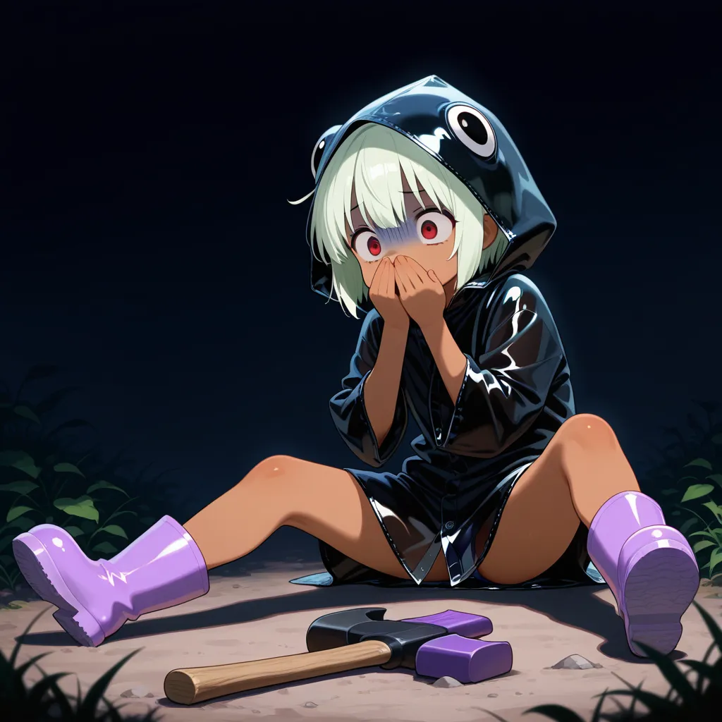[black raincoat, black frog hood, (oversized clothes:0.2):see-through raincoat, see-through hood, purple bikini, side-tie bikini bottom:0.8], purple rubber boots,