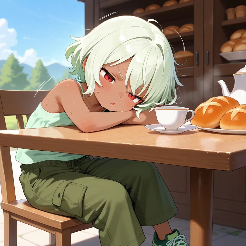 1girl, light green hair, short hair, red eyes, (brown-skinned female:1.2), flat chest, loli,