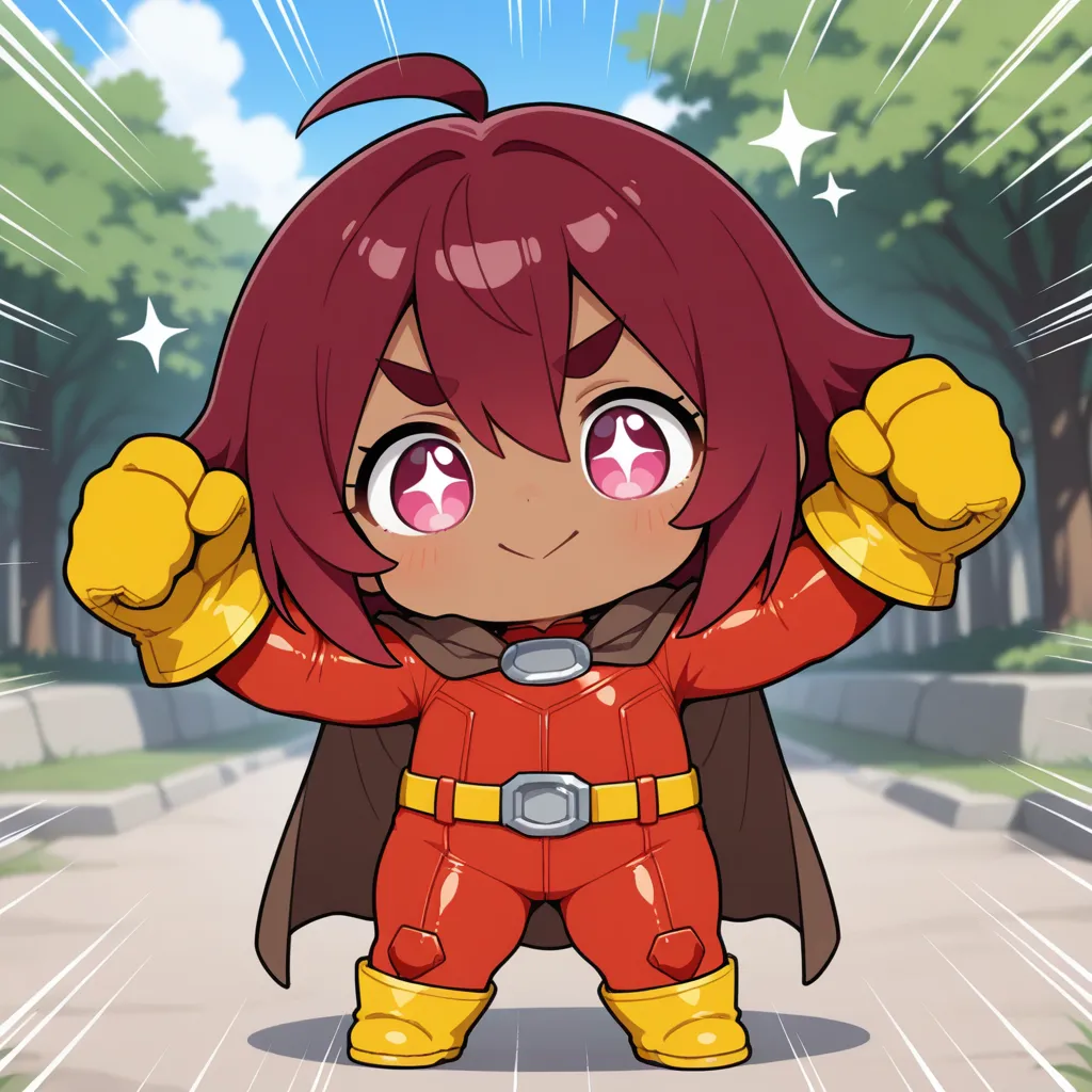 red bodysuit, yellow gloves, yellow footwear, yellow belt, brown long cape,