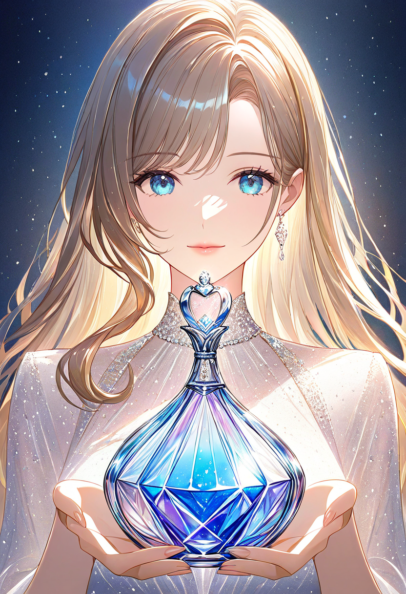 parameters: A beautiful woman holding a luxurious perfume bottle, designed in the style of studio art hand-blown glass, Sommerso technique, with elegant faceted details. The scene is refined and artistic, emphasizing the shimmering transparency and colorful layers of the glass. The woman looks graceful and sophisticated, with soft lighting that highlights both her beauty and the intricate perfume bottle.