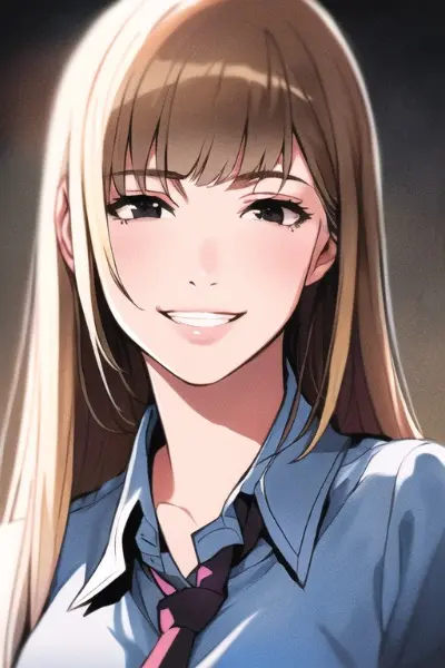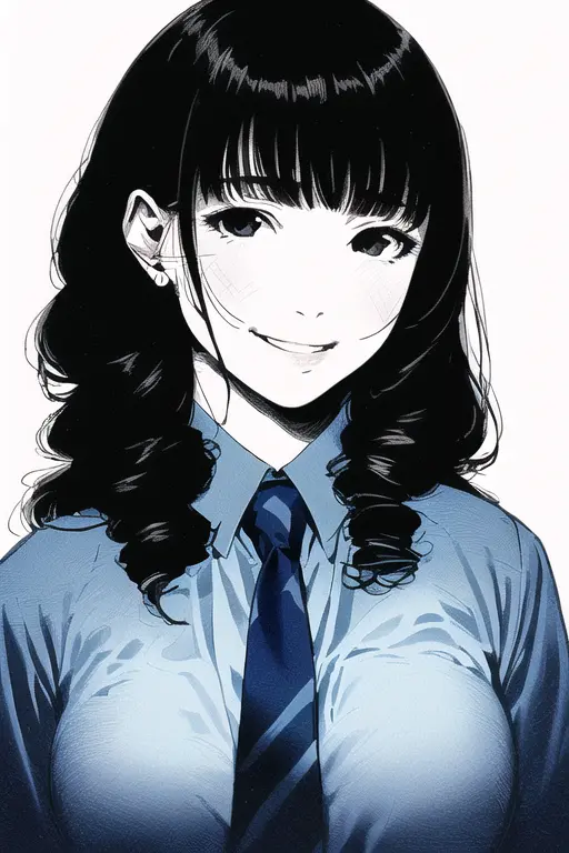 prompt: masterpiece, best quality, 1girl, official art work, 400 mega pixels, photoshop, {{delicate wisps of hair, Delicate and intricate lines hair}}, hyperrealistic, portrait-inspired rendering, inked lines, realistic, beautiful novel cover, blunt bangs, princess long hair, [loose curls], captivating black-haired, black ink lines, realistic body shadows, RAW date, lifelike pose, {{high-resolution-image}}, portrait of beautiful 1girl, solo, {{school uniform, blue shirt, necktie, detailed neck}}, chest swells, medium breasts, {cowboy shot}, [[nsfw]], proud smile, {{dignified pose}}, charming grin, mischievous smile, close-up-breasts, breasts focus, bend back, detailed clothes, gorgeous clothes , {photoshop}, {delicate, official portrait, official works}, {{Shading, gravure pose}}, {{Photorealistic}}, {delicate black ink lines},{squinting eyes},{{innocent smile}}, adorable, black eyes, innocent, natural beauty, radiant smile, expressive face, fine features, clear skin, rosy cheeks, slender neck, graceful posture, appealing design, cute gestures, heartfelt emotions,