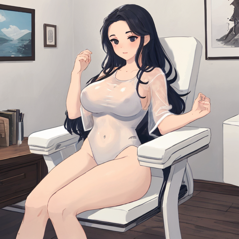 parameters: (The theme is a see-through rocking chair with five random types and sizes), create three using the theme items, skilfully (shape using theme items: girl in white swimsuit, fires large viscous white liquid which hits and adheres to chair, decorates with breath five times), shot from head to toe. Do not conceal the nose or forehead; cover with hair held in both hands. Ultra-detailed 4K image. , <lora:noline:1> <lora:hairdetailer:1>,