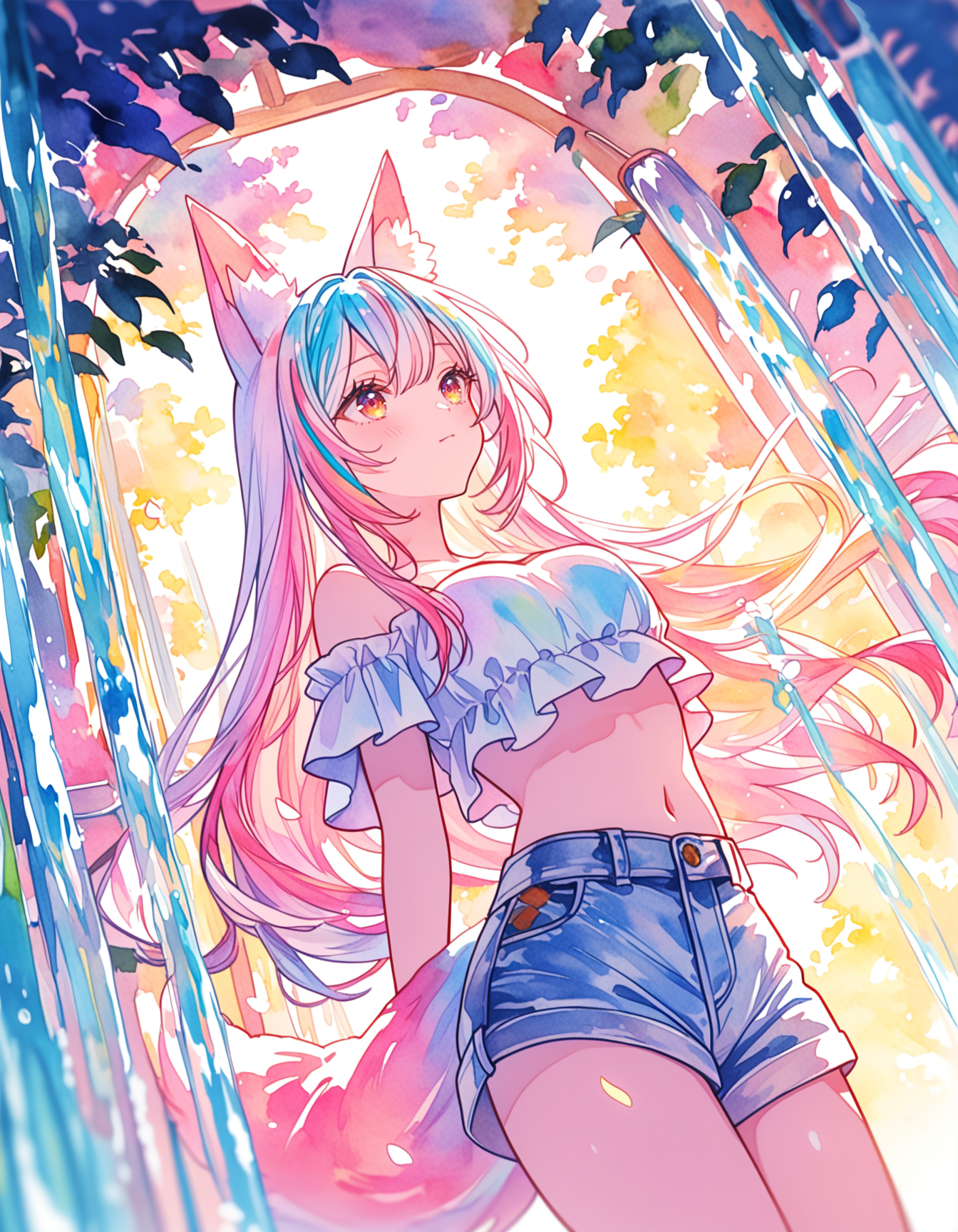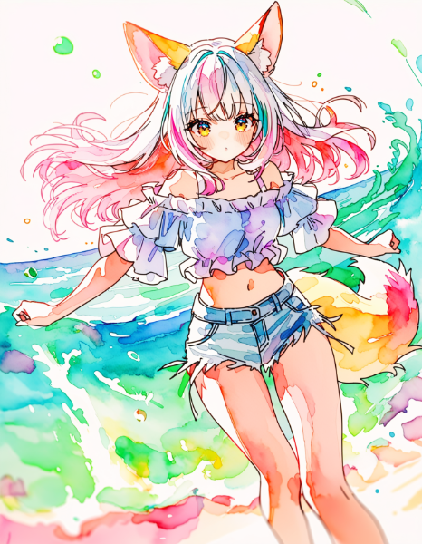 [{"keyword":"parameters","text":"1girl, animal ear fluff, animal ears, breasts, closed mouth, fox ears, fox tail, kemonomimi mode, long hair, midriff, multicolored hair, navel, pink hair, streaked hair, multicolored hair, colored inner hair, shirt, denim shorts, off shoulder crop top, short stack, short height, from below, dynamic action, dramatic angle, dynamic angle, outdoor, nwaterfalls, french window,mountain sunset, nnbold clean lines, colorful, fantasy elegance, ethereal, dreamy, (watercolor:1.2), (shoujo art style:1.3), elegant soft outlines, (vibrant watercolor tones:1.2), dramatic shadows, dappled light, chromatic aberration, overexposure, motion blur, dreamy setting,nNegative prompt: worst quality,bad quality,jpeg artifacts,(bad hands,bad finger,anatomy),(artist name,copyright name, watermark, text,english text:1.2),(bad feet,bad toes),(3d),nSteps: 20, Sampler: DPM++ 2M SDE, Schedule type: SGM Uniform, CFG scale: 5, Seed: 1552870679, Size: 896x1152, Model hash: 2c2a75d561, Model: dreambox_v40, Denoising strength: 0.3, Clip skip: 2, Hires Module 1: Use same choices, Hires CFG Scale: 5, Hires upscale: 1.5, Hires steps: 10, Hires upscaler: 4x_foolhardy_Remacri, Emphasis: No norm, kohya_hrfix_enabled: True, kohya_hrfix_block_number: 3, kohya_hrfix_downscale_factor: 2, kohya_hrfix_start_percent: 0, kohya_hrfix_end_percent: 0.35, kohya_hrfix_downscale_after_skip: True, kohya_hrfix_downscale_method: bicubic, kohya_hrfix_upscale_method: bicubic, Mask blur: 4, Inpaint area: Only masked, Masked area padding: 32, ADetailer 0: "Ad Enabled: True, Ad Skip Img2img: False, Ad Model: face_yolov9c.pt, Ad Model Classes: , Ad Prompt: '', Ad Negative Prompt: '', Ad Detection Confidence Threshold: 0.3, Ad Mask Min Ratio: 0, Ad Mask Max Ratio: 1, Ad Mask K Largest: 1, Ad Mask X Offset: 0, Ad Mask Y Offset: 0, Ad Mask Erosion Dilation: 4, Ad Mask Merge Mode: None, Ad Inpaint Mask Blur: 4, Ad Inpaint Mask Denoising: 0.3, Ad Inpaint Only Masked: True, Ad Inpaint Only Masked Padding: 32, Ad Use Separate Width Height: False, Ad Inpaint Width: 512, Ad Inpaint Height: 512, Ad Use Separate Steps: False, Ad Steps: 20, Ad Use Separate Cfg Scale: False, Ad Cfg Scale: 3.5, Ad Use Separate Checkpoint: False, Ad Checkpoint: Use same checkpoint, Ad Use Separate Vae: False, Ad Vae: Use same VAE, Ad Use Separate Sampler: False, Ad Sampler: DPM++ 2M, Ad Use Separate Scheduler: False, Ad Scheduler: automatic, Ad Use Separate Noise Multiplier: False, Ad Noise Multiplier: 1, Ad Use Separate Clip Skip: False, Ad Clip Skip: 1, Ad Use Restore Face After Adetailer: False, Ad Controlnet Model: None, Ad Controlnet Module: None, Ad Controlnet Guidance Start: 0, Ad Controlnet Guidance End: 1, Ad Controlnet Weight: 1", Version: f2.0.1v1.10.1-previous-669-gdfdcbab6"}]