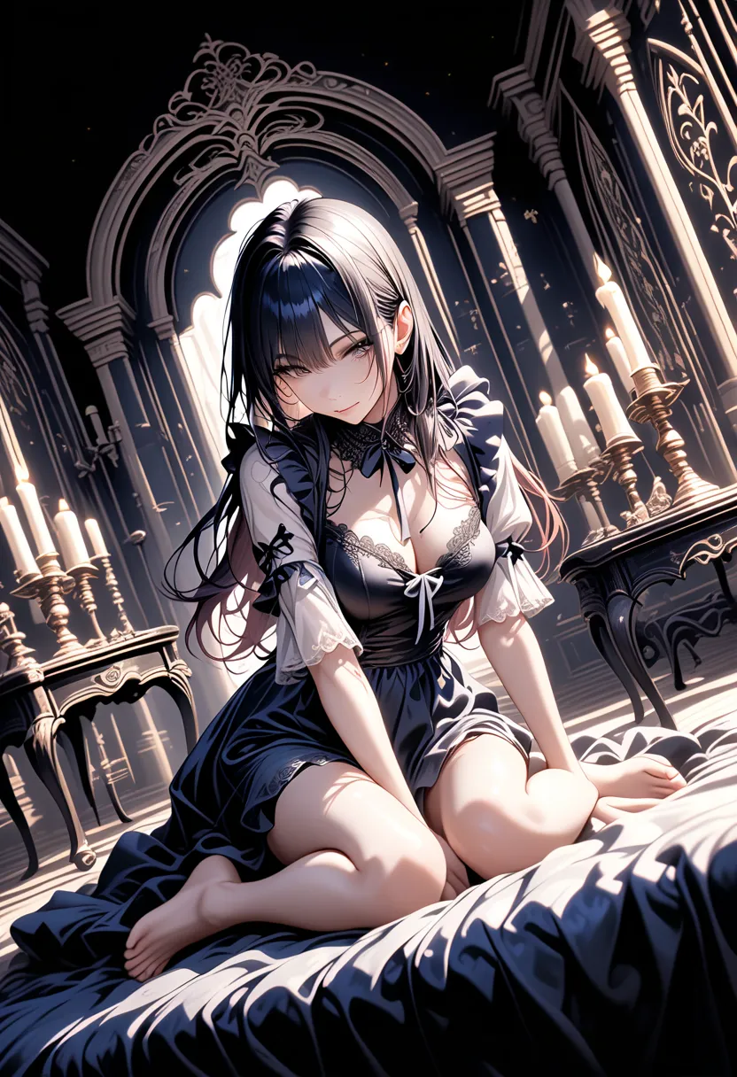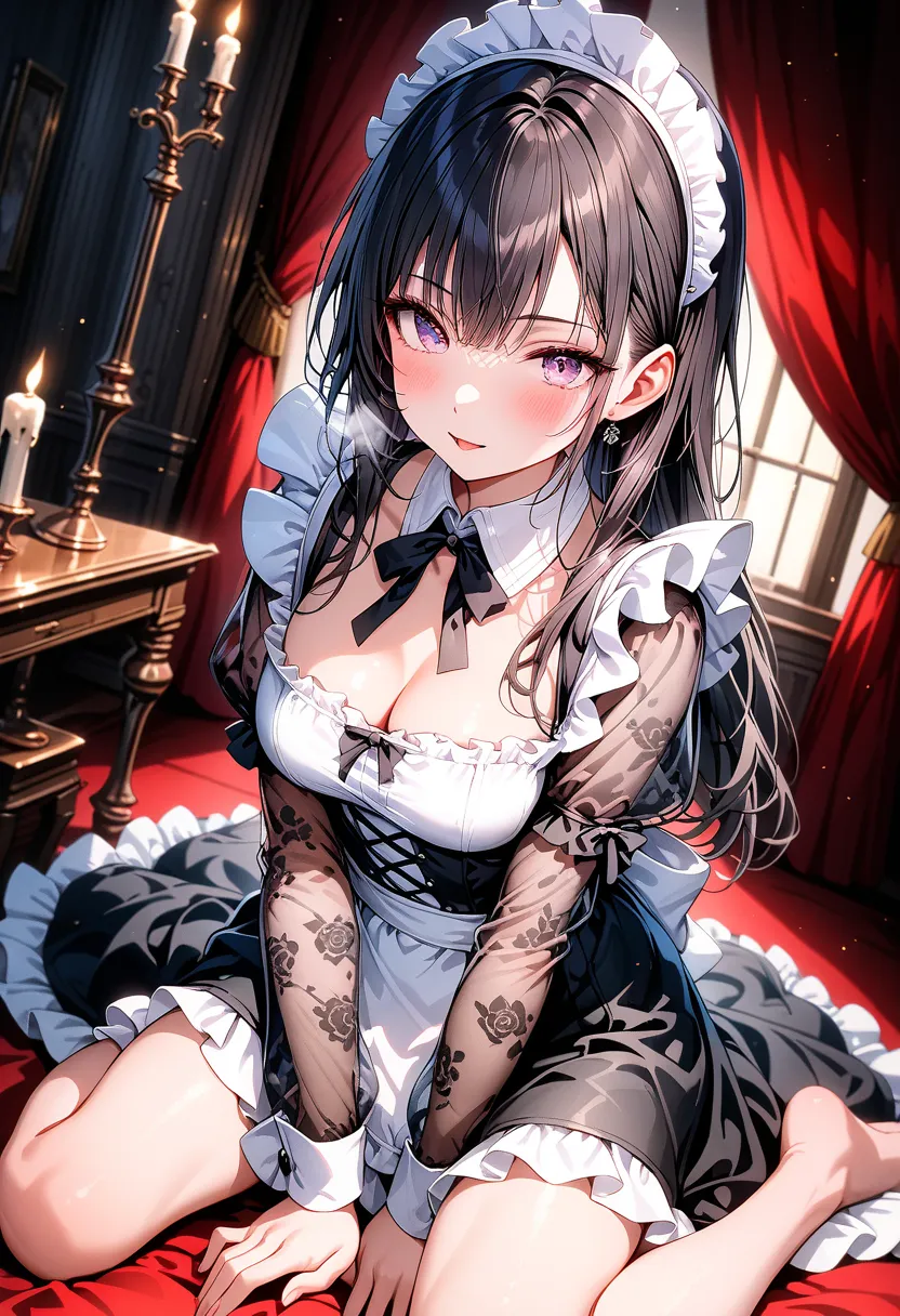 "Master, at this hour... If it's me, I'll be happy to assist," she murmurs with flushed cheeks while adjusting her chest. In a luxurious bedroom lit by candles, the black-haired maid's shy yet alluring gaze creates a quiet nocturnal temptation.