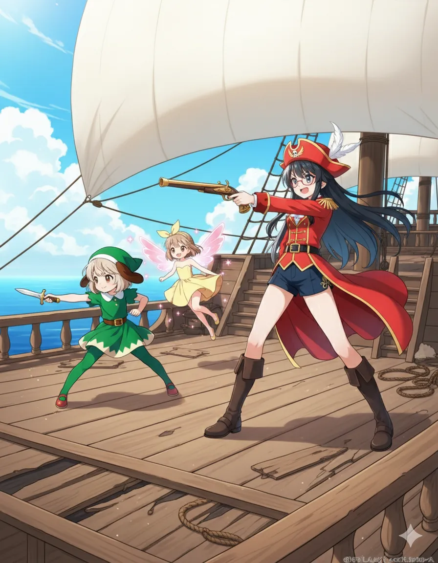 parameters: ((masterpiece)), ((best quality)), (ultra-detailed), ((kawaii)), cute, (lovely), anime style illustration, (beautiful black hair), (long hair), (beautiful blue eyes), (glasses), slim, slender, medium breast, ((beautiful breast)), (refreshing smile:1.3), open mouth, (fang),(happy smile:1.2), brave and beautiful girl as the central figure, wearing a majestic pirate captain outfit, (shorts), Exposed thighs, long ornate coat with gold embroidery, elegant tricorn hat with bright feather, (red socks:1.3), (confidently holding an antique flintlock musket in one hand:1.3), not firing, standing proudly at the center of the deck of a grand wooden sailing ship, large masts and billowing white sails behind, sparkling blue ocean, clear bright sky with fluffy clouds, radiant sunlight, cheerful adventurous atmosphere, heroic and fairy tale adventure feeling, strong central composition focusing on the captain.