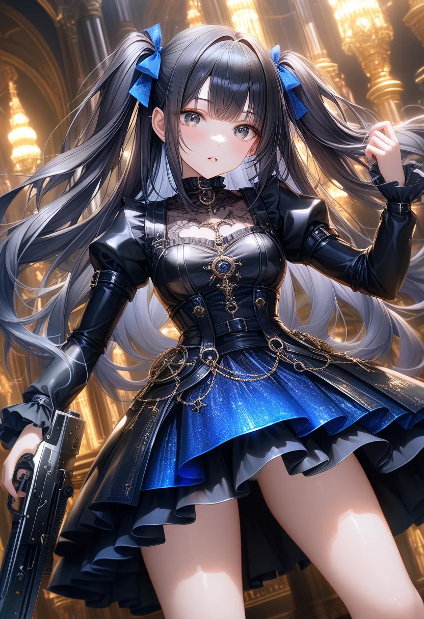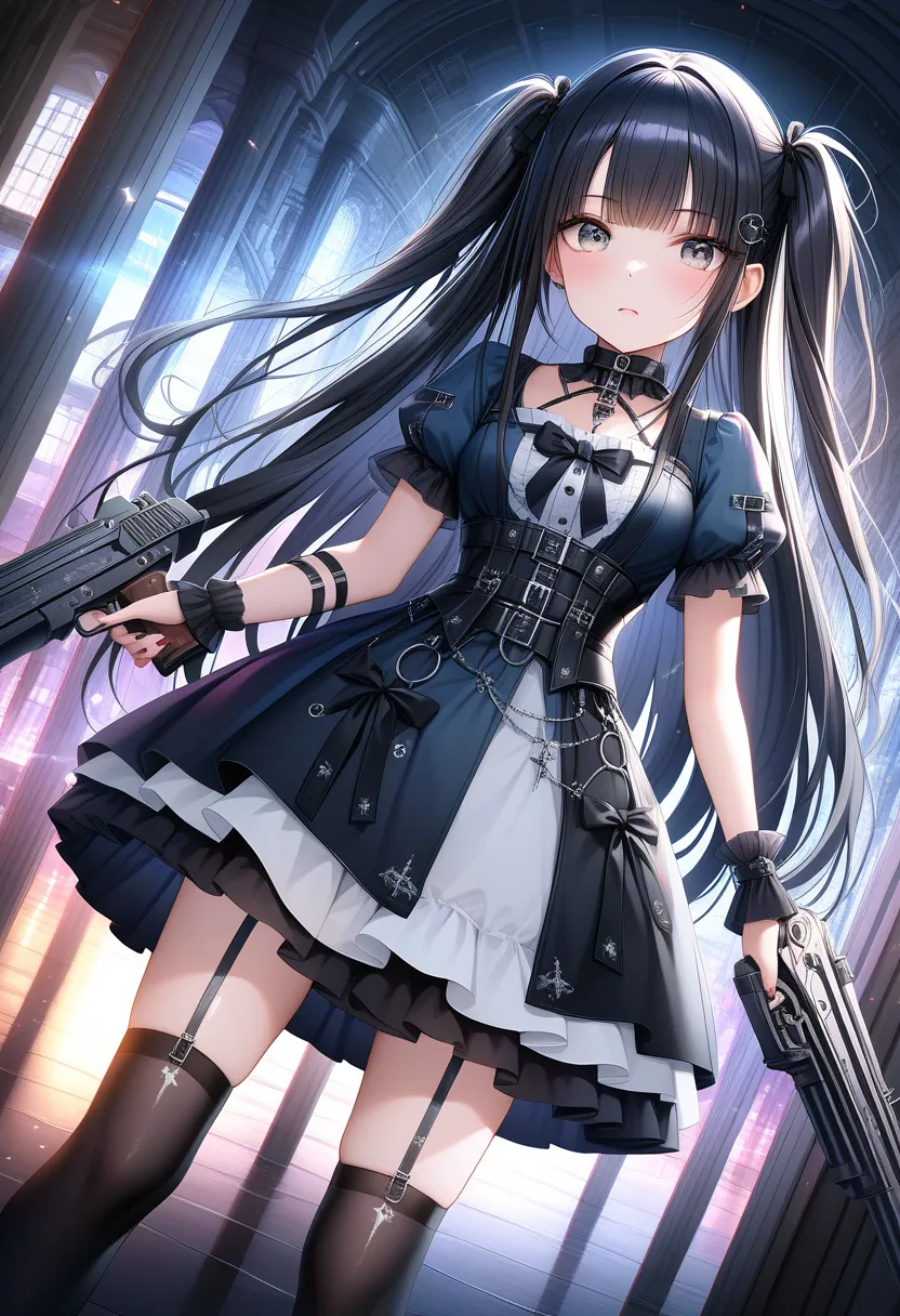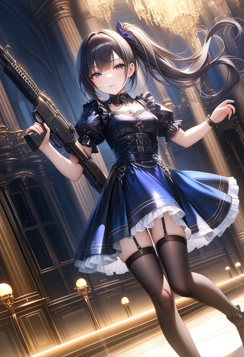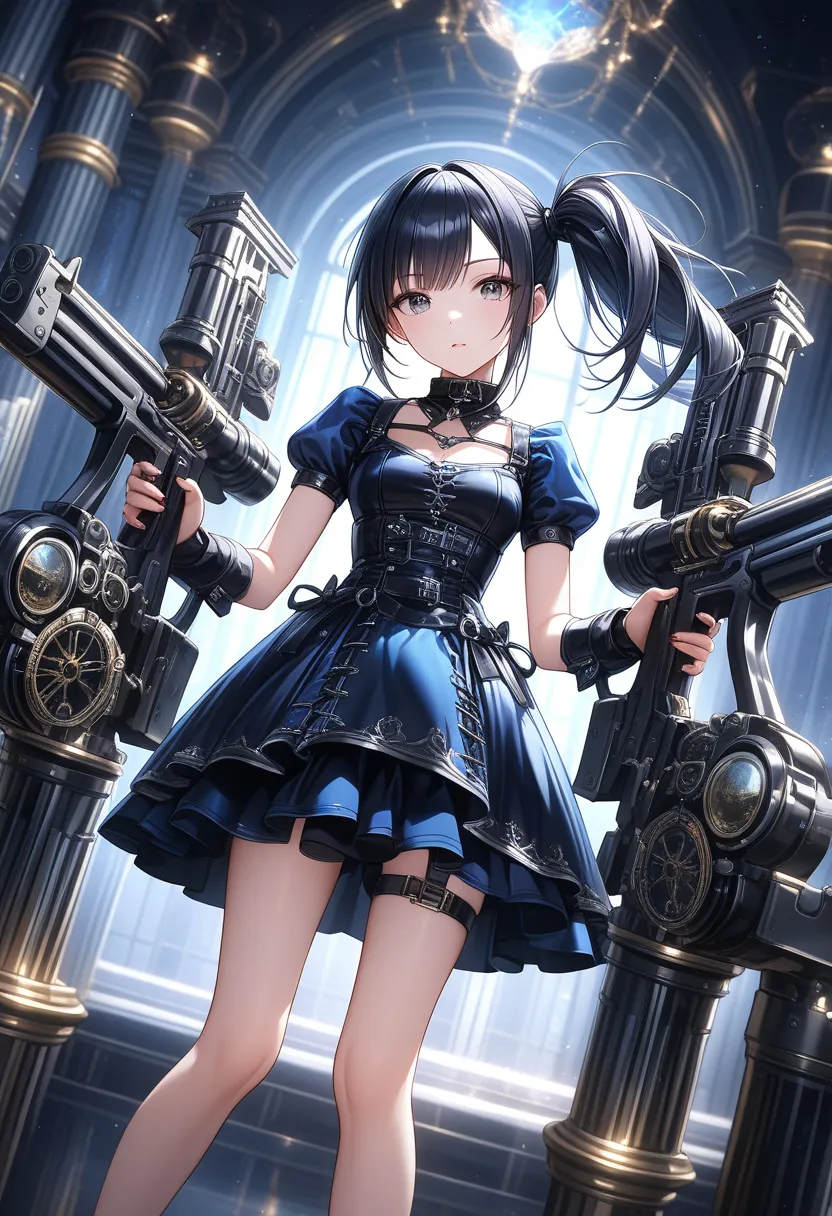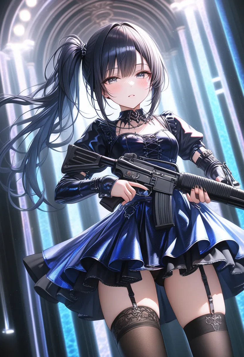 "I sense the enemy's presence..." she coolly mutters, holding her gun at the ready. The black-haired ponytail girl in a blue dress stands alert in a sci-fi space, hinting at impending battle.