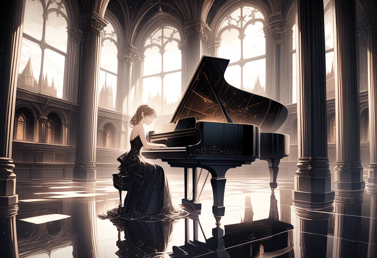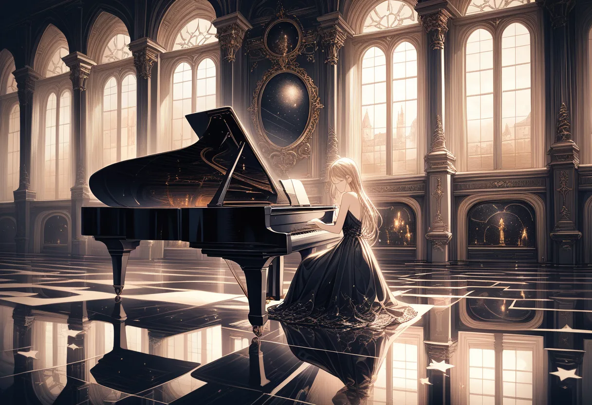 "This melody gently envelops the silence of the night," she murmurs calmly, a blonde girl in a black dress. In a luxurious hall, she glides her fingers over the piano keys, playing a fantastical tune that reflects her cool and introspective personality.