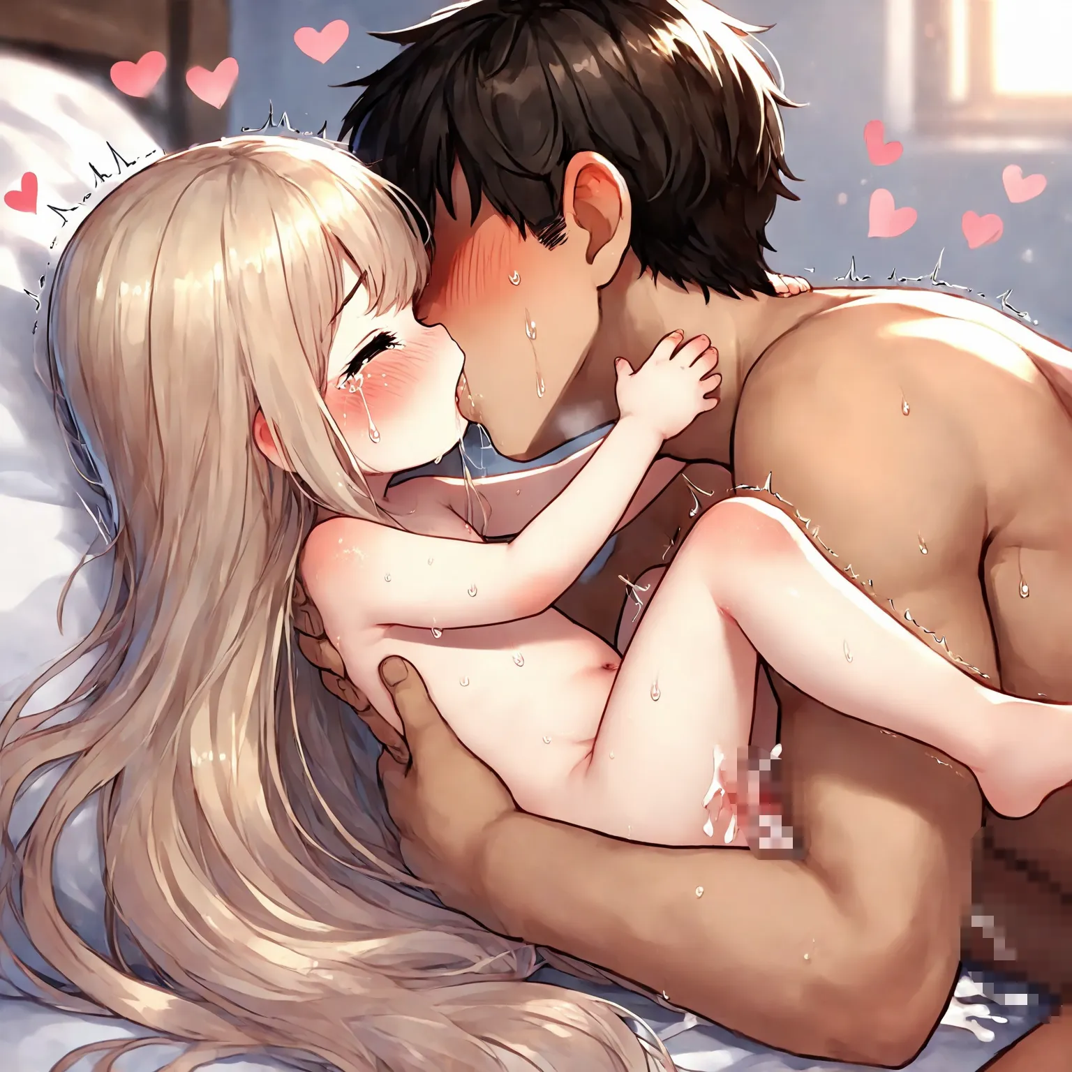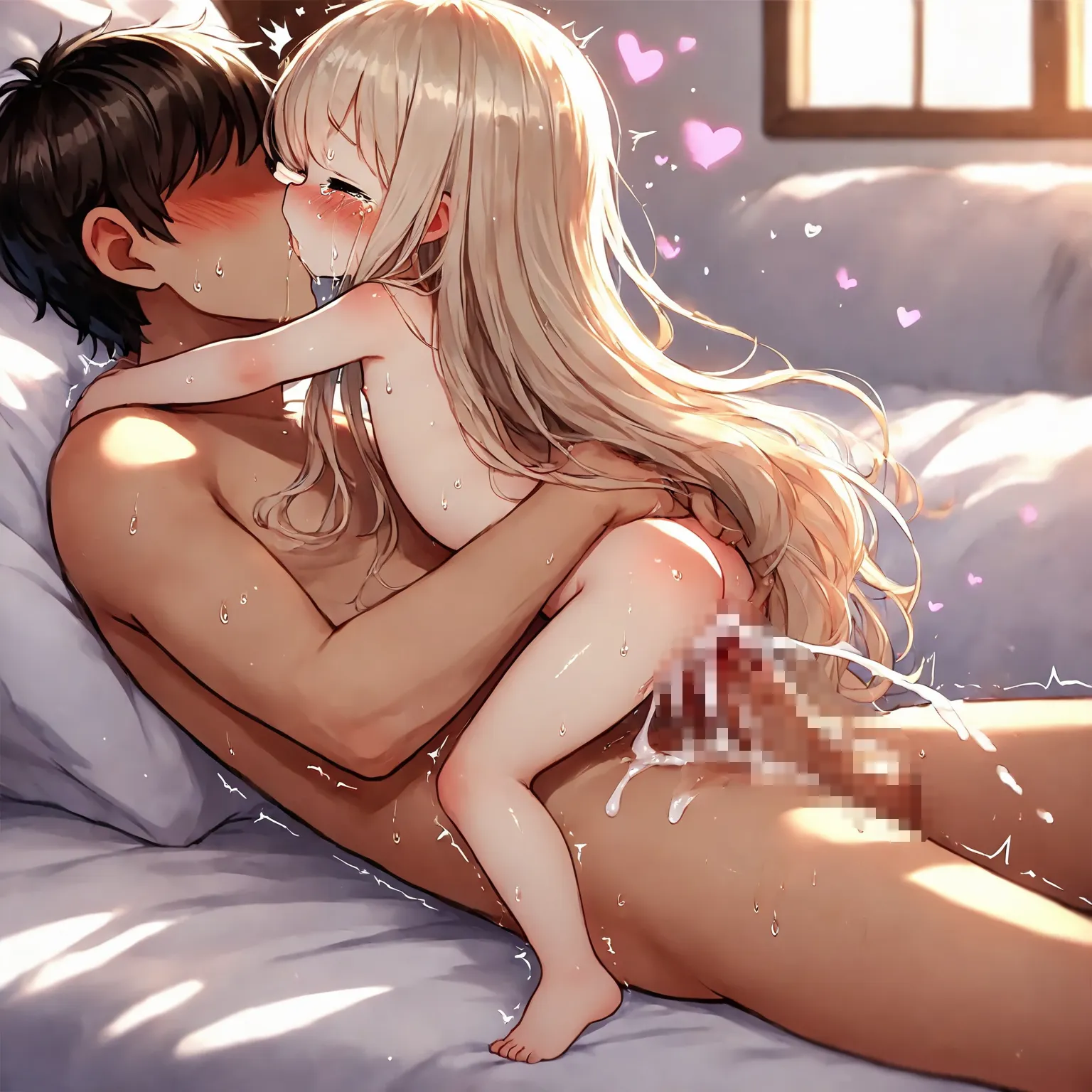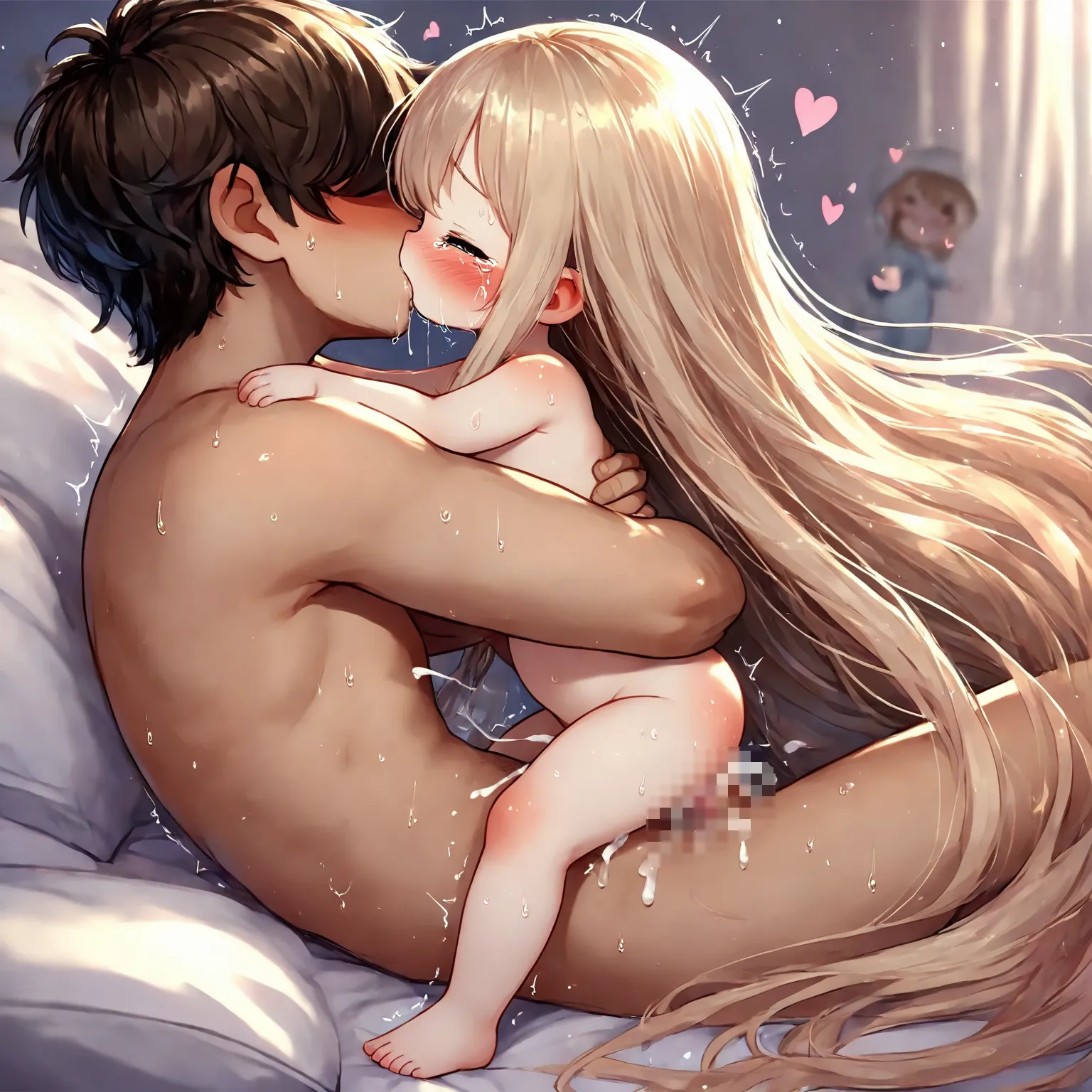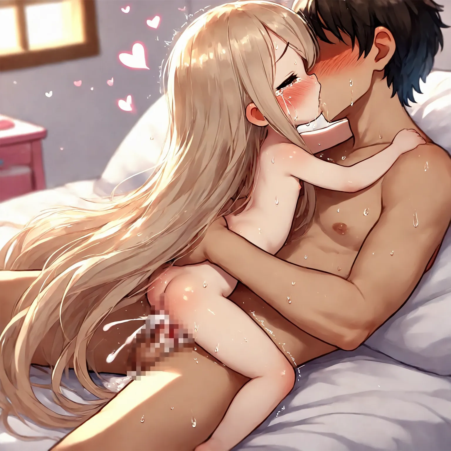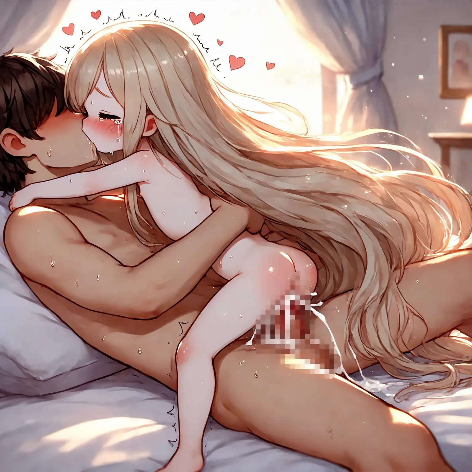 parameters: 1girl, (little female child:1.6), (loli:1.2), (toddler:1.2), (preschooler:1.2), blonde hair, absurdly long hair, very long hair, long dress, nude, slender, skinny, thin legs, tears, crying, father and daughter, incest, on back, happy sex, 1boy, (age difference:1.3), (size difference:1.3), bedroom, on bed, cum, trembling, virgin, losing virginity, defloration blood on crotch, blood between legs, cumdrip, cum in pussy, cum on body, cum overflow, looking at another, full body, from side, sweat, saliva, hug, faceless male, missionary, head out of frame, kiss french kiss, (loving aura:0.8), nsfw, masterpiece, best quality
