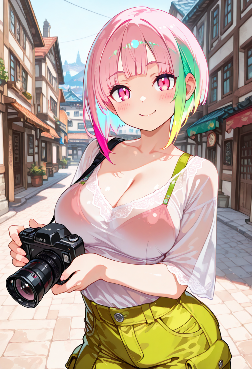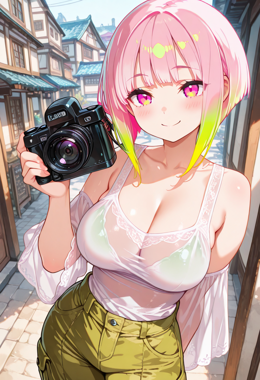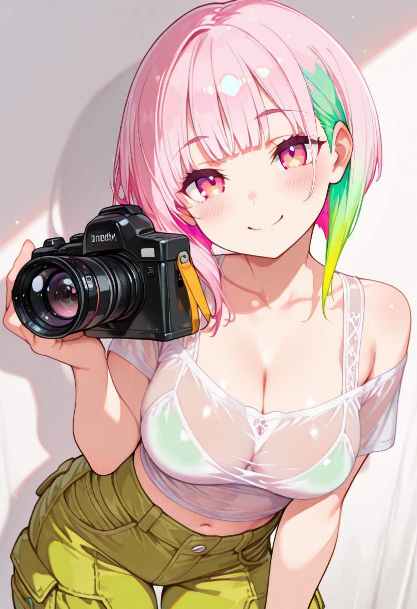 {{pink hair}} , {{green dip-dye hair}} ,cleavage ,cowboy shot ,jogger pants, see-through top, pink eyes , bobcut , {{temptation}} ,from front , holding film camera, {{{{{film camera}}}}} <lora:hairdetailer:1>